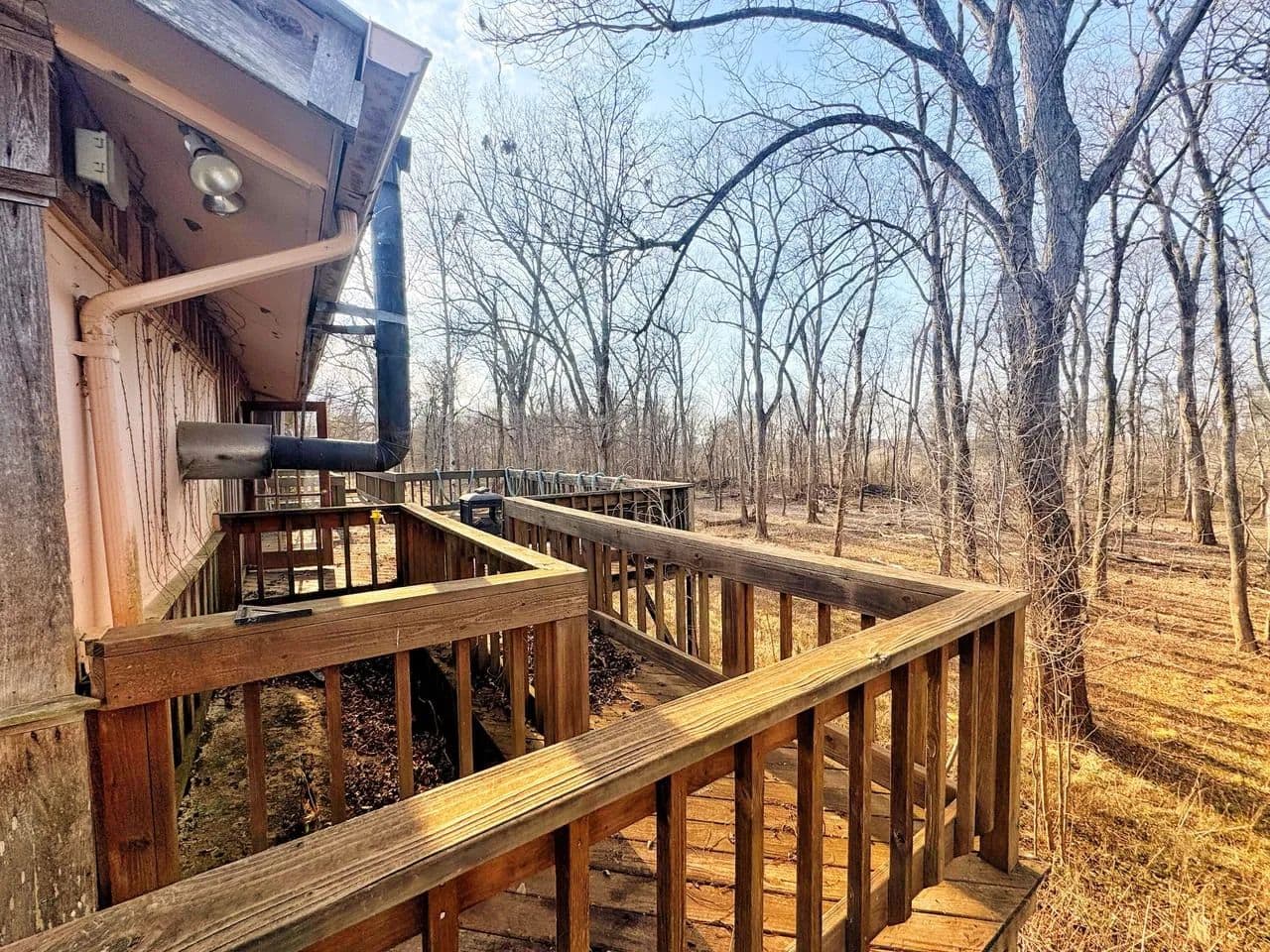 Back deck overlooking wooded surroundings with DeSoto Lake beyond it
