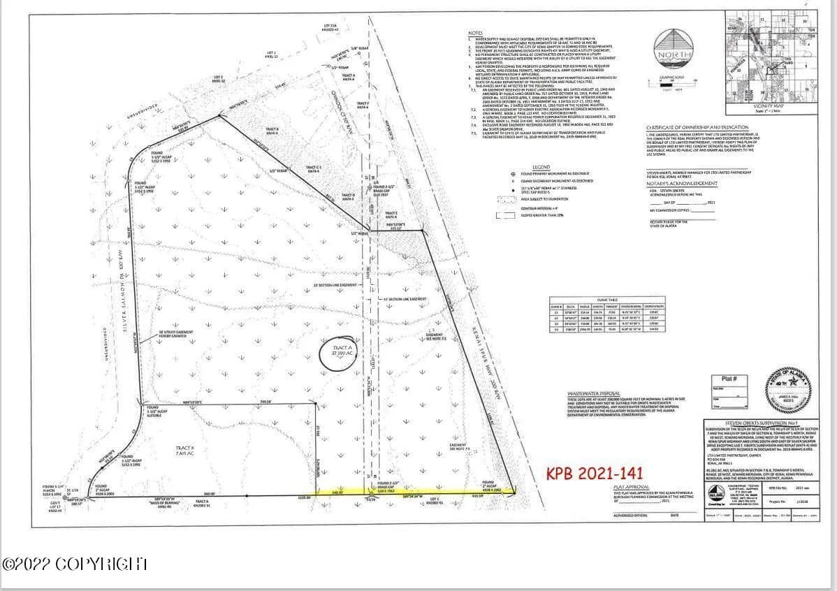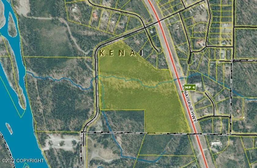 46.40 acres with creek running through property. Located across from the Pillars public boat launch on the Kenai River. No CC&R's. Proposed plat in documents. Satellite photo is estimated lot lines