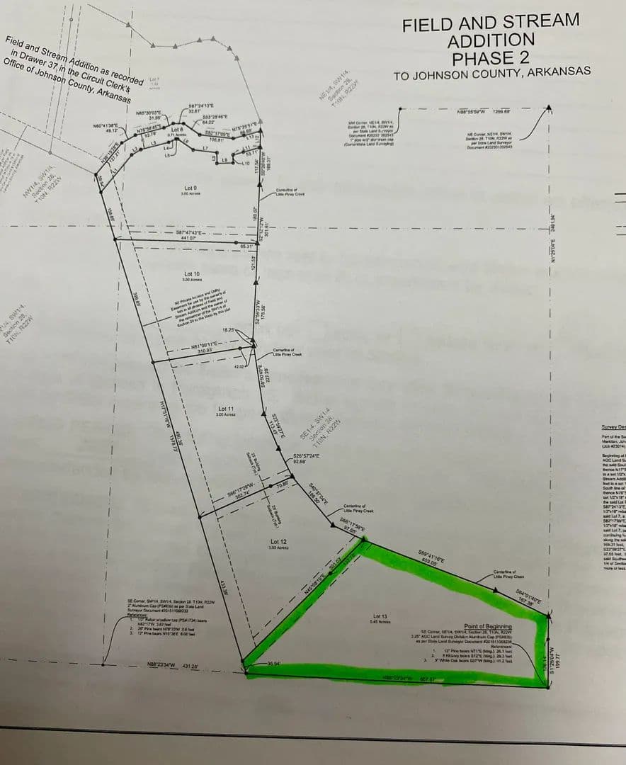 This stunning 5.45-acre tract offers 570 feet of frontage on the clear, scenic Little Piney Creek, with breathtaking views of the water and distant mountains from its elevated position. Enjoy spectacular swimming areas and direct walking access to the creek—ranging from semi-steep to moderate slope. Privacy is a key feature, with a coded automated entry gate and deeded utility and access easements already in place. Electric is approximately 1,550 feet from the property, and a well will be required. A recent survey is completed, and the land features several excellent building sites, offering flexibility for your dream home, cabin, or retreat. Most of the land remains in its natural, untouched state, with a small area cleared and ready to begin your vision. Opportunities like this with elevated views and private creek access are rare—don’t miss your chance to own a piece of Little Piney!