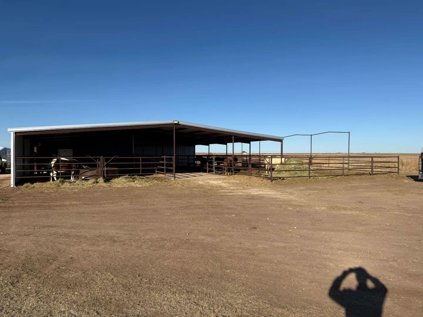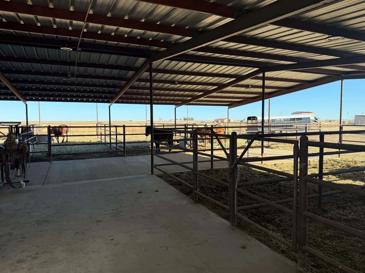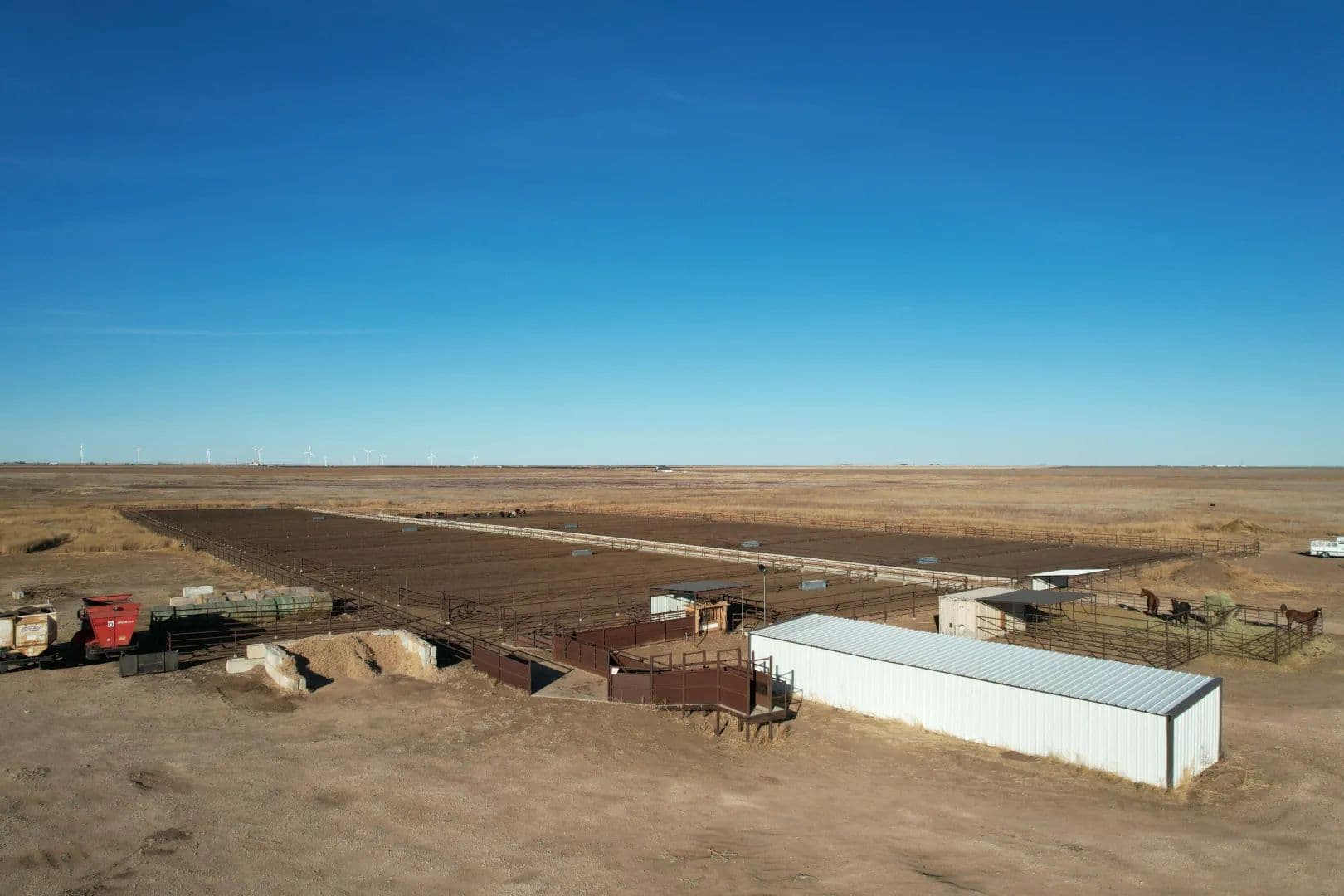 Feedyard: 1,230’+/- of total bunk at the feedyard. All bunk is concrete with feed aprons. There are a total of 14 pens of which sizes vary. The hydraulic chute at the processing area is shaded. Other improvements include a machinery shed, single chute truck load out, shipping container with power which serves as a medicine room, and three horse runs with loafing sheds.