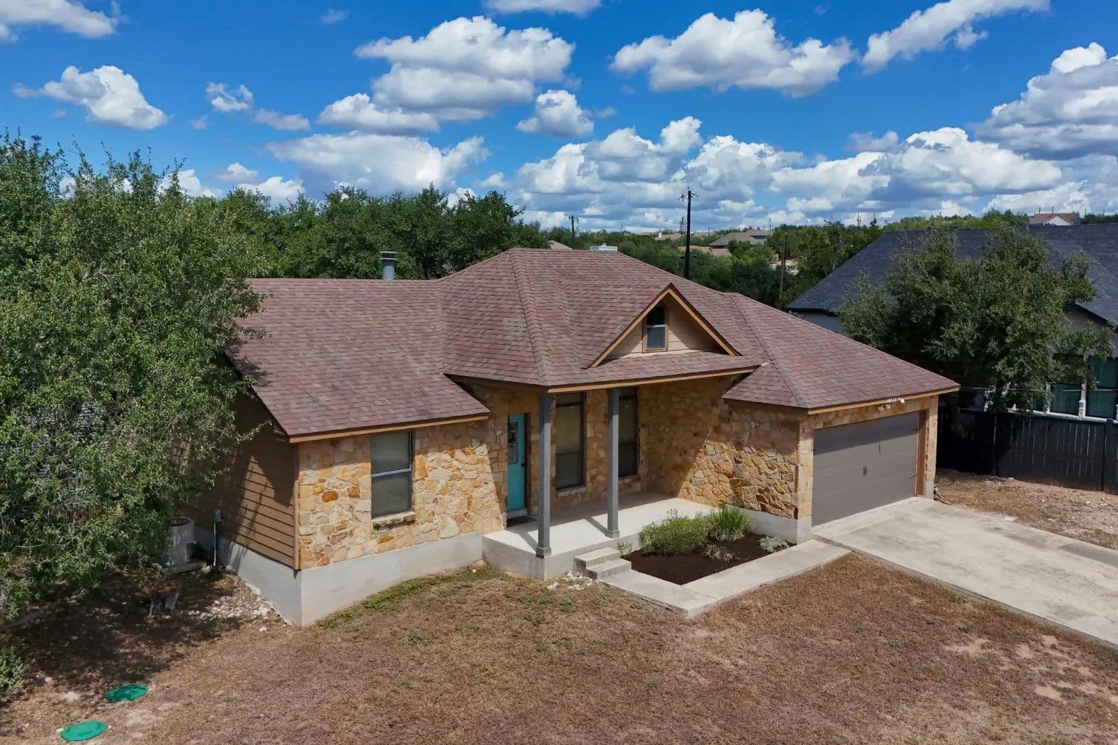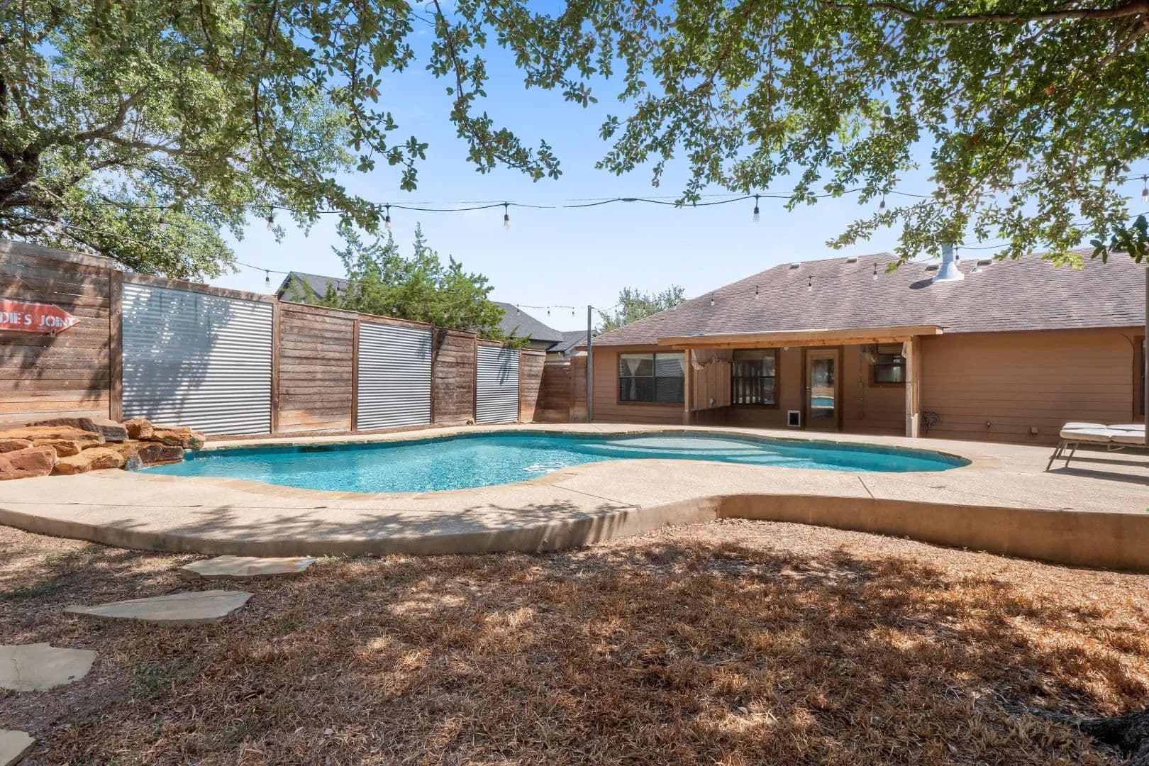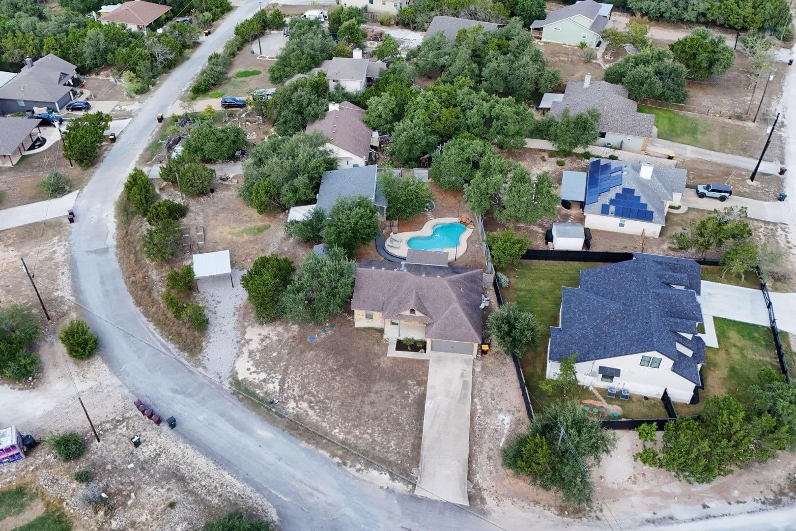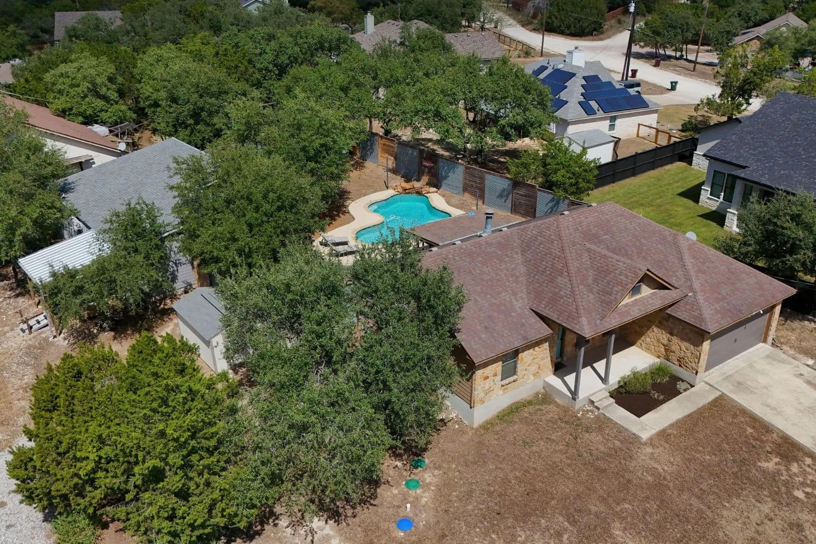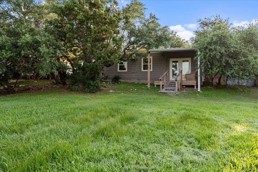 Lender paid rate buy-down to 4.99% first 2 yrs!! An idyllic home situated in the highly sought-after community of Deer Creek Ranch has so many beautiful things to offer! Many trees adorn this property. Nestled on a spacious double .44 acre lot and located towards the back of the neighborhood. When you walk up, you have a charming front porch. Perfect for watching the sunrise with your favorite cup of coffee. This home features three bedrooms, two bathrooms, and 1,239 square feet of spacious living space. Your living room has high ceilings and stained concrete floors. The focal point is the wood-burning fireplace. It features floor-to-ceiling stone and a rustic mantle. Perfect for curling up with a good book. Your living room opens up seamlessly into your kitchen. Your kitchen features granite countertops, a peninsula-style breakfast bar, and a breakfast area. Your spacious primary is perfect for unwinding & relaxing. Your ensuite features an extended double vanity, a large walk-in shower with a seat, & WIC. Your second bedrooms are generously sized. Your secondary bathroom features a single vanity and a tub/shower combination. Venture to the backyard. You have a large covered patio. The highlight of this property is the pool, which features a waterfall. Imagine taking a cool plunge on a hot summer day. The main house has a water filtration system, stained concrete, and wood floors. NO CARPET! . You also have an income-producing guest house, which features 975 square feet, a spacious kitchen, a living area, one bedroom, one bathroom with laundry, a covered patio, a carport, and is privately fenced. It features a walk-through gate to the pool, currently rented for $1,500 per month (includes water, septic & mowing). This home is situated in the highly sought-after area of the Lake Travis acclaimed school district. Great location, playground, community lake, low tax rate, close to main roads, restaurants, shopping, Hill Country Galleria, and so much more.