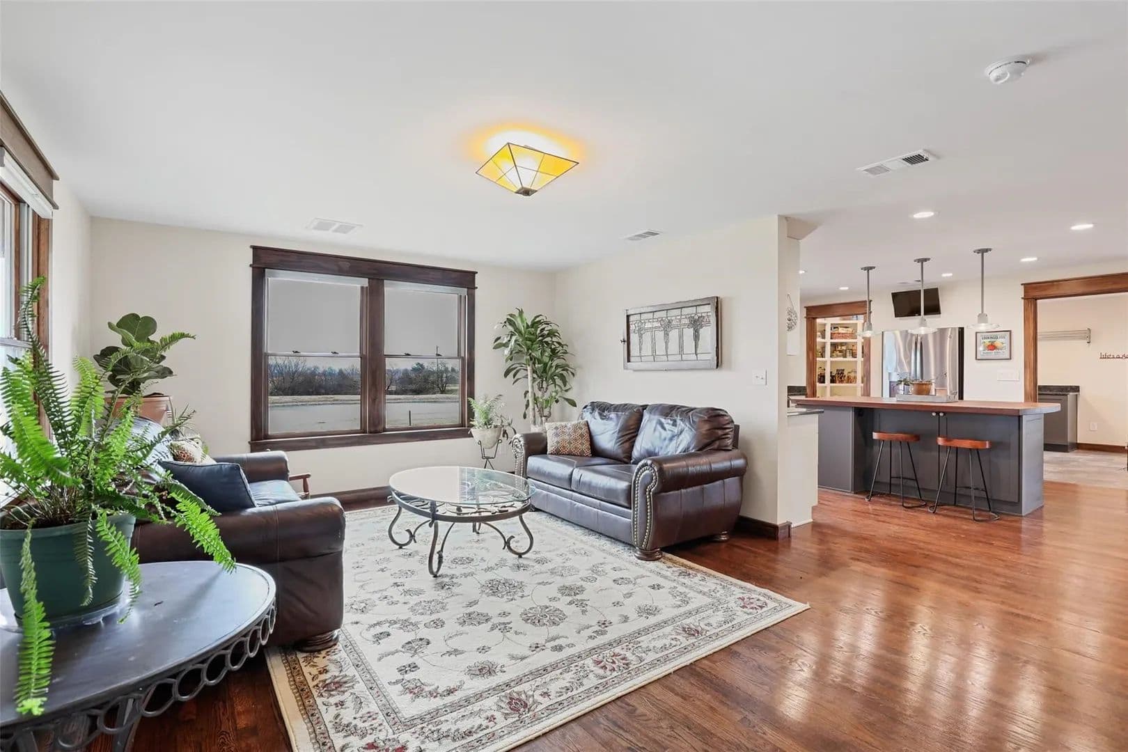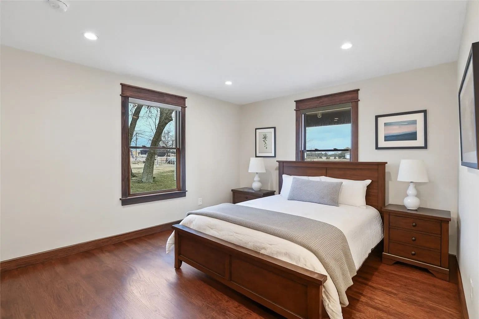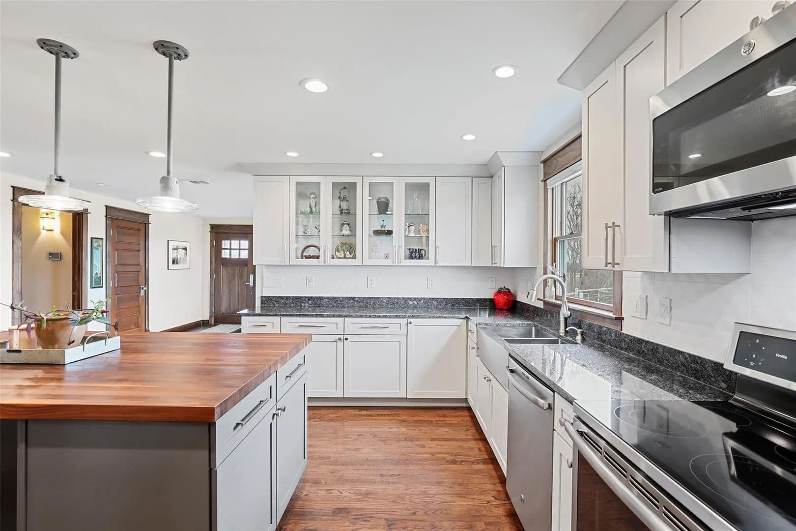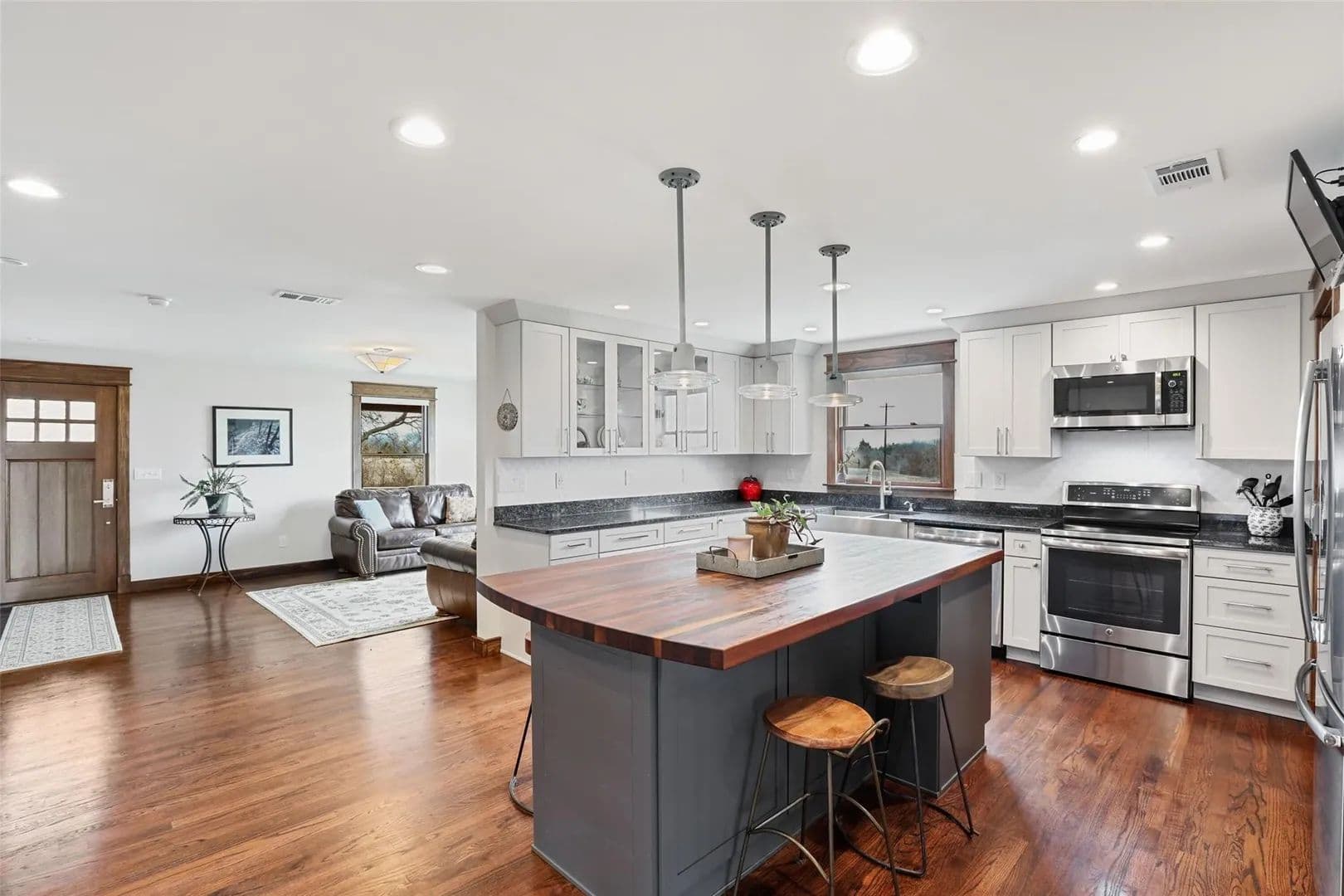 The custom farmhouse was completely rebuilt in 2019 with timeless style and modern efficiency. Inside, you’ll find an open layout with oak floors, LED lighting, and handcrafted details throughout. The kitchen shines with solid maple cabinetry, granite countertops, a large island, and farmhouse sink. The primary suite offers a spa-inspired bath with radiant heated floors, air jet tub, oversized glass shower, and a spacious walk-in closet.
