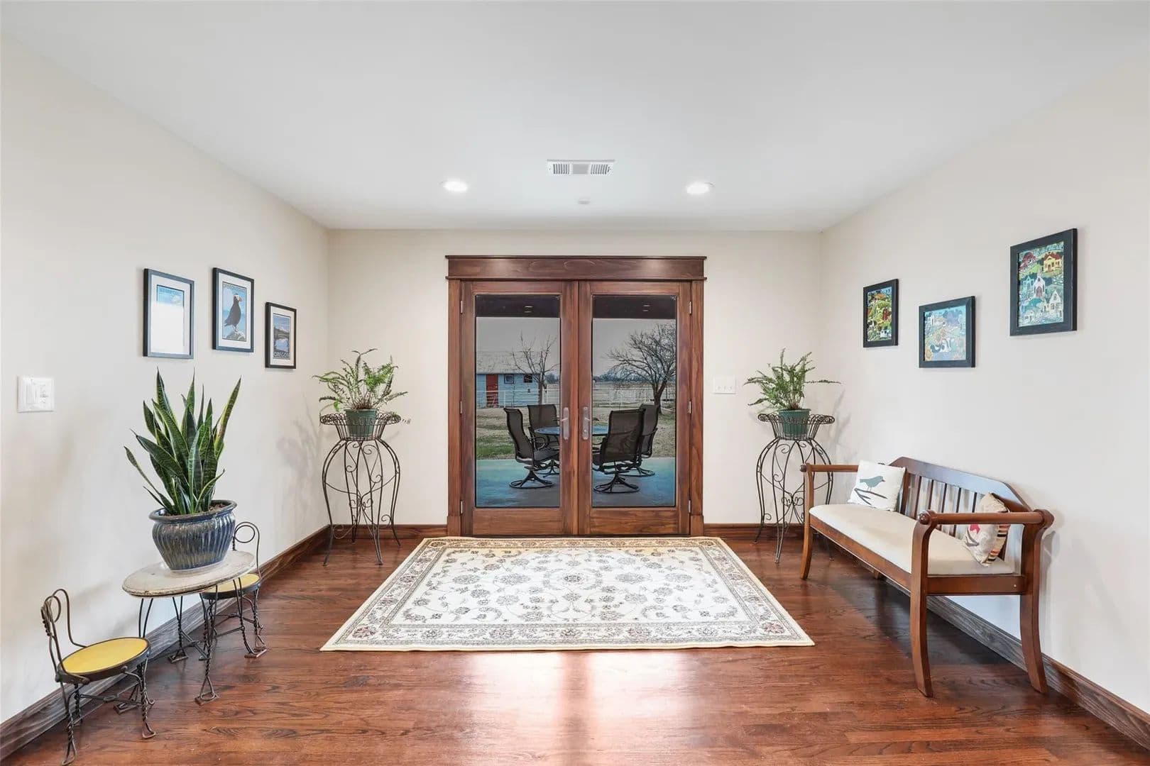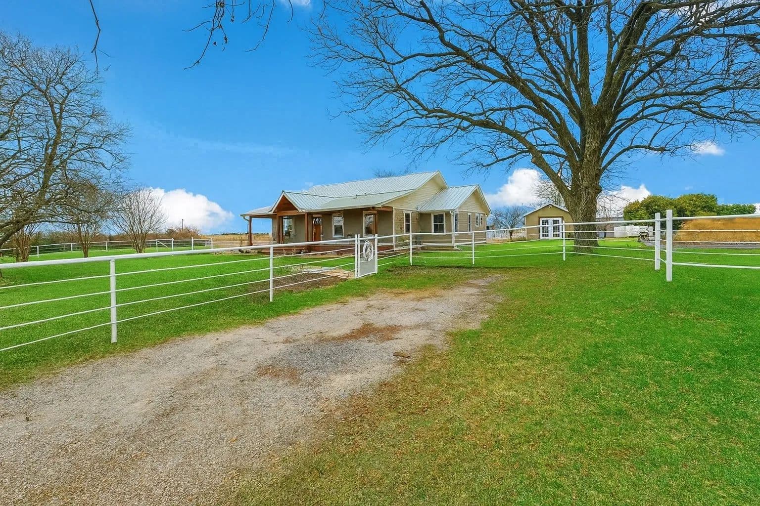 Experience peaceful country living on this beautifully appointed 12-acre ag-exempt ranch. Set among mature oaks and open pastures, this property offers a stocked pond, orchard, irrigated garden, barn with water and electricity, large equipment shed, carports, storm shelter, and pipe fencing with cross-fenced pastures for horses or cattle.