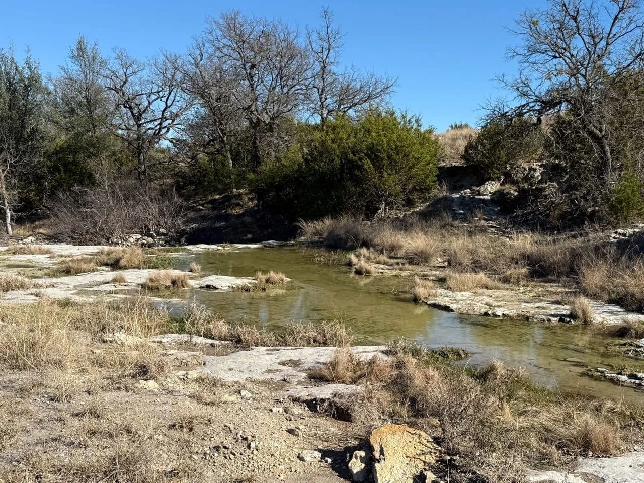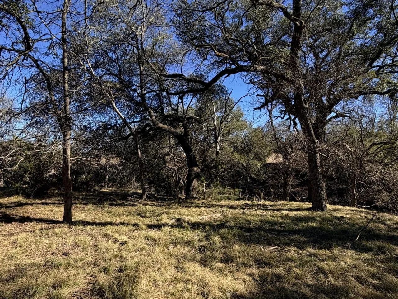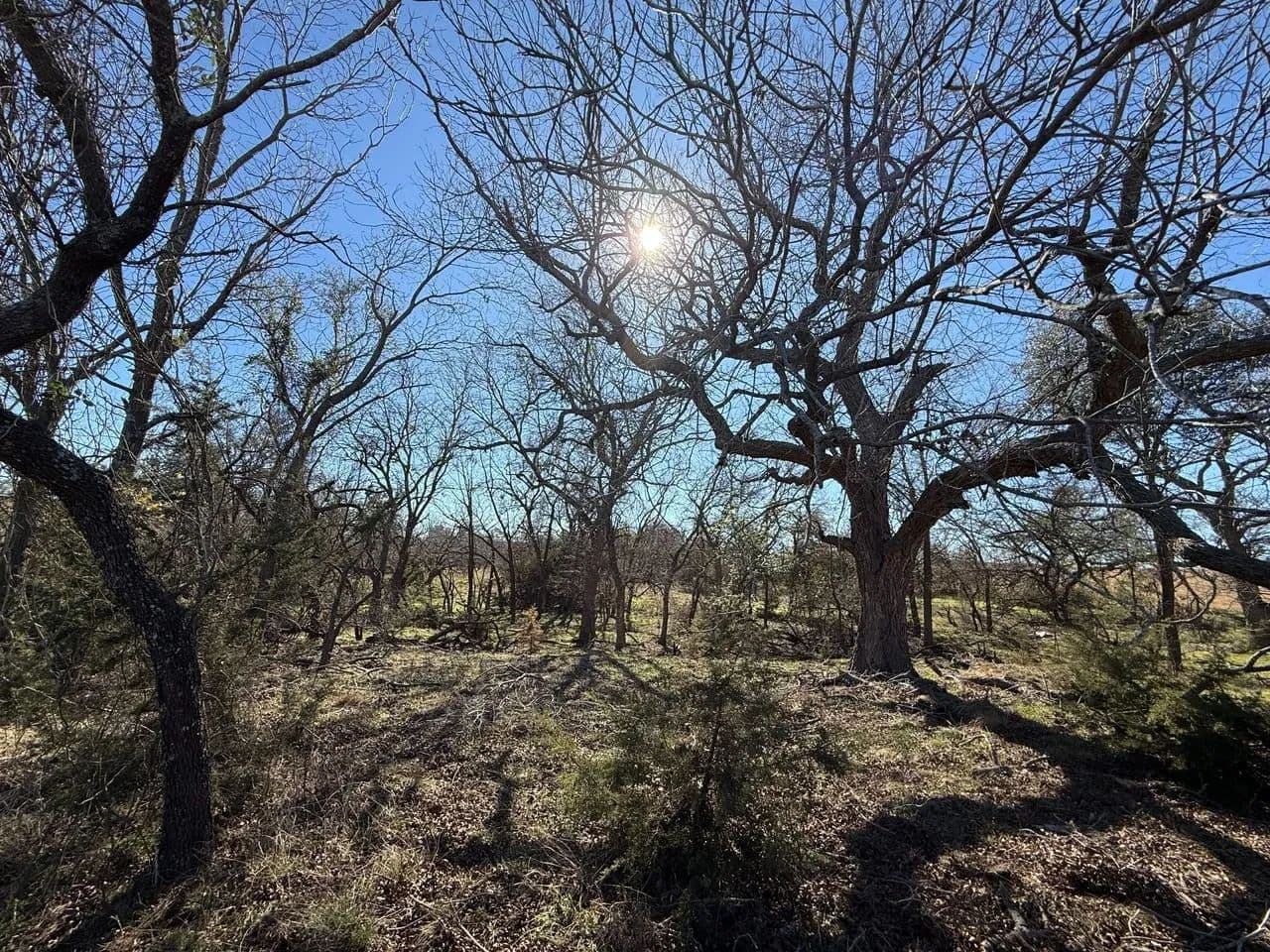 The south tract of approximately 350 acres is where the recreation gets done! Almost a mile of spring-fed creek bisects the land with a couple of limestone overhang crossings are viewed. These are ideal for wading and taking pictures at when we've had decent rain amounts. Dense oak cover offers deer and turkey hide out spots and are often seen and seldom hunted. Pecan trees along the creeks are frequented by turkey, hogs, and squirrels for game. The views from the hilltop are awesome! There is a set of pipe corrals and pens at the road for easy working and loading of cattle. There is also a water well and holding tank.
