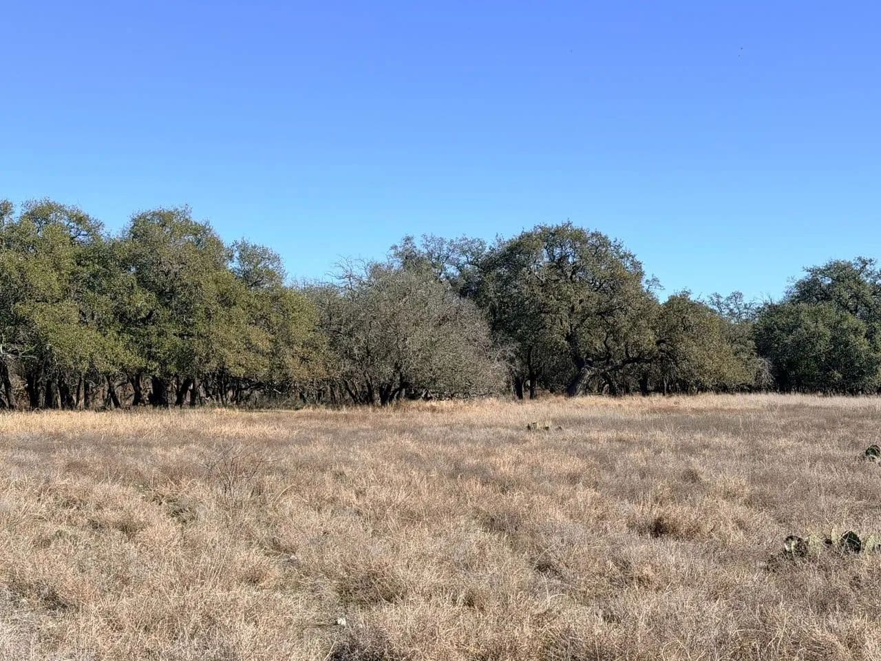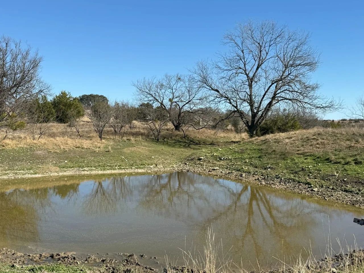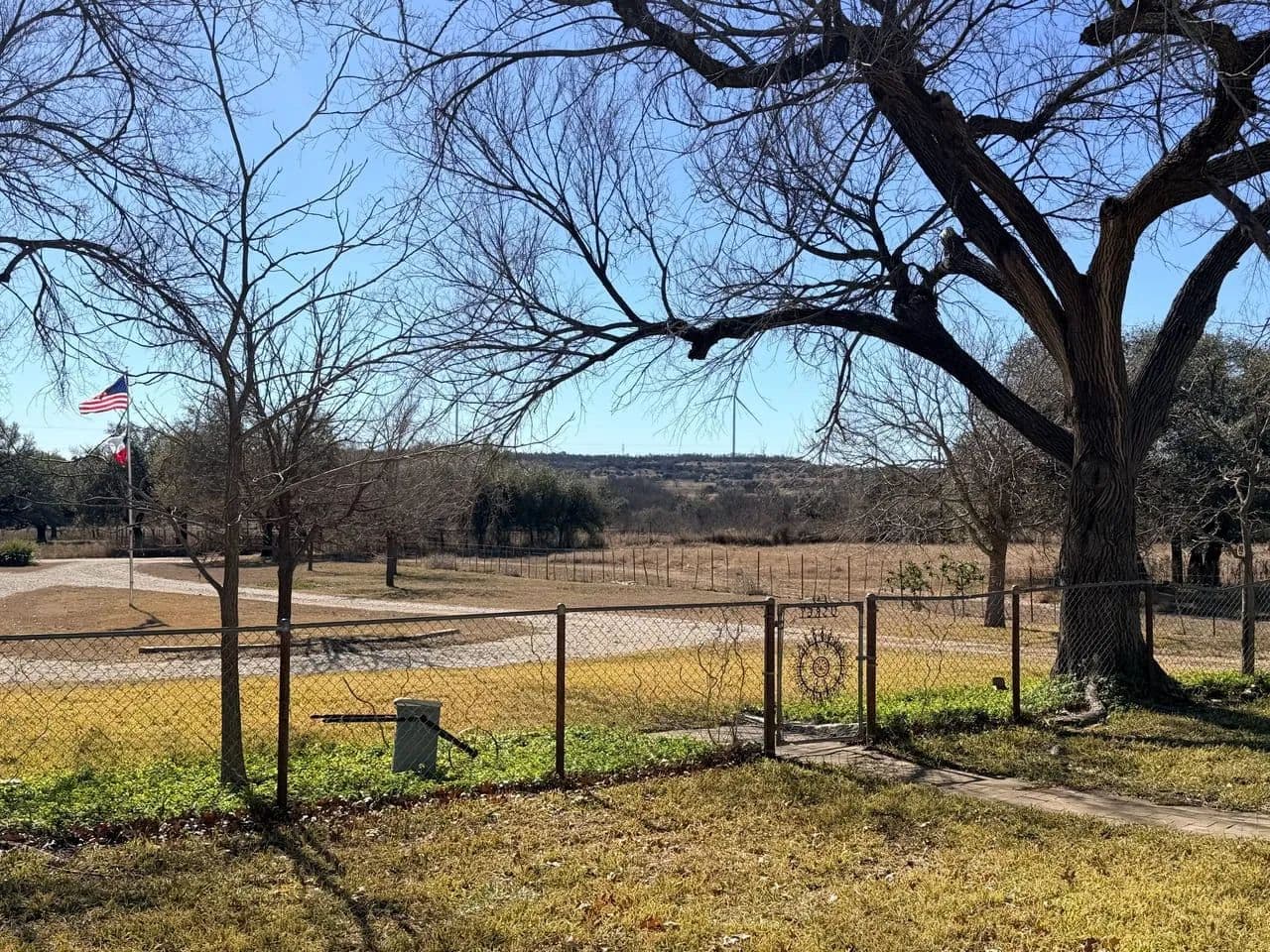 The south tract of approximately 350 acres is where the recreation gets done! Almost a mile of spring-fed creek bisects the land with a couple of limestone overhang crossings are viewed. These are ideal for wading and taking pictures at when we've had decent rain amounts. Dense oak cover offers deer and turkey hide out spots and are often seen and seldom hunted. Pecan trees along the creeks are frequented by turkey, hogs, and squirrels for game. The views from the hilltop are awesome! There is a set of pipe corrals and pens at the road for easy working and loading of cattle. There is also a water well and holding tank.