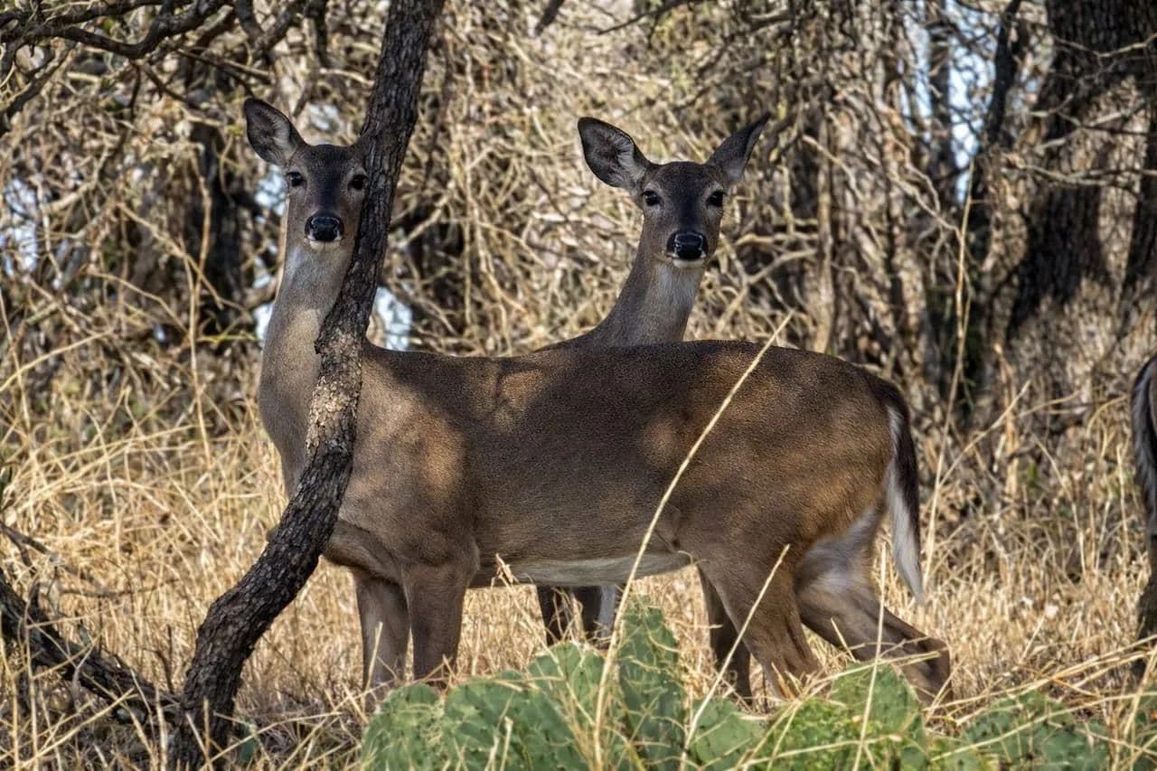 There is a sizeable hay meadow fenced out, and a group of Liveoak trees where deer rest during the day and are viewable most of the time. An axis doe hangs out with the white-tail herd.