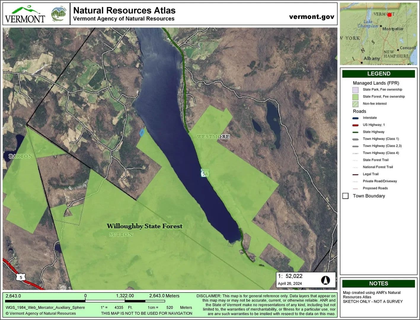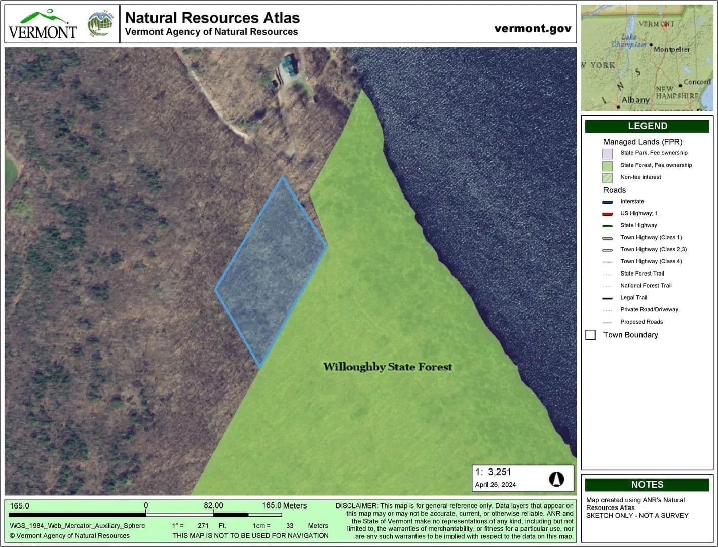 If you are looking for a building lot in the heart of the recreational zone of the NEK, you may have found it. This lot directly adjoins the Willoughby State Forest which is comprised of 7682 Acres open to hiking, snowshoeing, back country skiing, rock climbing and more. The State Forest also controls about 3 miles of shoreline on the south western side of the lake so this also affords you lake access without waterfront taxes! The building site has been cleared and a driveway installed to the building site. The sale includes the state approved 3 bedroom septic installed, power run to the lot and a private drilled well. This lot is the last private lot before the state forest so the only homes you should have beyond you will be for your furry wildlife friends! Enjoy seasonal lake views from the site and great views of Bald and Goodwin Mountain. Willoughby Lake is over 1700 acres and over 330' deep. While photos might be stunning, there is nothing like seeing it in person from the North or South Beach. If you like an adventure you can get a top down view from hiking Pisgah, Hor, Wheeler or Bald Mountain! Bring your building plans and make your dream come true on this one of a kind lot!