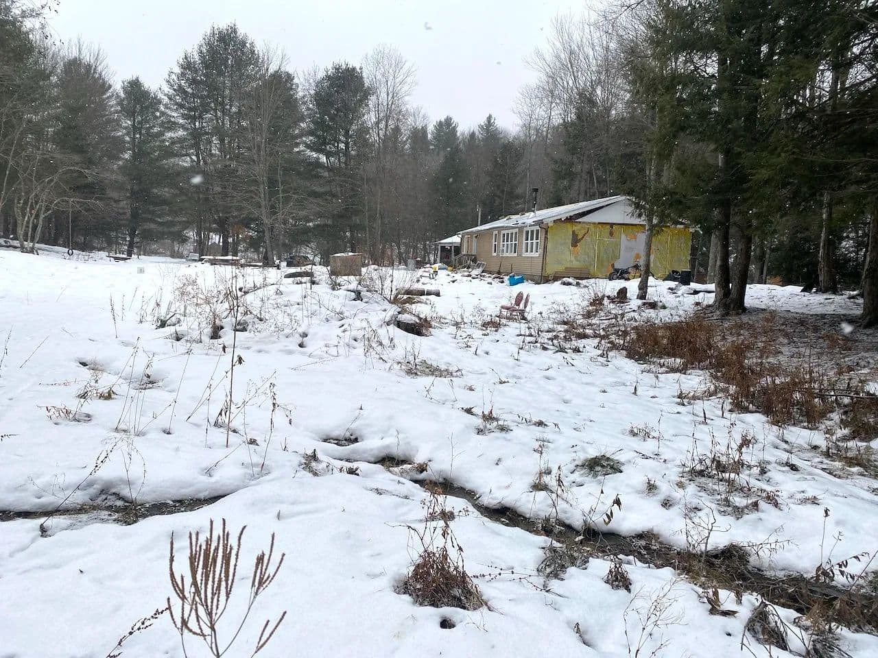 Surrounding the home is a mix of hardwoods and pine trees, along with a small meadow suitable for a food plot. Wildlife activity is present throughout making this a great property for hunting and outdoor use. The home and property are being sold as-is. Surface rights convey. The sale is cash only.