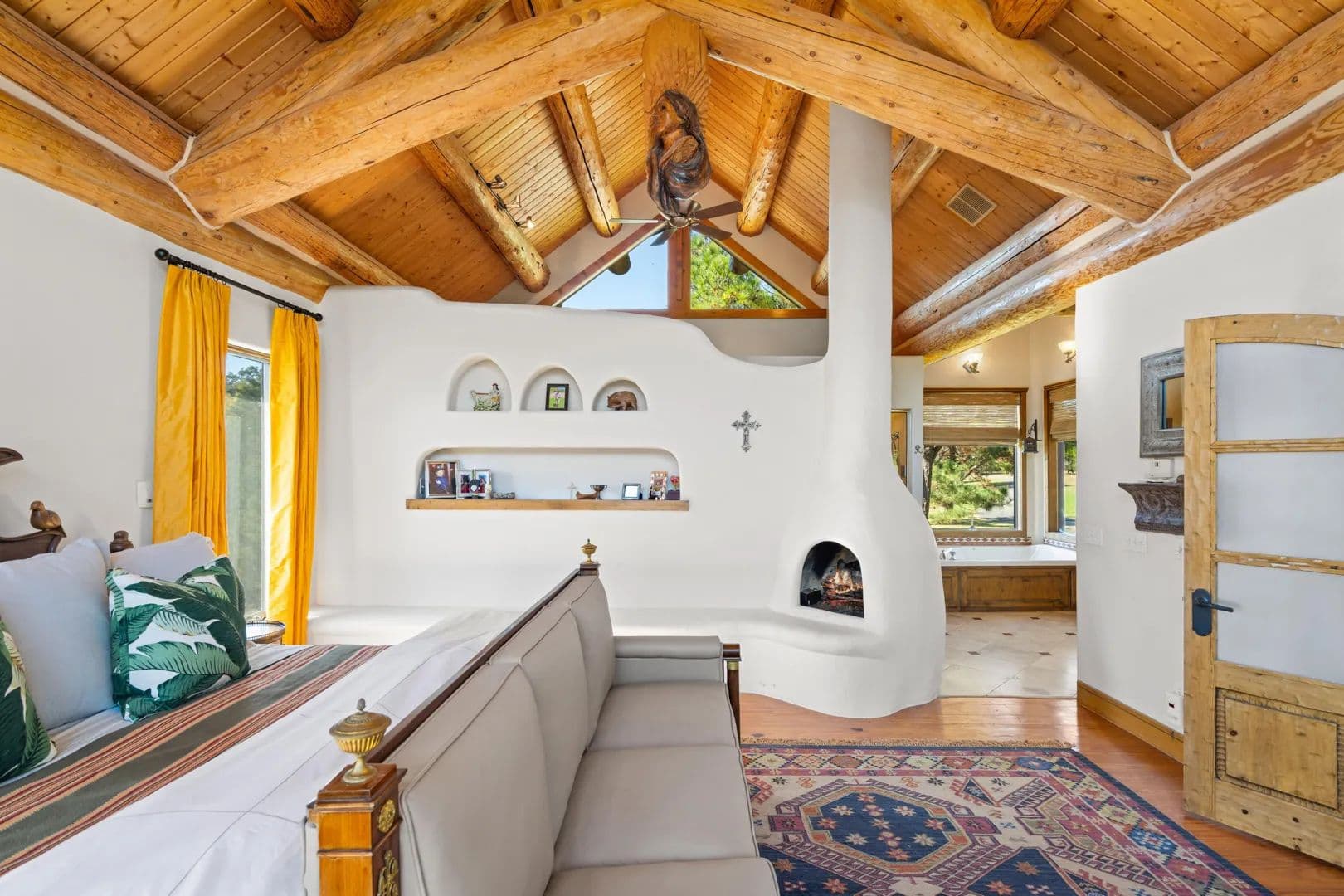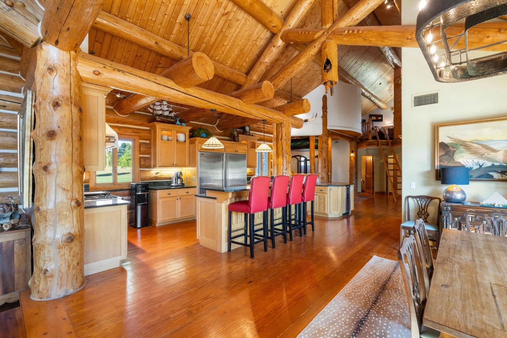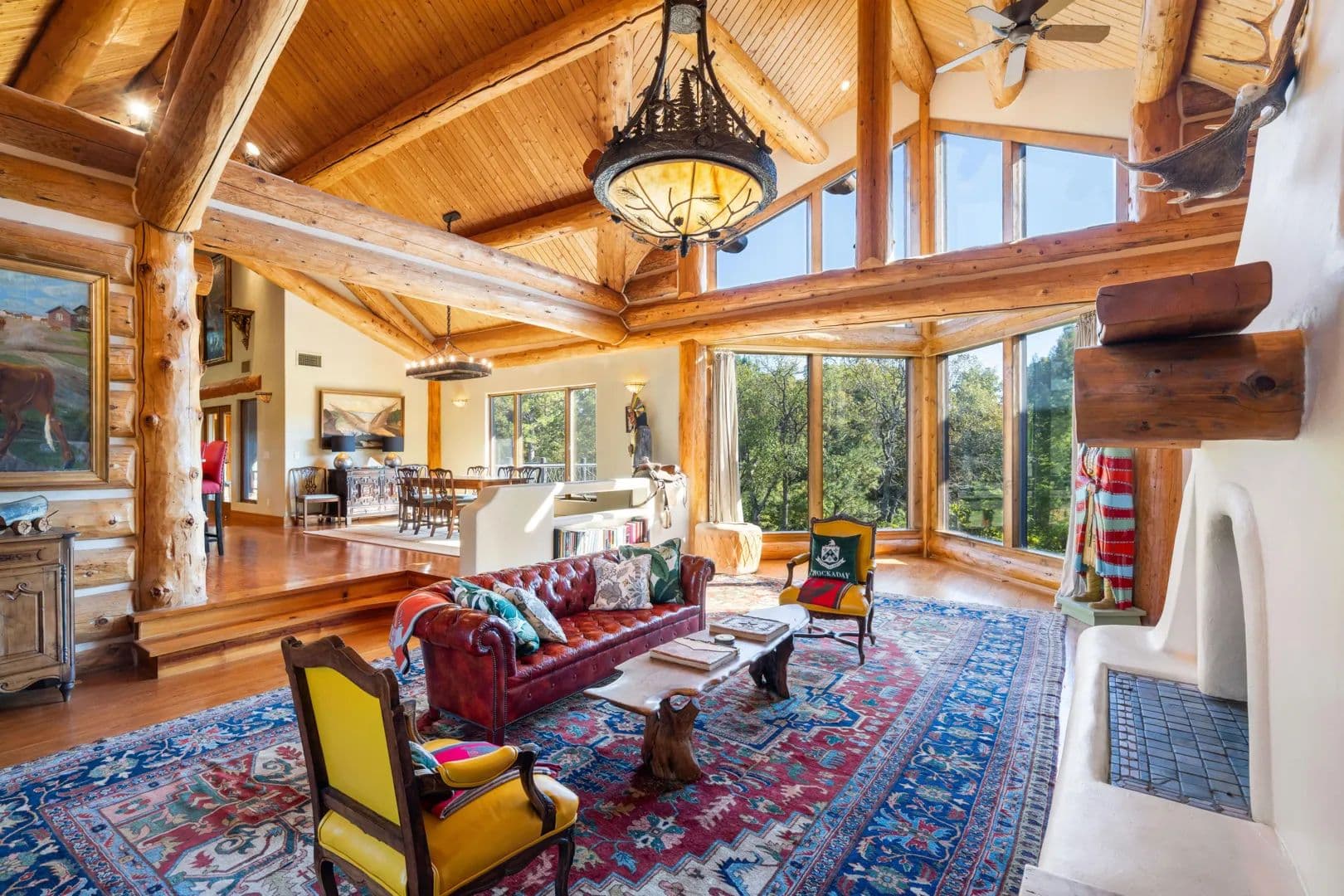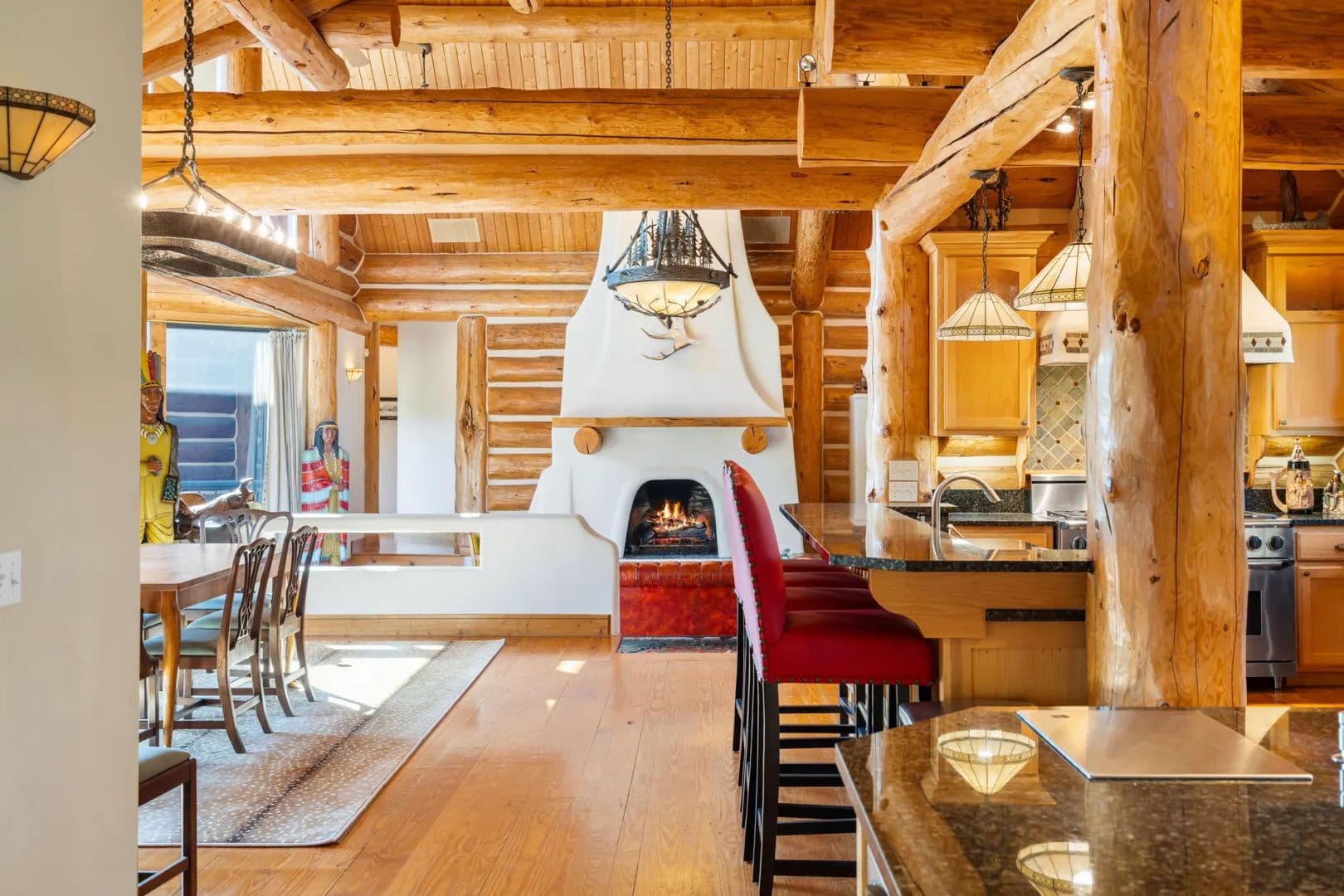 Crafted from massive hand-peeled logs, native stone, and sculpted plaster, the residence blends Western lodge architecture with Southwestern artistry: