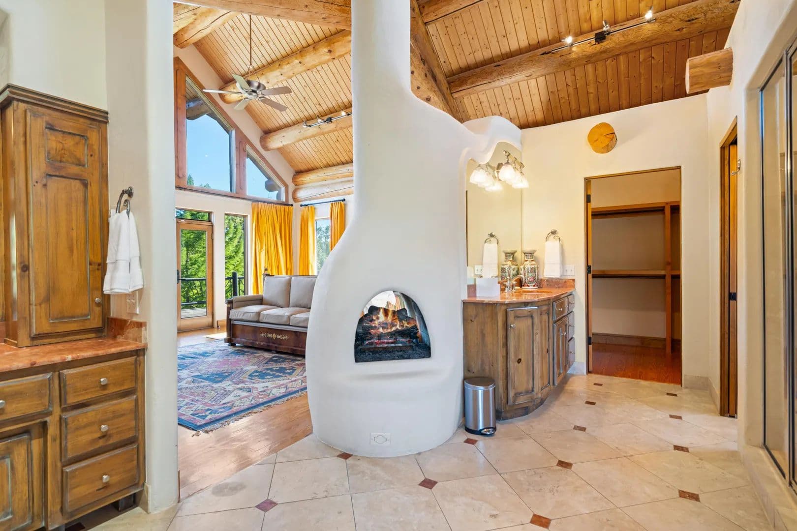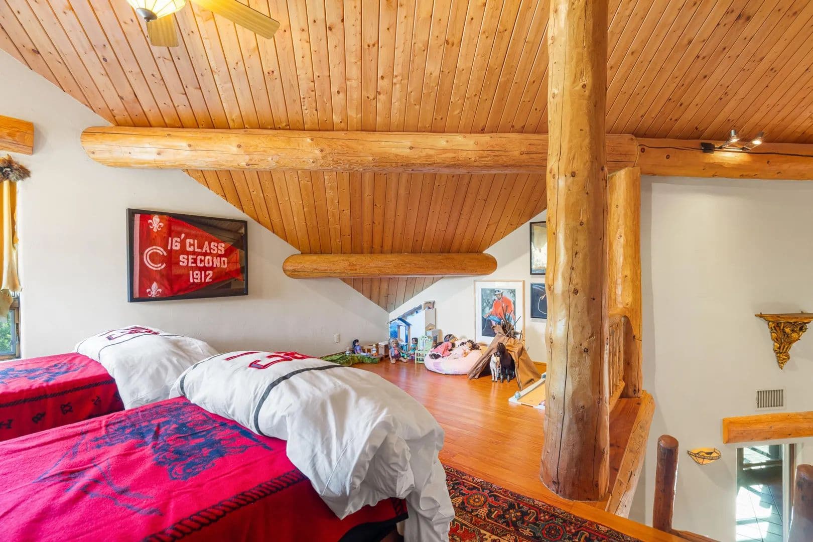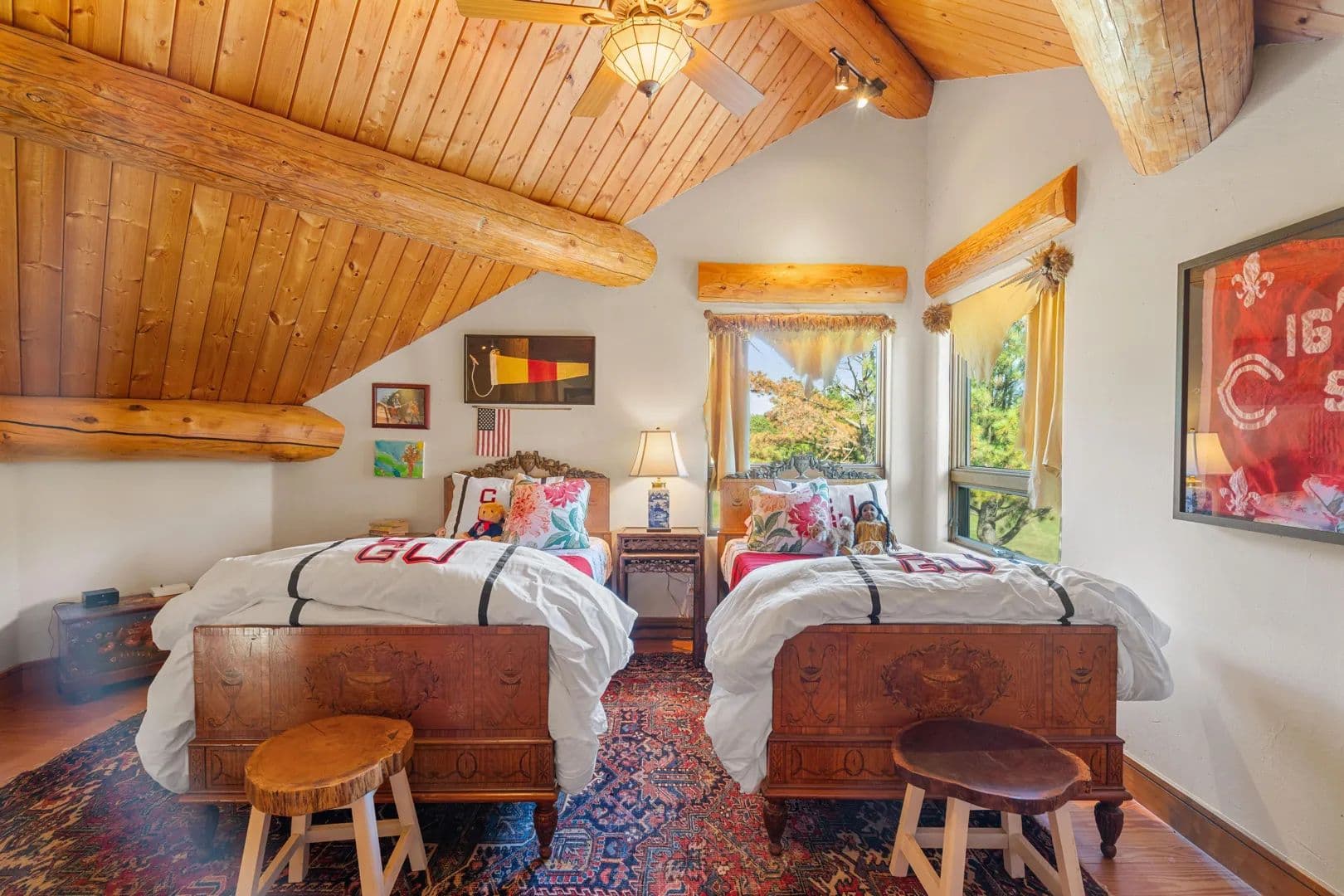 Crafted from massive hand-peeled logs, native stone, and sculpted plaster, the residence blends Western lodge architecture with Southwestern artistry: