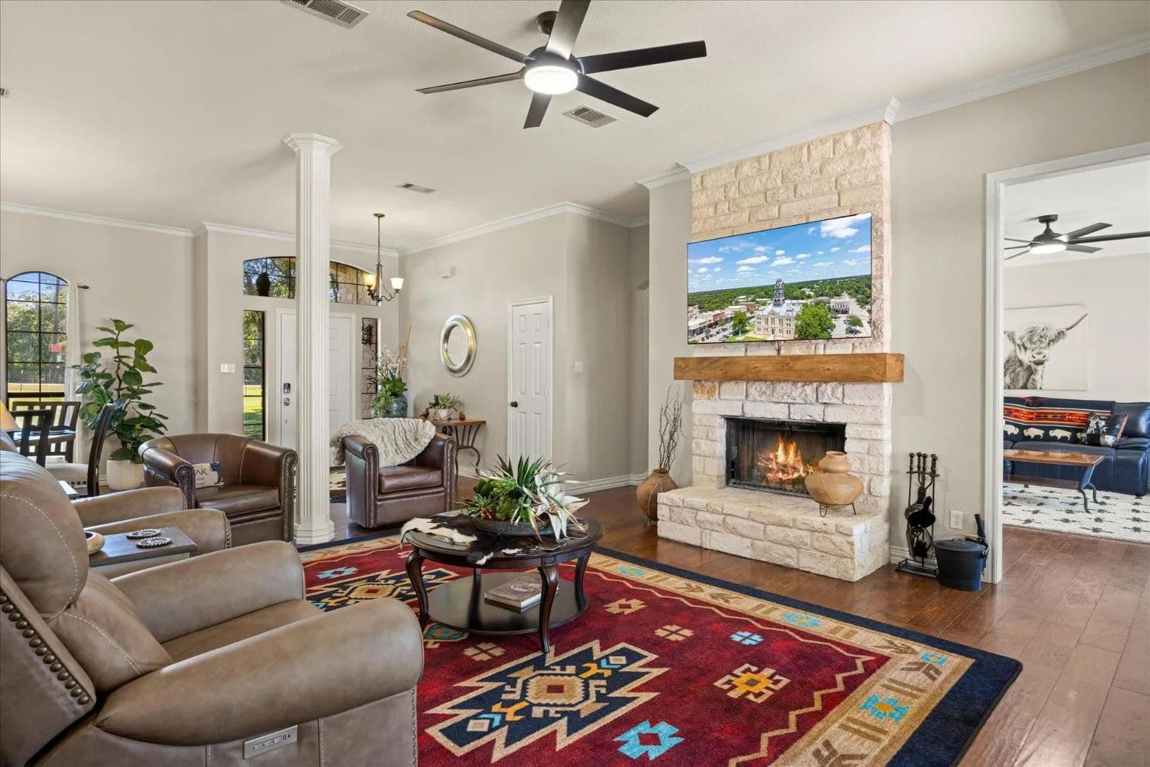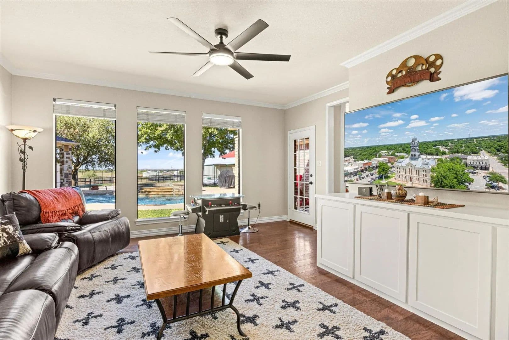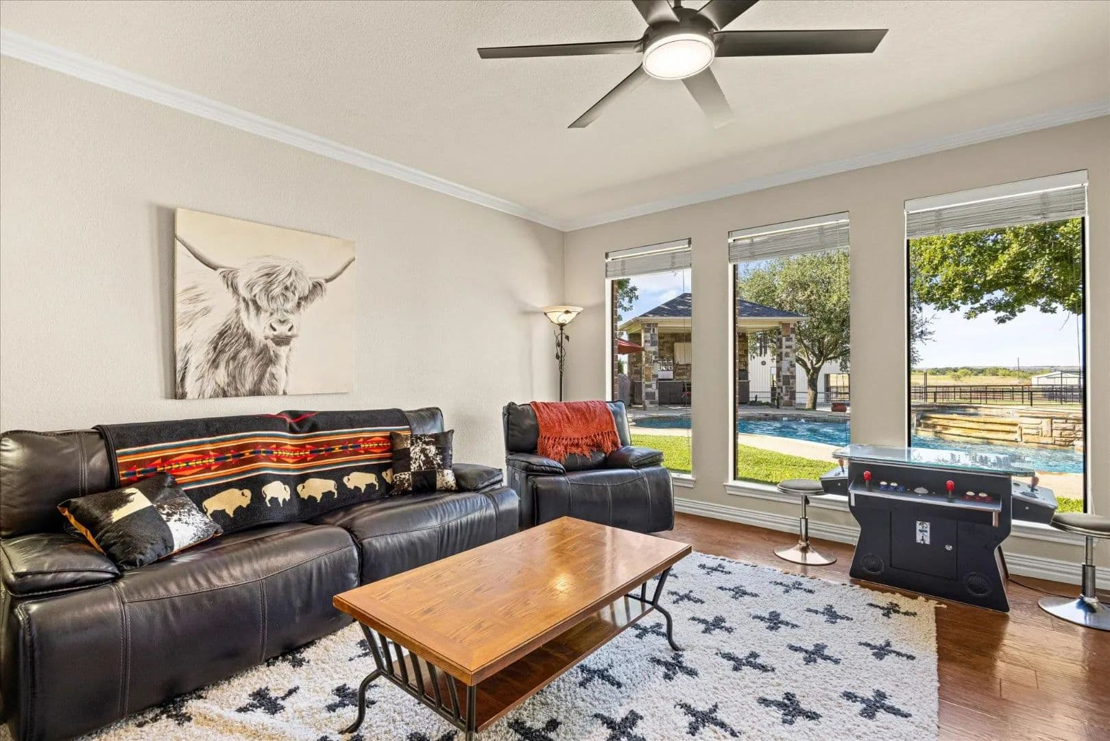 Welcome to 5444 Meadow Ridge Drive, a horse enthusiast’s dream on 9.98 acres with beautiful trees, a stocked pond with bass and catfish, and cross-fenced coastal pastures for horses and cattle. Designed for both comfort and function, this property makes daily living and livestock care easy and enjoyable. At the heart of it all is a spacious 4-bedroom, 3.5-bath home with a split-bedroom layout, two living areas, an open dining space, and a breakfast nook off the kitchen. The main living area features a stone fireplace, while the second offers large windows overlooking the pool—perfect for watching the game, hosting guests, or using as a game room. The versatile 4th bedroom is currently used as an office. Interior updates include fresh paint, new appliances, updated HVAC, and a whole-house attic fan. Outdoors, enjoy a PebbleTec saltwater pool and spa with LED lighting, rubber-coated decking, and a cabana with TV and Bluetooth speakers. The fire pit sits just beyond, creating the perfect spot to gather under the stars and take in the wide-open views. The 36x50 barn includes three 12x12 stalls, 12’x30’ covered runs, tack room, storage, wash area with tie rack and Priefert stocks, turbo fans, and a fly spray system. Attached is a 24’ covered parking area with 50-amp RV plug. A 20x30 workshop offers lean-tos on each side for covered parking, extra storage, and another 50-amp RV plug. Even more parking is available with the attached 20x25 covered area, ideal for equipment or trailers. Working pens, squeeze chute, 150’x180’ panel arena, and 50’ round pen complete the setup. Three electric gates provide secure access to the home, barns, and pastures. All of this is 10 minutes from Weatherford, 15 minutes to Teskey’s, and 45 minutes to Fort Worth—offering the perfect blend of country charm, functionality, and convenience.