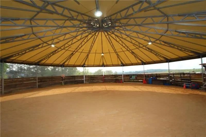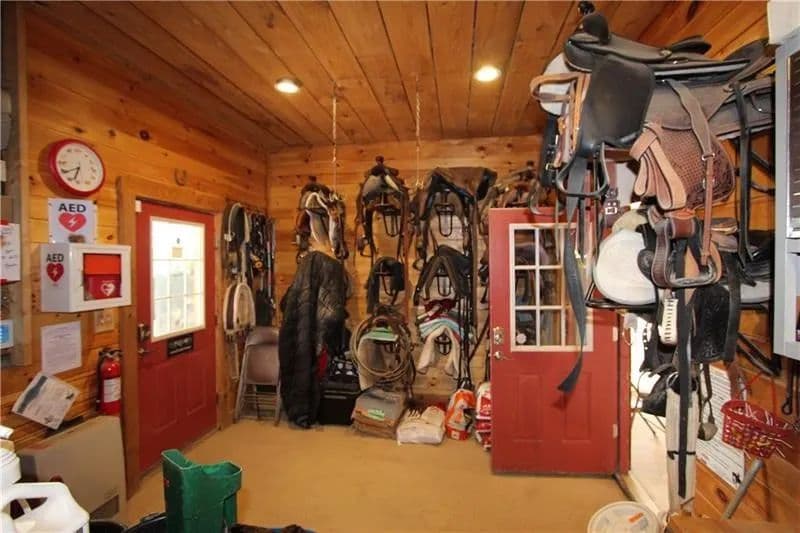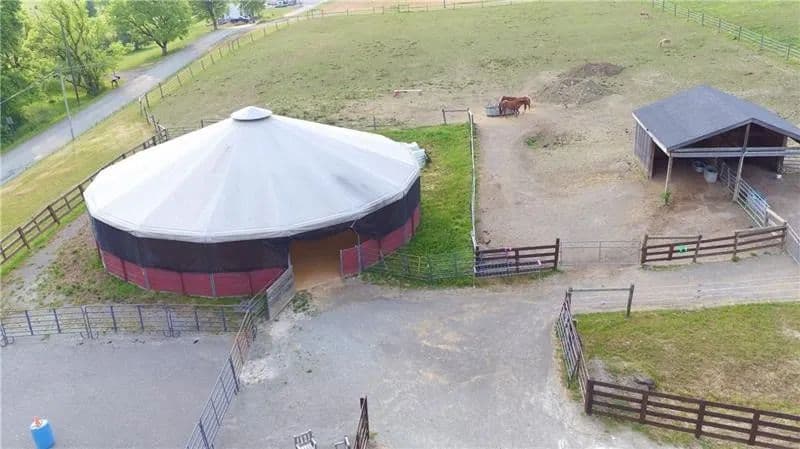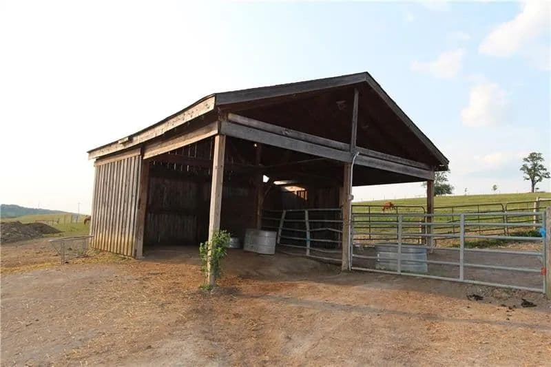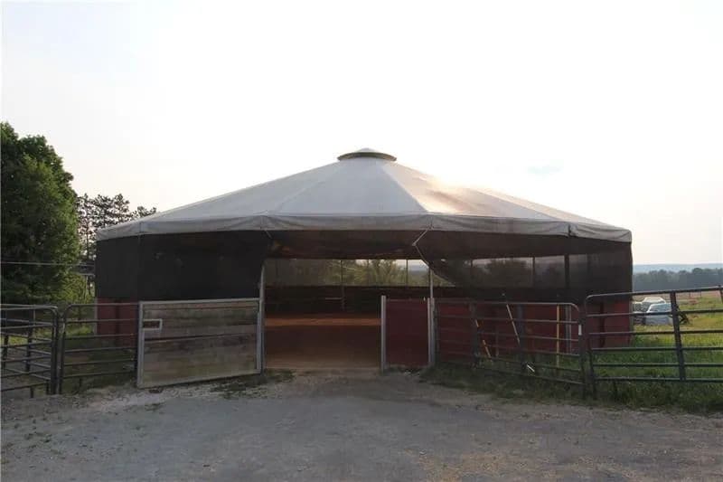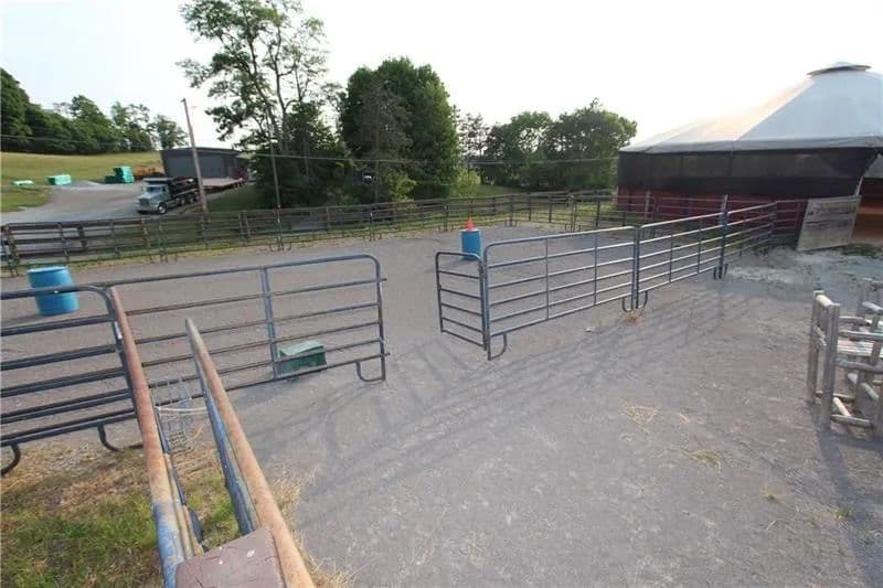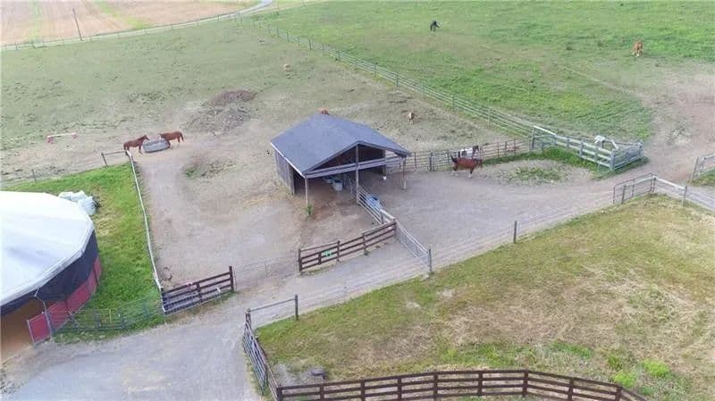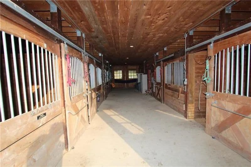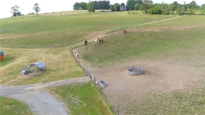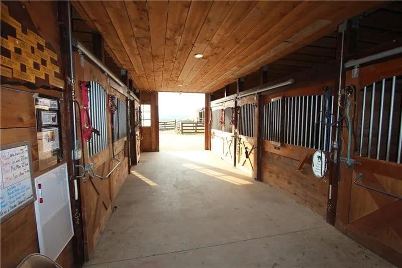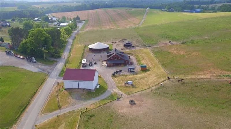 Exceptional 17-acre horse farmette built for an equestrian business. 10-stall barn features wide concrete aisles, a tack room, & functional layout ideal for boarding, training, or lessons. The upper loft offers flexible open-span space perfect for a conference room, office(s), & kitchenette, plus washer and dryer hookups for daily barn-life convenience. Approximately 15 acres are in divided pastures w/ 4-wire coated electric fencing, designed for efficient turnout & safe rotation. 2-story bank barn provides serious storage, including room for 1,500+ square bales, a grain room, & a concrete lower level ideal for a workshop, equipment storage, or small machinery bay. Enclosed, covered 60’ diameter Equi-Cover round pen, giving you year-round ride time. The land has not been treated w/ chemicals, offering a great start for those wanting an organic-minded property. Abundant water well. Security keypad doors plus a burglar alarm/ADT system is transferable add peace of mind.