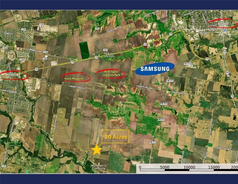 Exceptional 20.62-acre unrestricted parcel, perfectly positioned nearly equidistant from Hutto and Taylor, only 5 miles from Samsung’s Semiconductor Plant. Located 6 miles south of RCR Logistics Park (and on the same road) and 4 miles south of Hutto Megasite, this level lot offers excellent access to HWY 79, FM 973, and the 130/95 toll road interchange. Ideal for commercial, industrial, and residential development in the thriving Hutto ISD. A prime opportunity!
