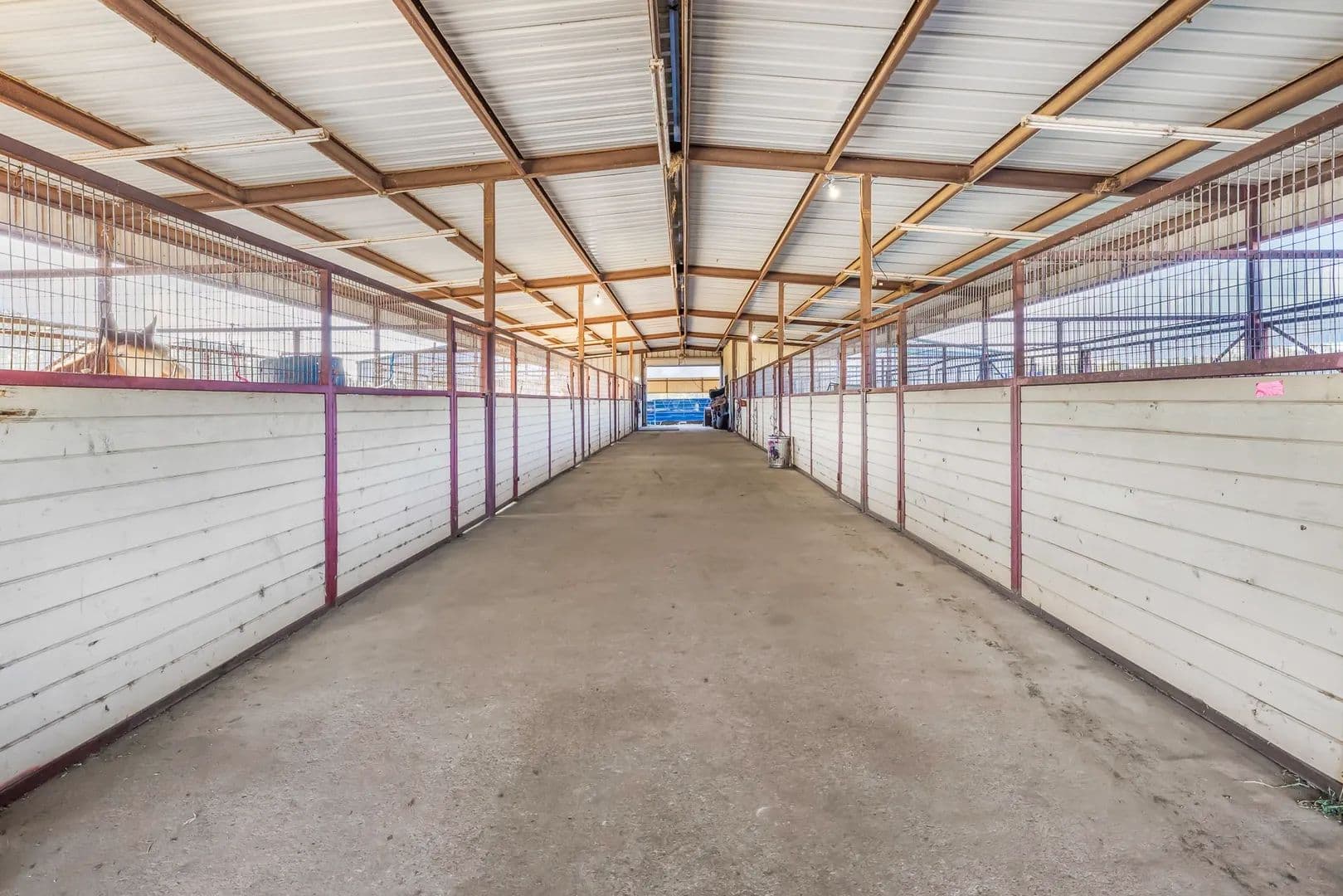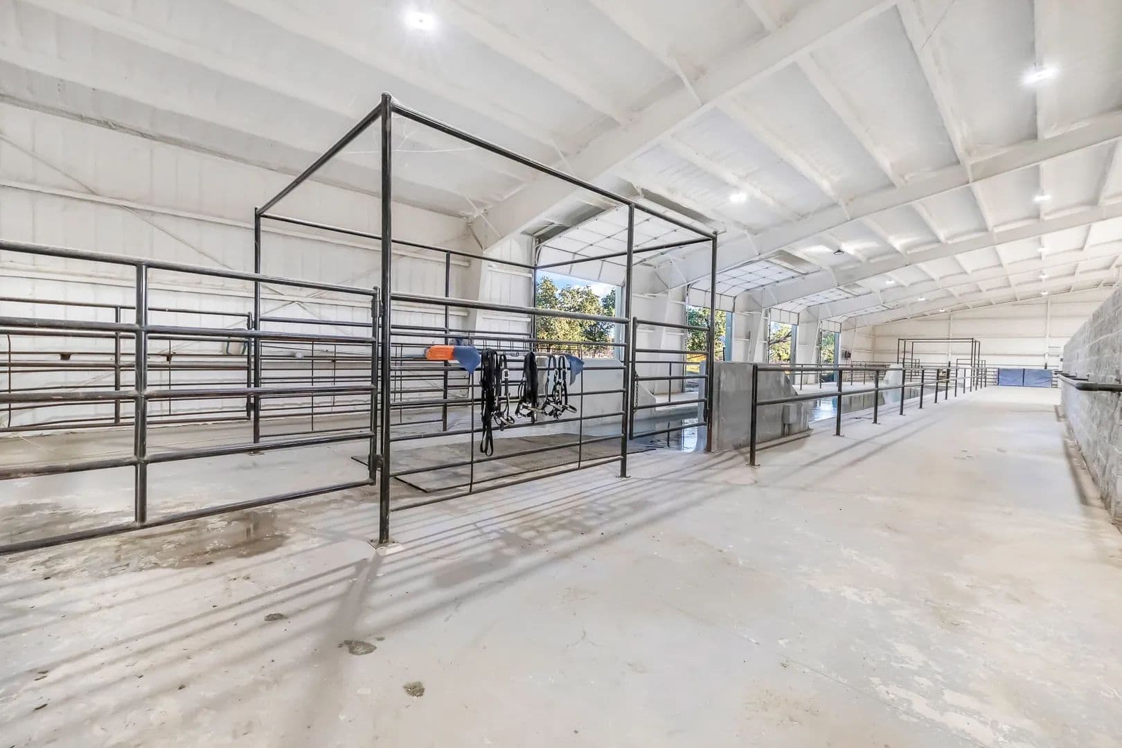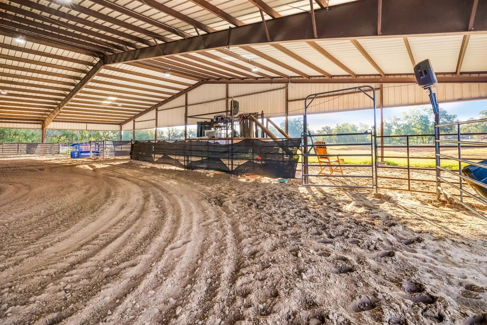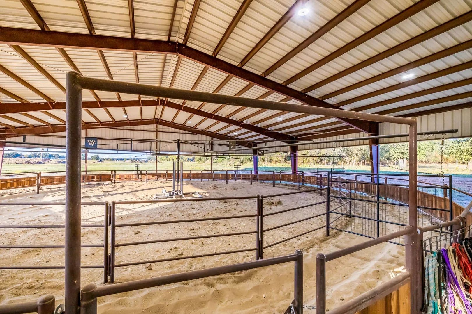 At the heart of the property is a 175' x 250' covered arena, ideal for barrel racing, team roping, calf roping, and more — fully equipped with a calf lane, catch pen, and chute for smooth practice or events. A 20-stall barn anchors the horse facilities, featuring two tack and feed rooms — one complete with a rotating saddle wall, the other plumbed and ready to convert into a cozy apartment. There's even room to expand with additional stalls or add turnouts.