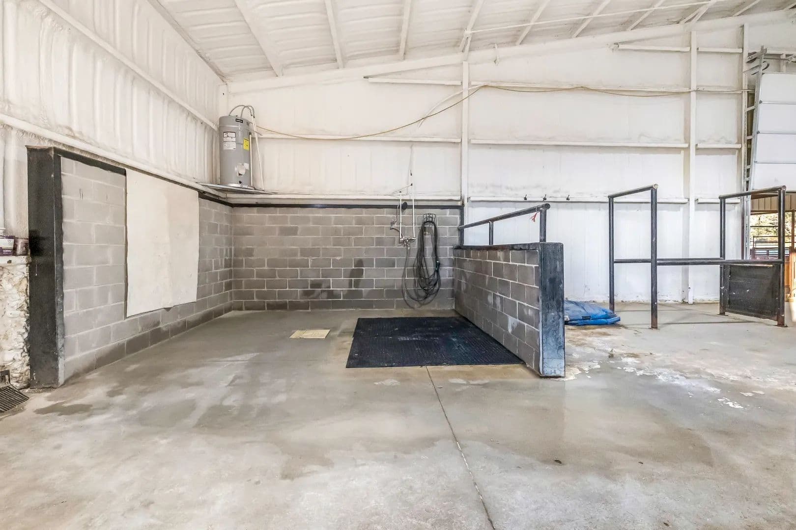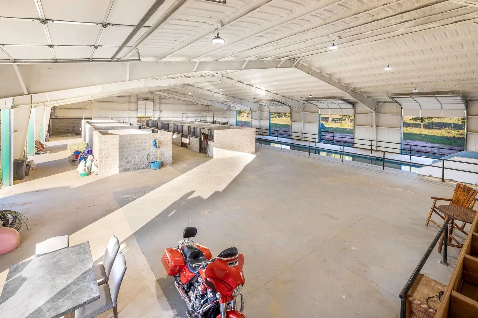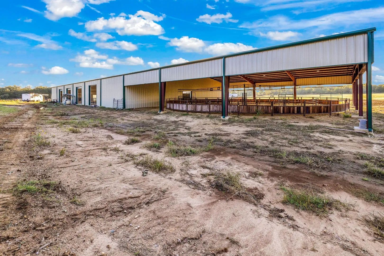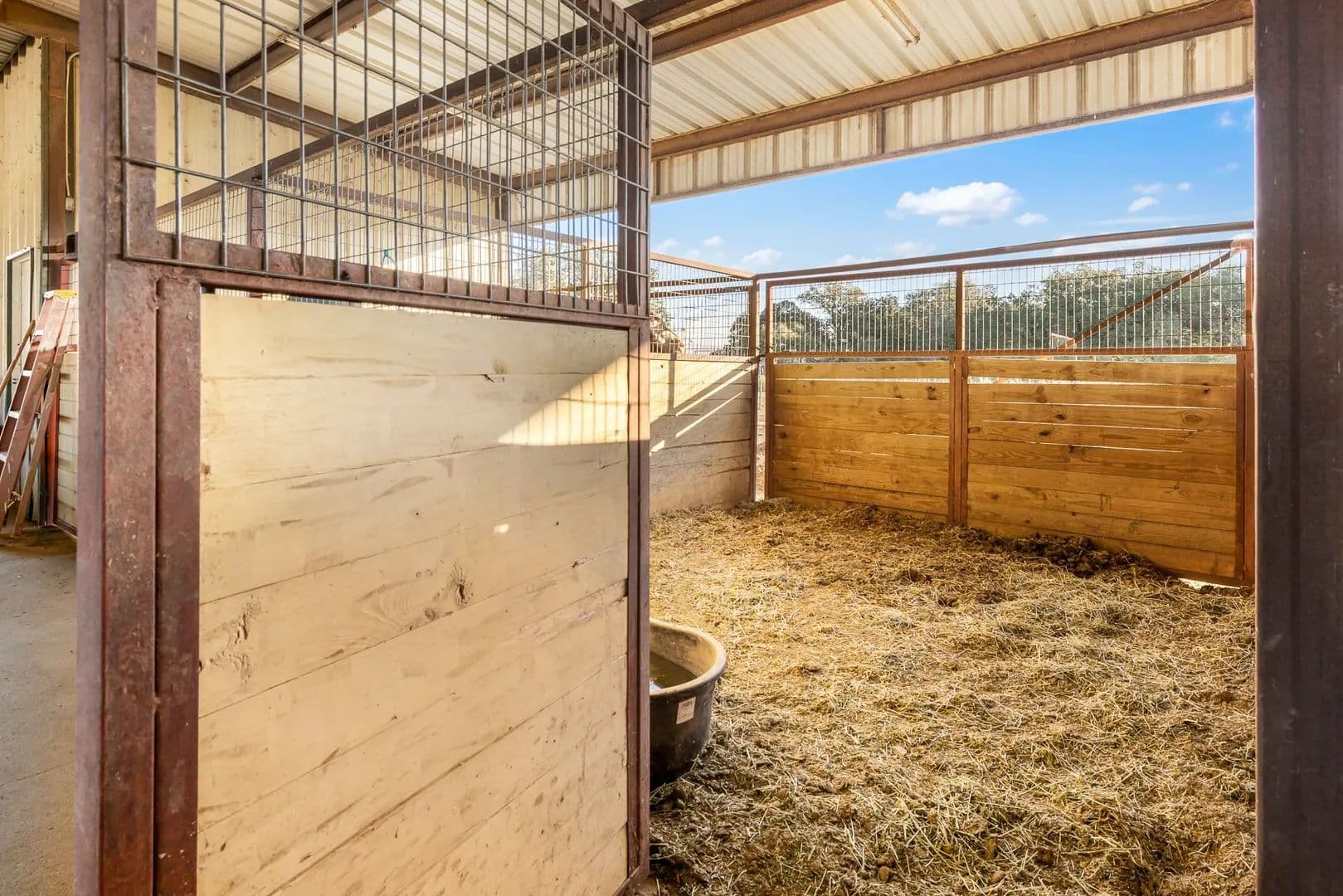 At the heart of the property is a 175' x 250' covered arena, ideal for barrel racing, team roping, calf roping, and more — fully equipped with a calf lane, catch pen, and chute for smooth practice or events. A 20-stall barn anchors the horse facilities, featuring two tack and feed rooms — one complete with a rotating saddle wall, the other plumbed and ready to convert into a cozy apartment. There's even room to expand with additional stalls or add turnouts.
