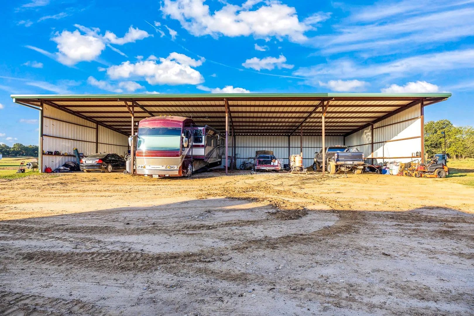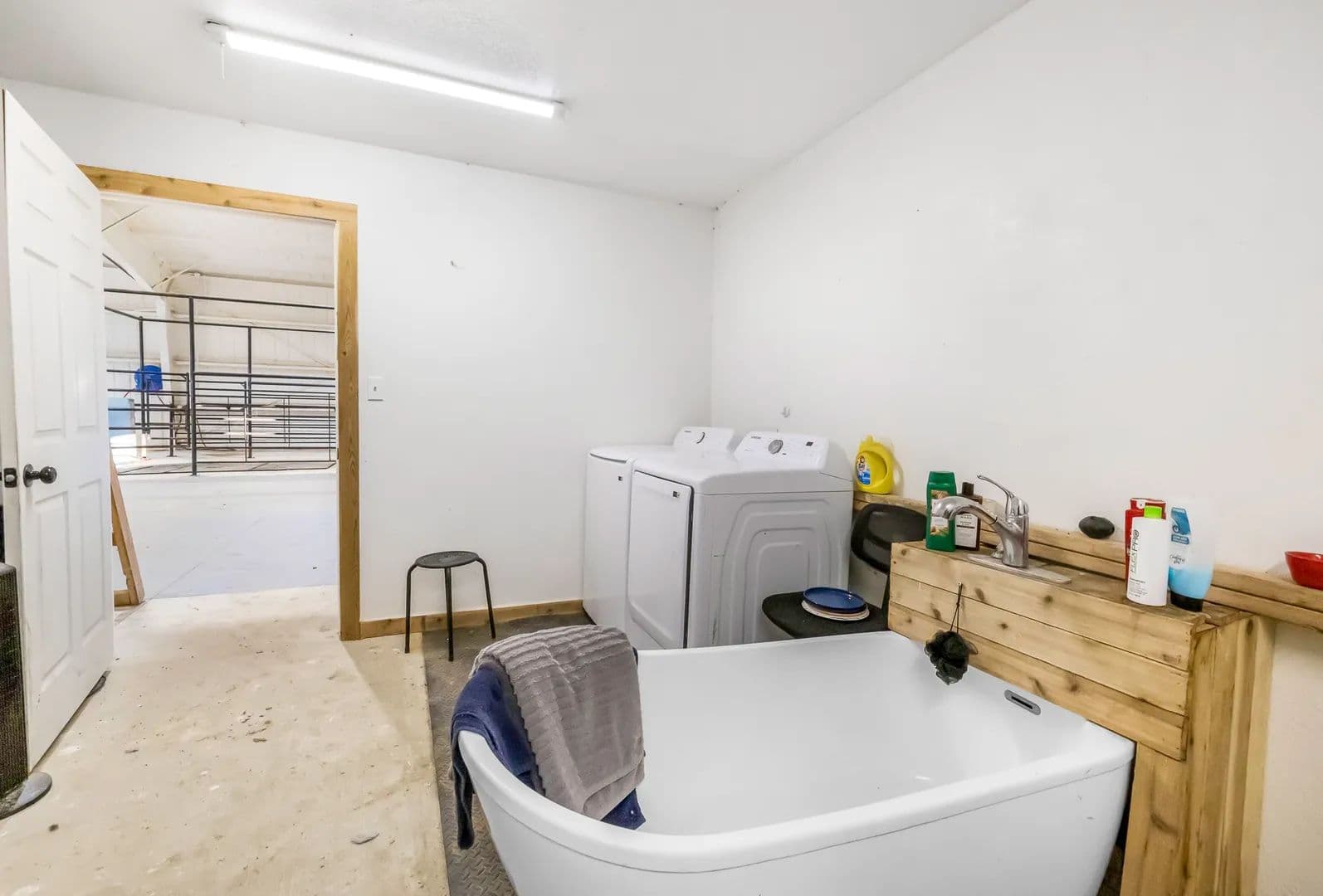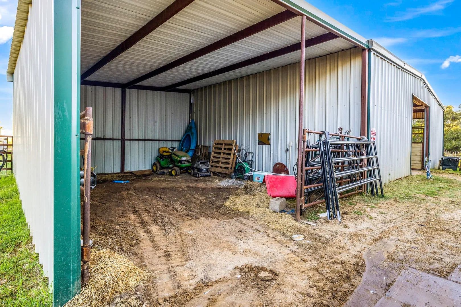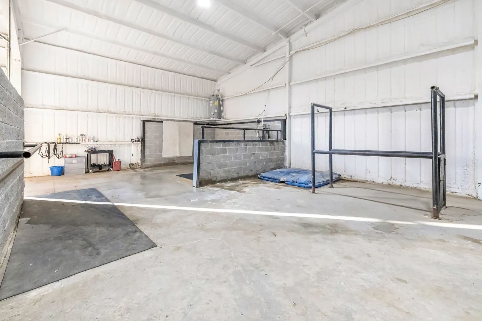 At the heart of the property is a 175' x 250' covered arena, ideal for barrel racing, team roping, calf roping, and more — fully equipped with a calf lane, catch pen, and chute for smooth practice or events. A 20-stall barn anchors the horse facilities, featuring two tack and feed rooms — one complete with a rotating saddle wall, the other plumbed and ready to convert into a cozy apartment. There's even room to expand with additional stalls or add turnouts.