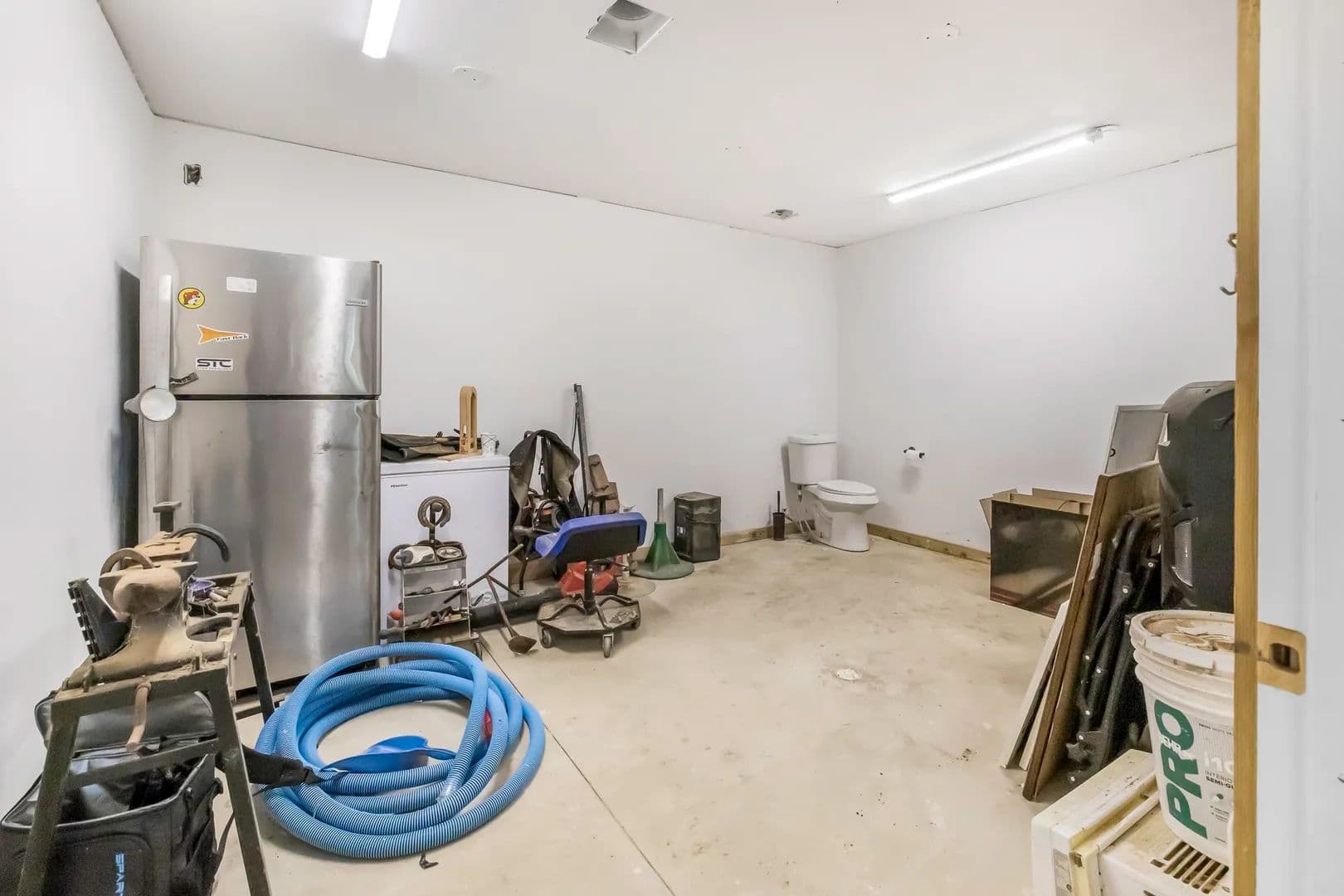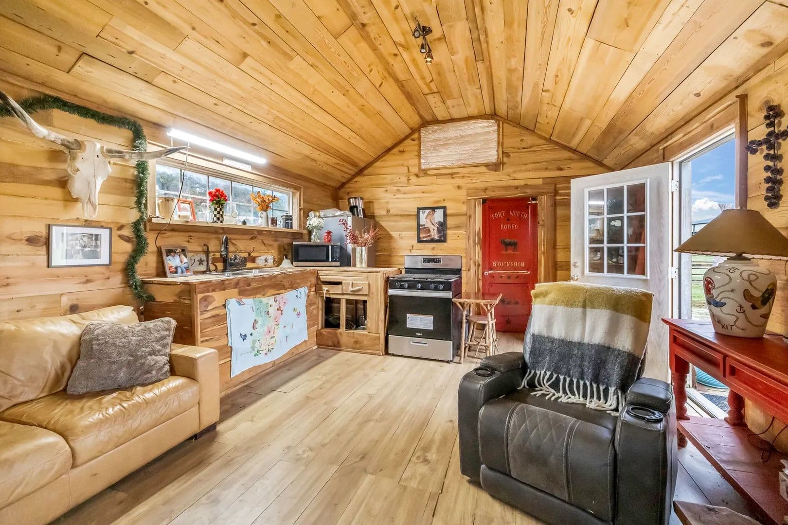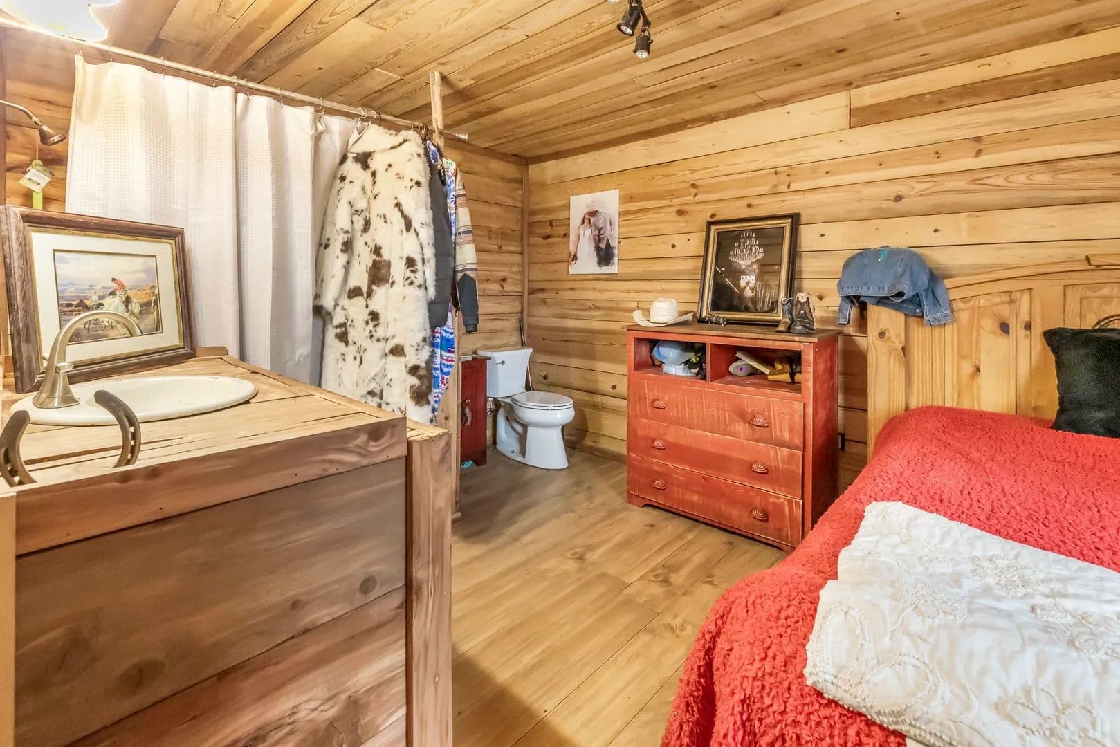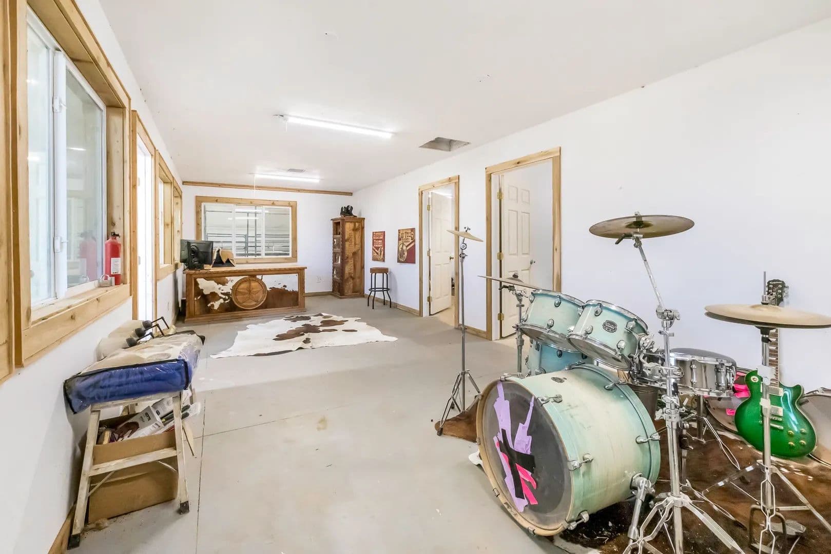 At the heart of the property is a 175' x 250' covered arena, ideal for barrel racing, team roping, calf roping, and more — fully equipped with a calf lane, catch pen, and chute for smooth practice or events. A 20-stall barn anchors the horse facilities, featuring two tack and feed rooms — one complete with a rotating saddle wall, the other plumbed and ready to convert into a cozy apartment. There's even room to expand with additional stalls or add turnouts.