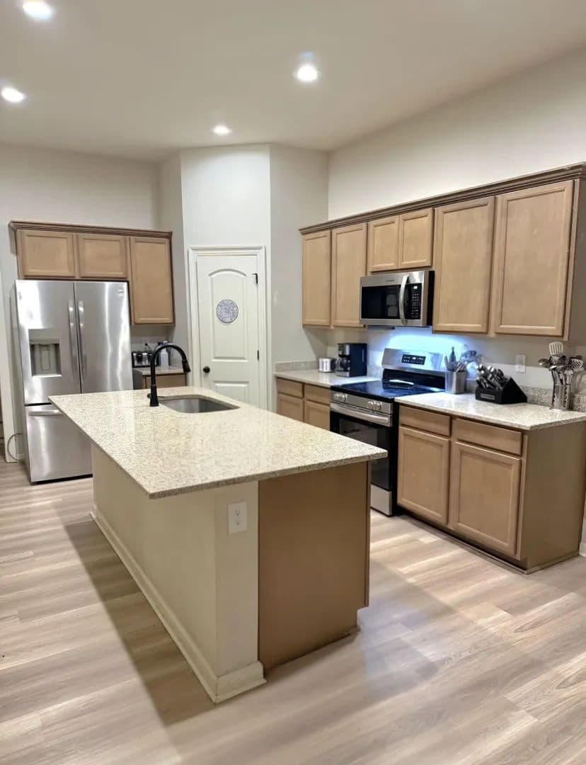 The spacious primary suite serves as a private retreat, complete with a double vanity, relaxing garden tub, separate shower, and a generous walk-in closet. Thoughtfully selected upgrades enhance both style and functionality with granite countertops and high ceilings throughout the home. The kitchen is a true centerpiece, featuring a large island, walk-in pantry, and a full appliance package with electric range, making meal prep and gatherings effortless.