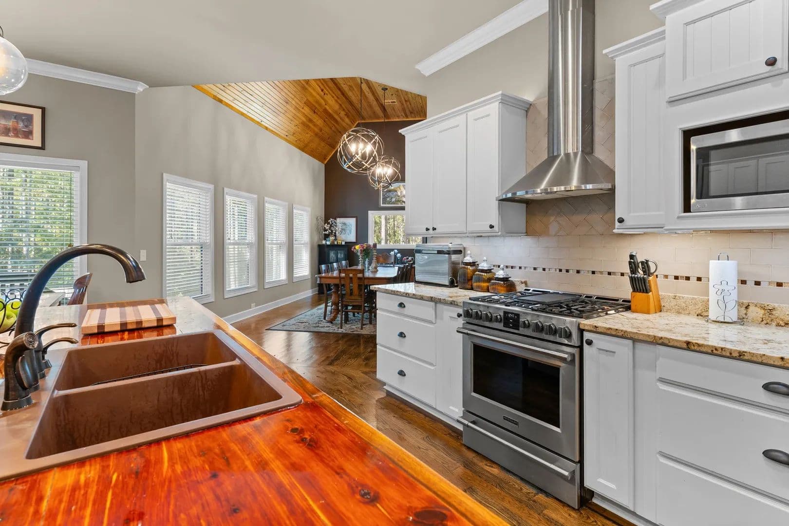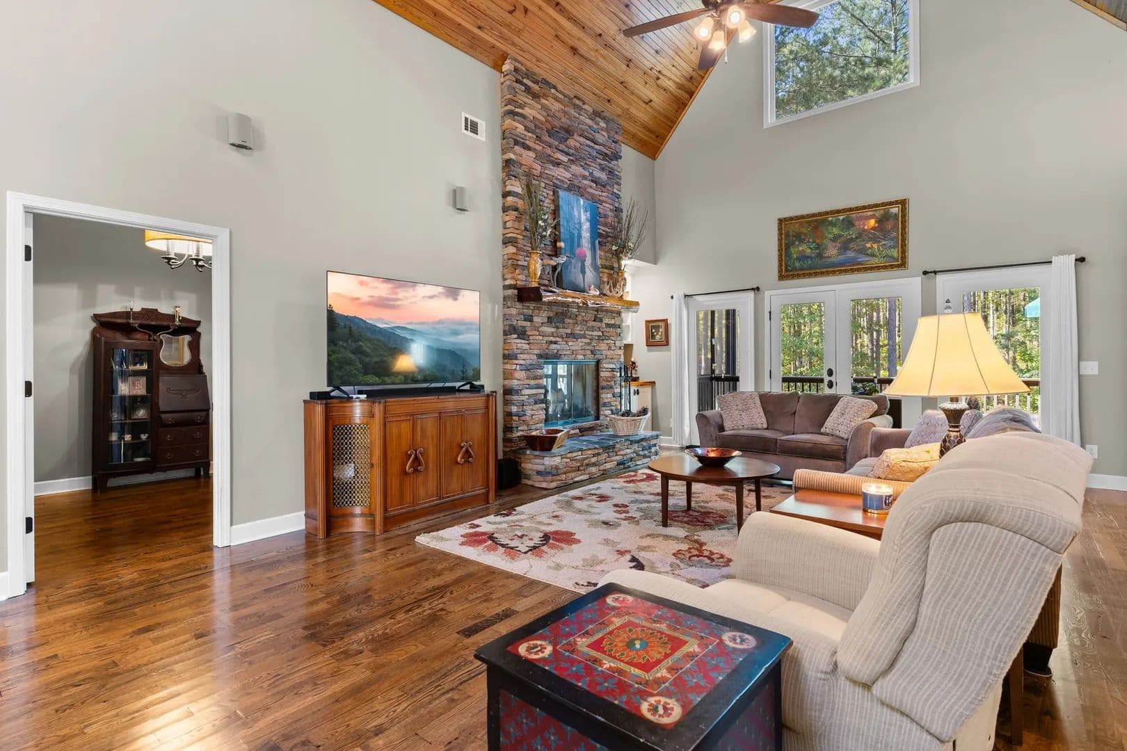 From the moment you step through the front door, you’re greeted by the warmth of a floor to ceiling stone fireplace, handcrafted mantle, and vaulted wood ceilings. The kitchen offers generous granite counterspace, abundant cabinetry, and an effortless flow. At its center, a custom cedar island, crafted from trees harvested right here on the property. The kitchen and breakfast area open seamlessly to the dining room wrapped in rich wood tones.