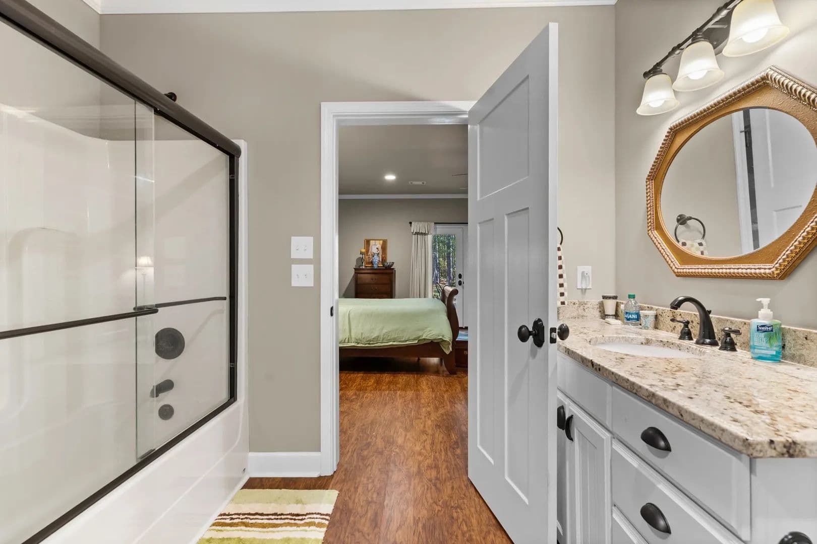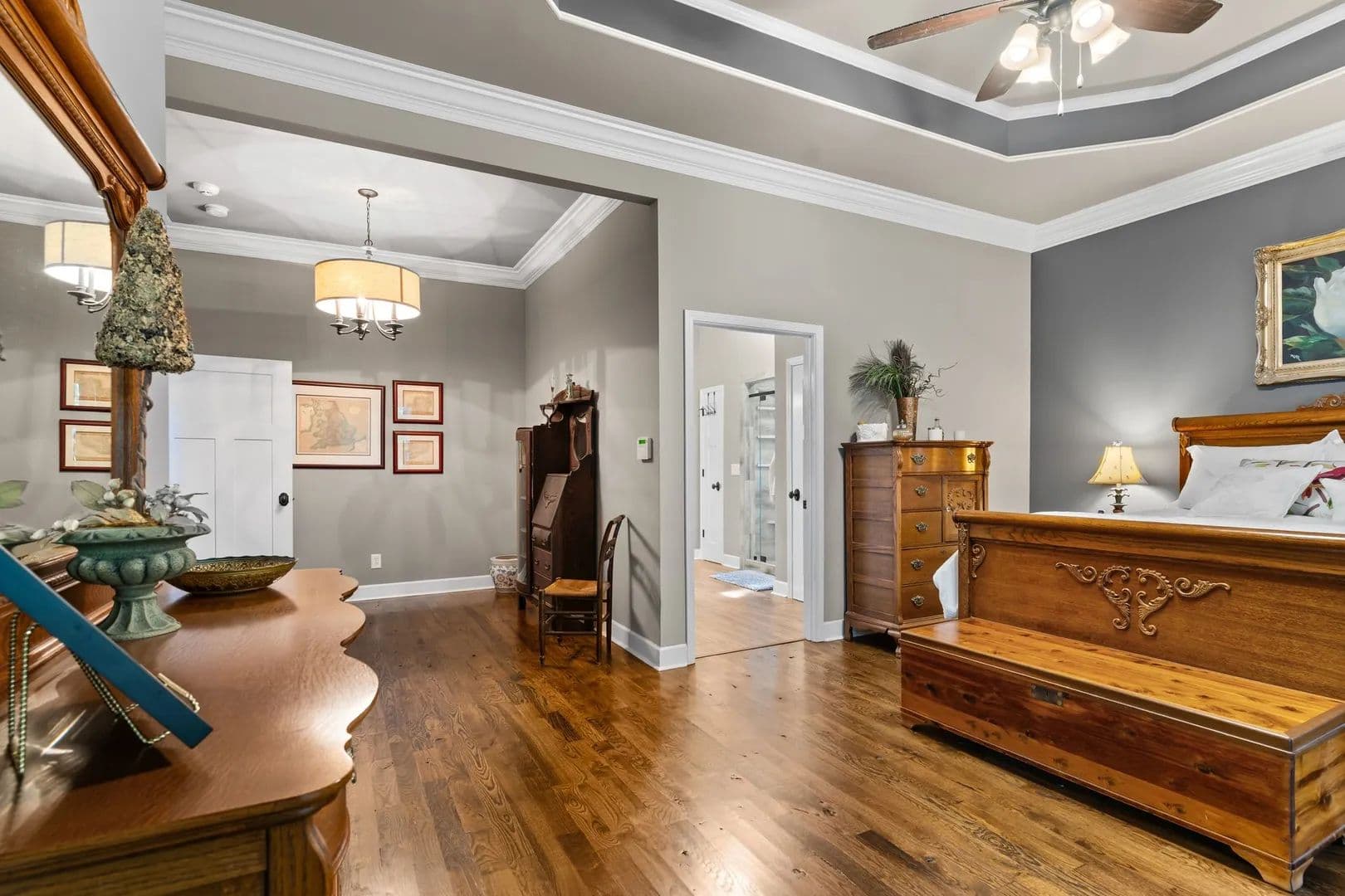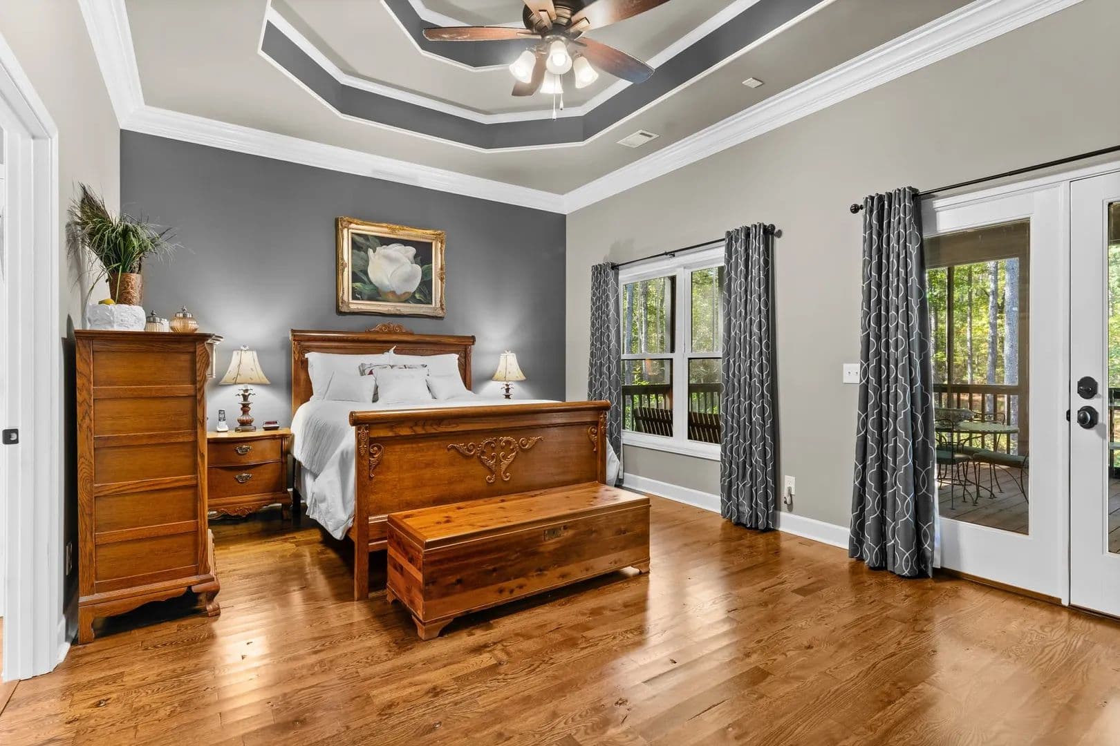 The primary suite features a beautiful tray ceiling, a spacious bath, and private access to a peaceful screened porch.