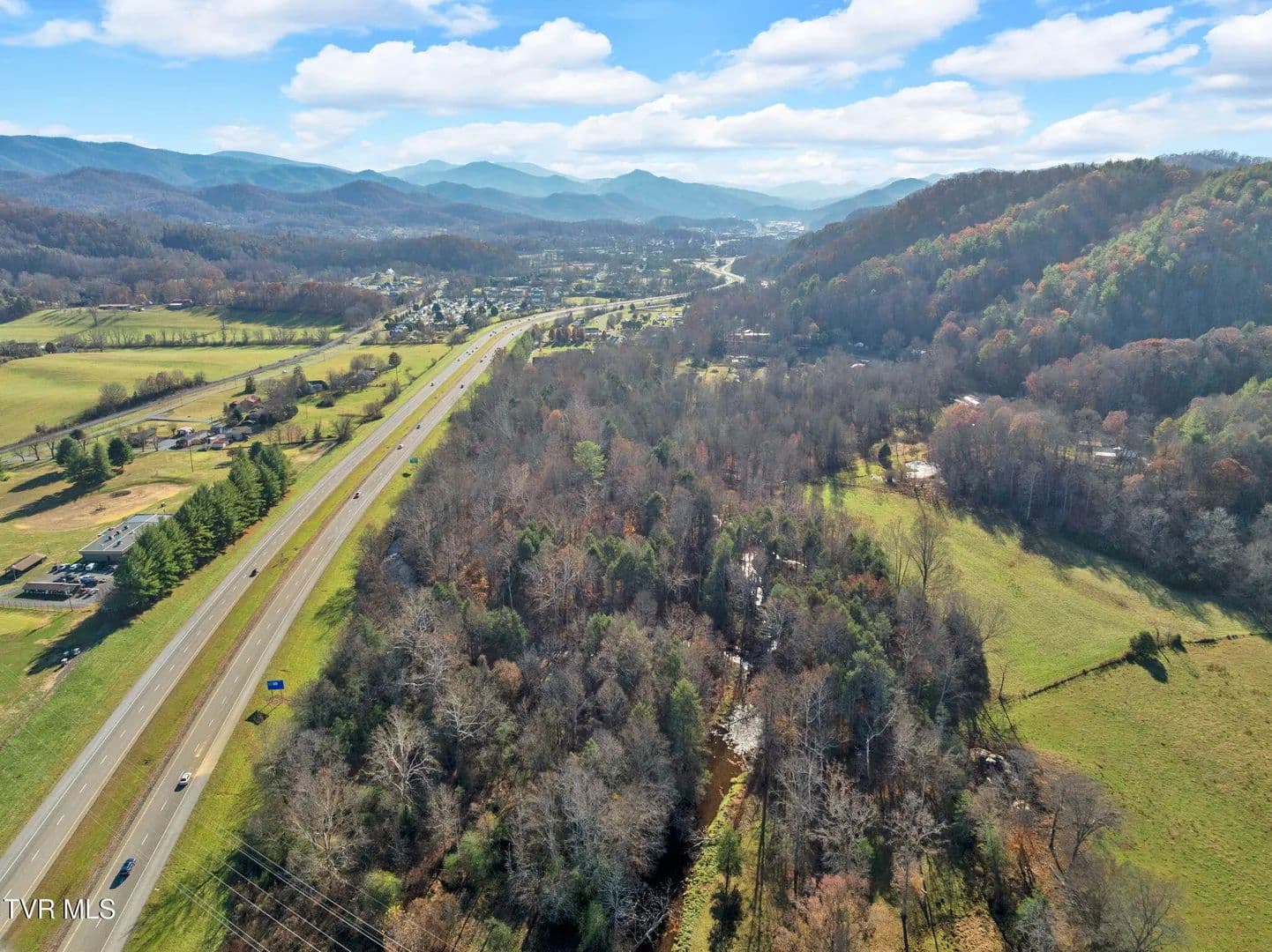 The aerial views highlight just how special this location is—rolling land, mature trees, and panoramic mountain scenery that surrounds you with the best of East Tennessee.