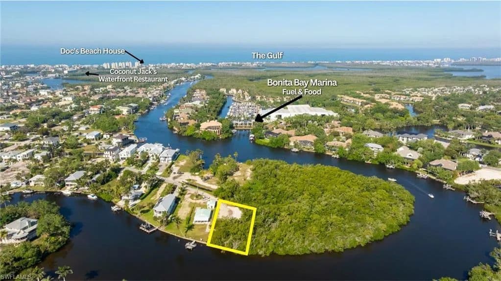 TWO GULF-ACCESS Parcels totaling .36 Acres. TFC2 ZONING ALLOWS DUPLEX OR SINGLE FAMILY. ADJACENT BONITA BAY LAND WILL NEVER BE BUILT ON. OVER 90 FEET OF DEEP RIVER FRONTAGE w/ ONE HIGH BRIDGE TO THE GULF. Dock a 40+ foot boat here, with plenty of room to freely design and build your Dream Home in Bonita Springs. World-class fishing, sandy & secluded beaches and waterfront restaurants are all at your fingertips from this unbeatable location. Gulf Beaches are 15 minutes by boat or 1.9 miles by bike. Downtown Bonita, Mercato, and the coming-soon Midtown Bonita Mall are all within 15 minutes by car. This may be your LAST OPPORTUNITY to build on a Gulf-access lot this large, for this price, and in this coveted neighborhood. THIS IS THE SECOND LARGEST LOT ON THE STREET! The adjacent peninsula is owned by Bonita Bay HOA as "Preserve Land." Bring your own Builder/Architect or use one of ours. Don't wait--this unique opportunity won't last long!