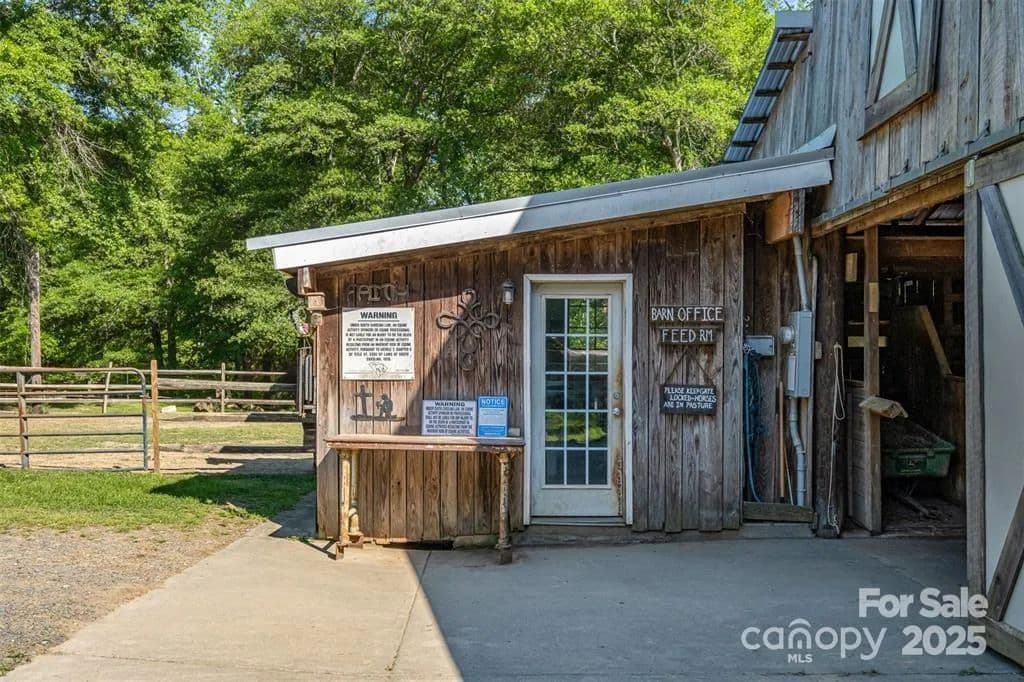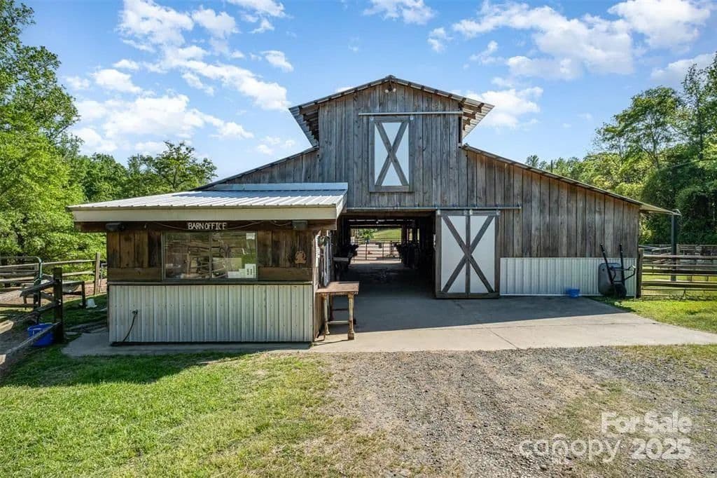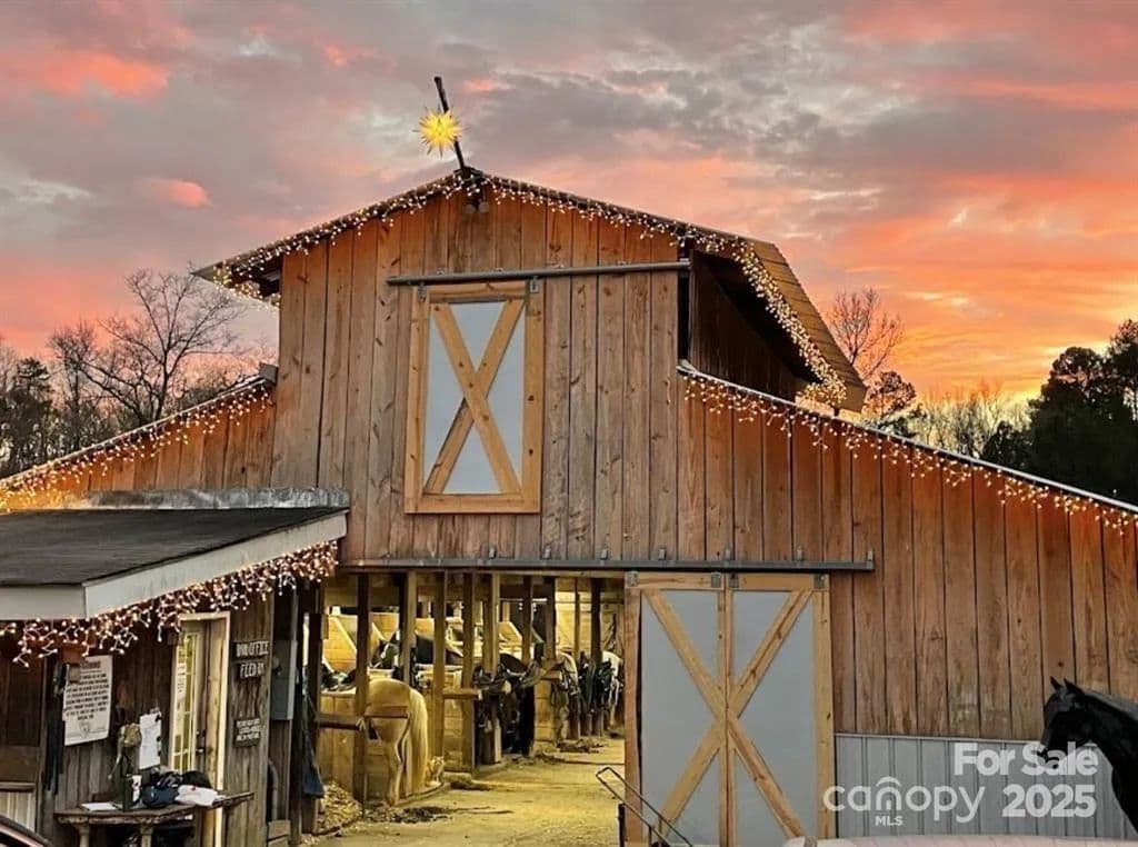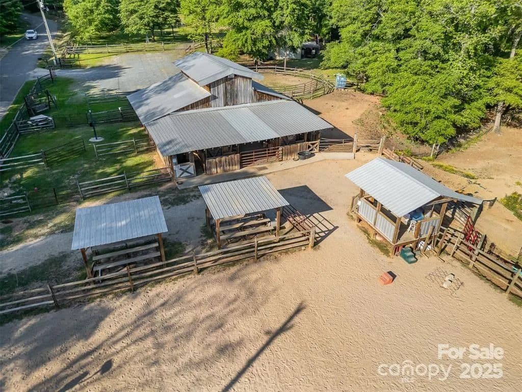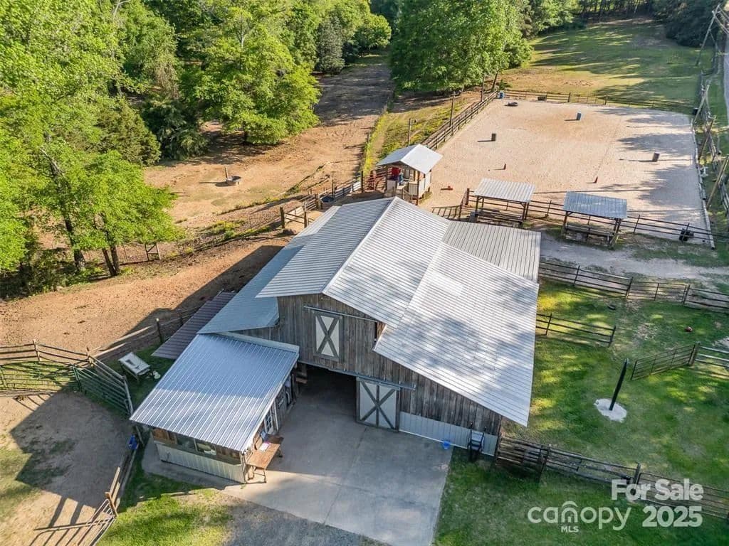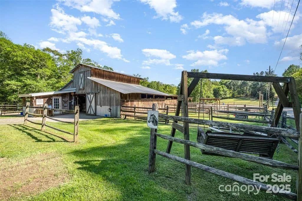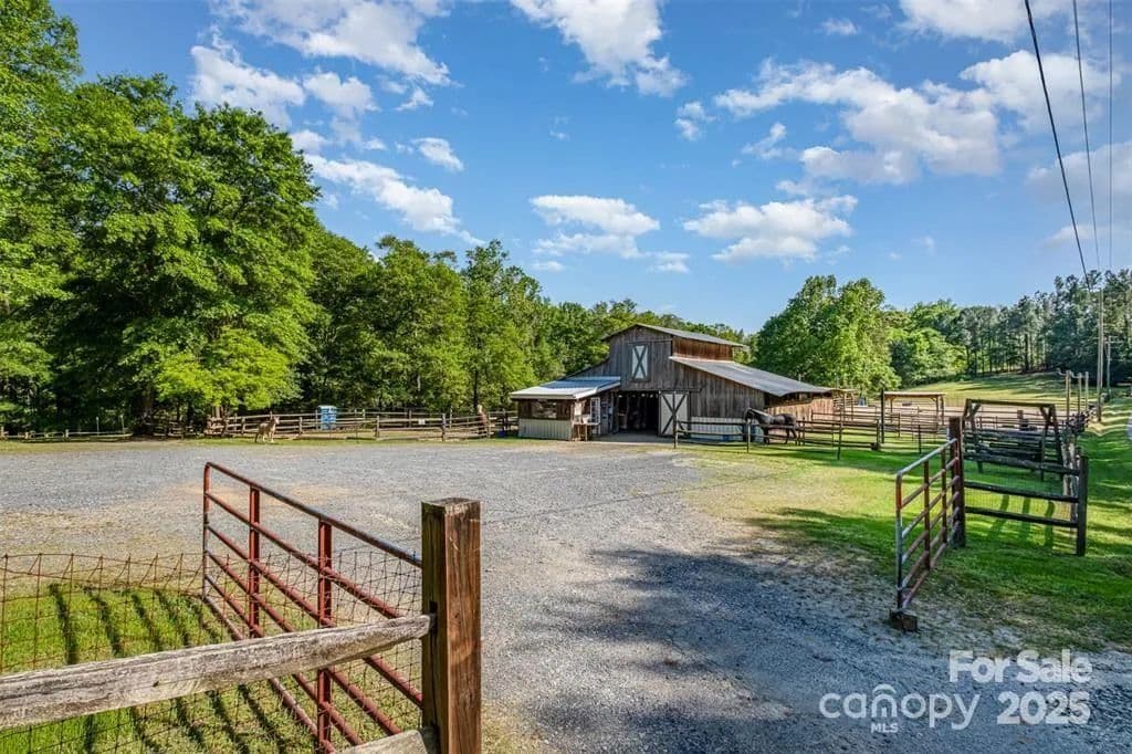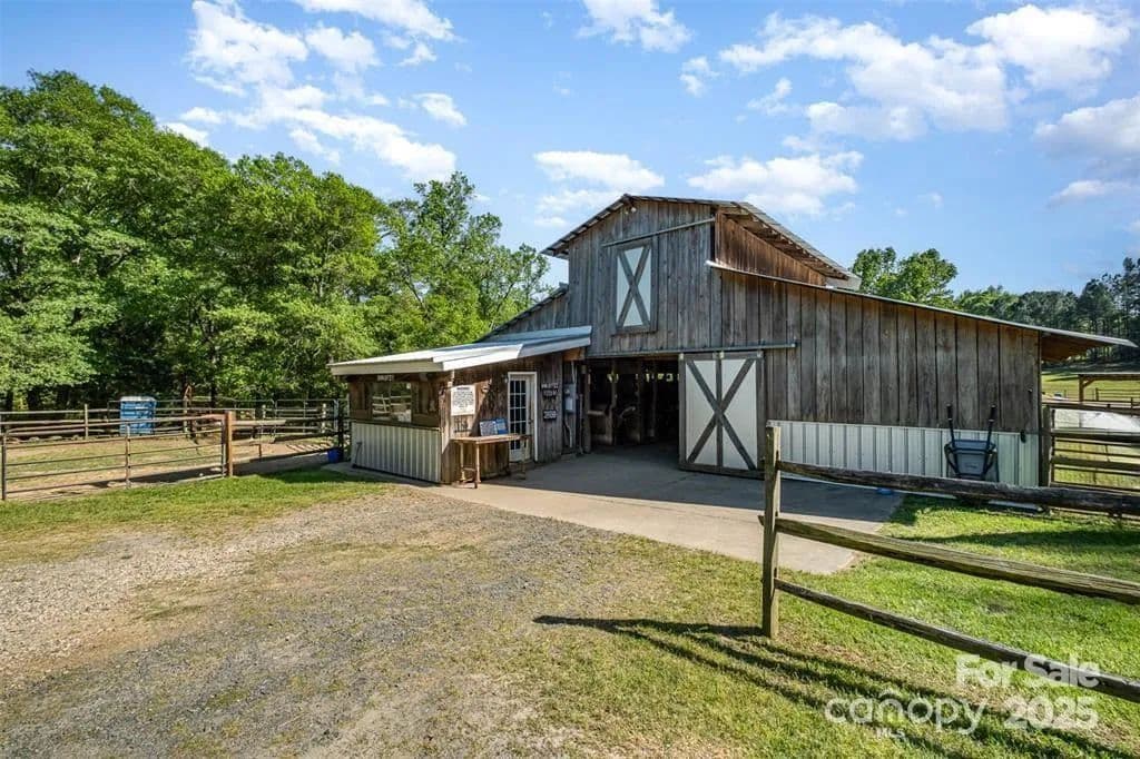 This exceptional 11.57-acre equestrian property offers a rare opportunity to enjoy the privacy and tranquility of country living, all while being just minutes from the conveniences and amenities of Indian Land. The main barn has been completely redone throughout the years, which includes includes 18 horse stalls (made up of 2 box and 16 standing stalls), each equipped with individual lighting. Attached to the barn are a functional tack room and a temperature controlled feed room with hot water, providing convenience for daily operations. Equestrian amenities include lighted riding arena that allow for evening or night training, and water lines run to three separate pastures, supporting efficient care and grazing for horses. Also included are 2 paddocks, a round pen, shop/equipment building, and spectator seating! On the opposite side of the street, a separate hay barn is included as part of the property, offering additional space for feed storage and equipment. The facility has been successfully run for years as a riding school and summer camp, and is perfectly suited for continued use as a boarding stable, training center, or equestrian camp OR working farm. A one-story brick home with a fully finished basement is located on the property and is included in the sale in as-is condition. With excellent infrastructure, a strong reputation, and income-generating potential, this is the perfect opportunity for any horse enthusiast or entrepreneur!