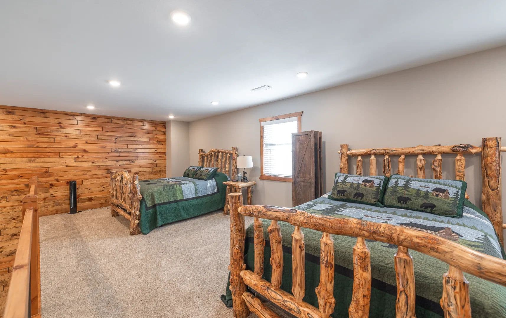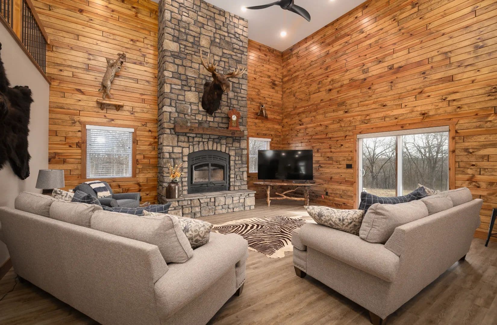 The lodge features warm wood siding and an expansive, open living area highlighted by soaring ceilings and a generous loft that overlooks the main living space. At the center of the home is a striking floor-to-ceiling wood fireplace, creating a cozy focal point for gatherings in every season. Large windows invite natural light and showcase peaceful views of the surrounding land. The wrap around covered porch is perfect for morning coffee or evening night caps.