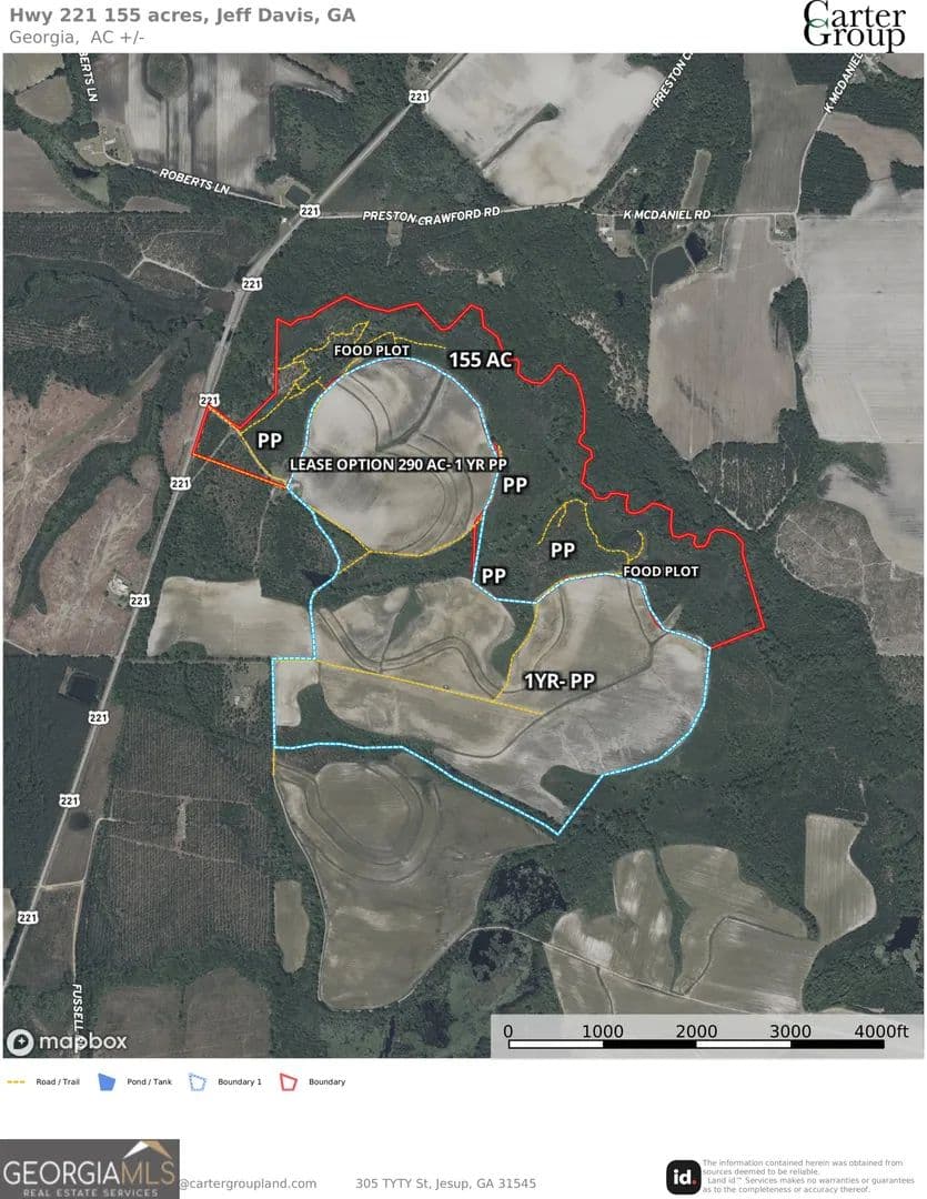 This is truly a one-of-a-kind hunting tract along the renowned Hurricane Creek. The land features oak ridges that roll gracefully into the creek bottoms, creating a rich and diverse habitat. Natural duck ponds dot the creek corridor, while stands of longleaf pine wrap around the hardwood bottoms, offering both beauty and exceptional wildlife cover. The property is a sportsman's dream, with abundant turkey, trophy deer, and excellent duck hunting opportunities. A well-laid trail system connects the property, leading to multiple areas ideal for food plots and stand locations. What makes this tract even more unique is the potential option to lease 290 adjoining acres, scheduled to be planted in pines in January 2026. This addition would give you access to an incredible 445-acre hunting paradise at minimal additional cost. Hurricane Creek has long been known for producing big-bodied bucks, adding to the appeal of this rare offering. Conveniently located just off Highway 221 near Hazlehurst, GA, the property offers easy access and is only a short drive into town for supplies. For those traveling from Florida, it's just a little over 2 hours from Jacksonville, making it perfect for weekend getaways. With multiple ideal homesite or cabin locations, good road frontage, and power available, this property is well-suited for building your retreat while enjoying everything Hurricane Creek has to offer. Don't miss the chance to own this exceptional property where timber, wildlife, and recreation come together in one remarkable setting.