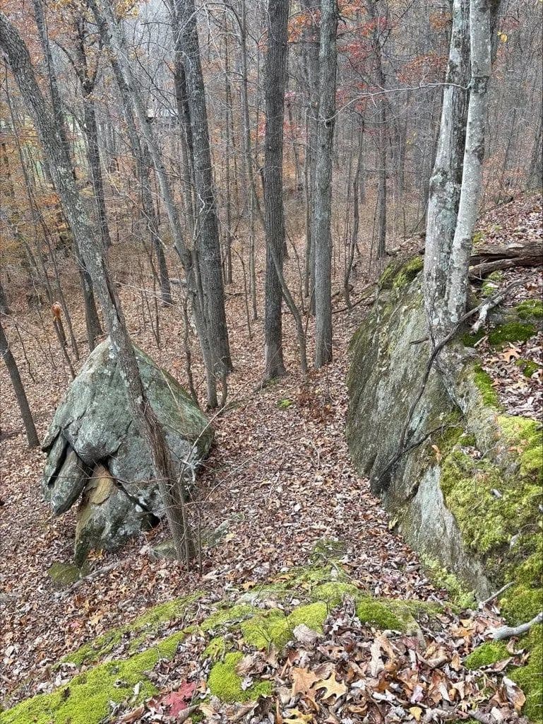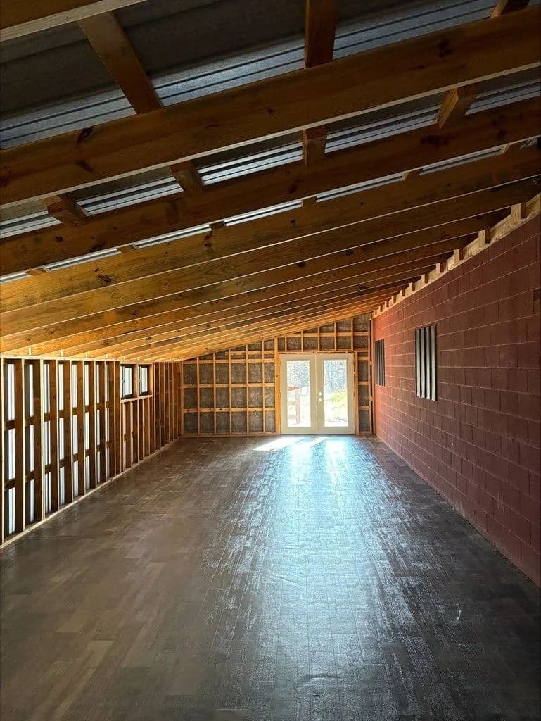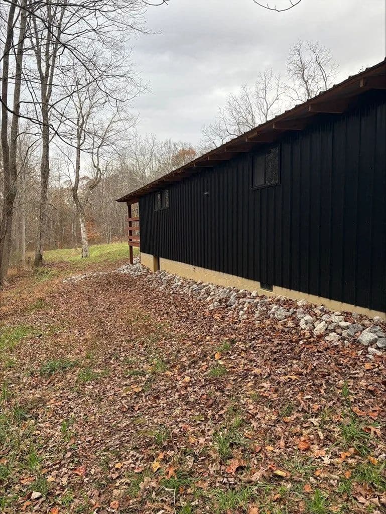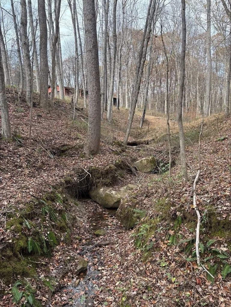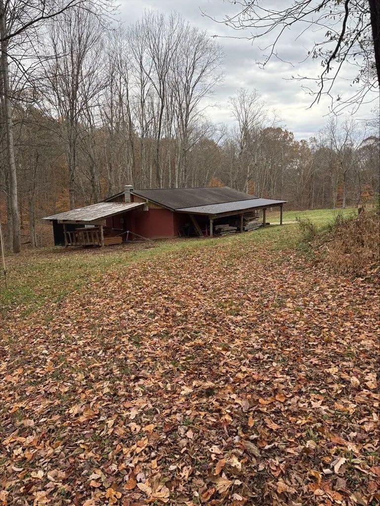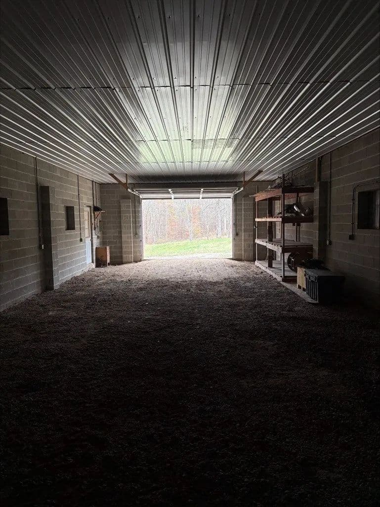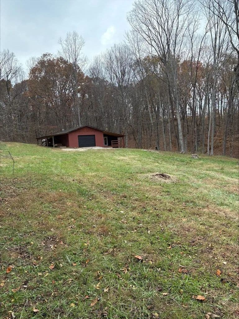 Secluded 9.36 acres with 24X56 block garage, not visible from the road. 16x46 addition to garage added in 2023 that could be converted to living space. 200 amp electric service. County water available at the road. No tap paid. Spring fed cistern partially ran to crawlspace under the addition. Acreage is mostly wooded with mature timber. Easy access to US-35.