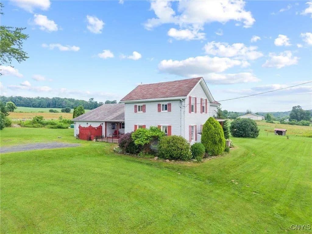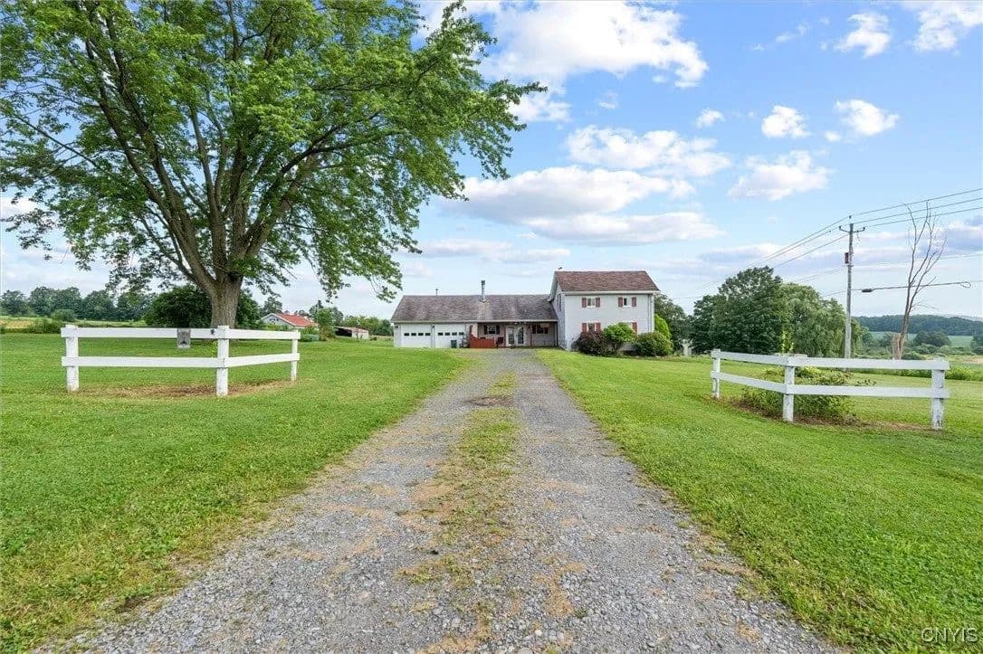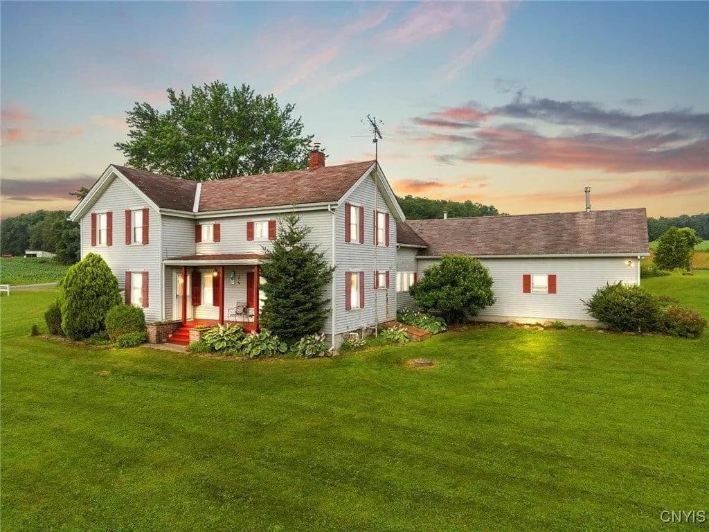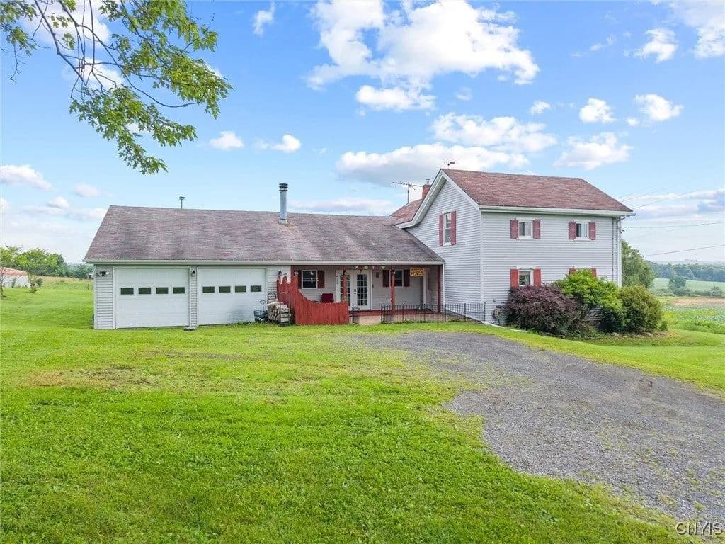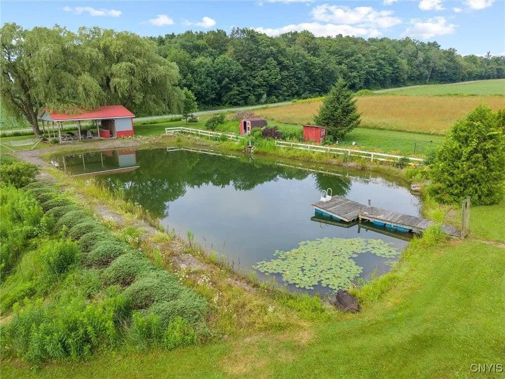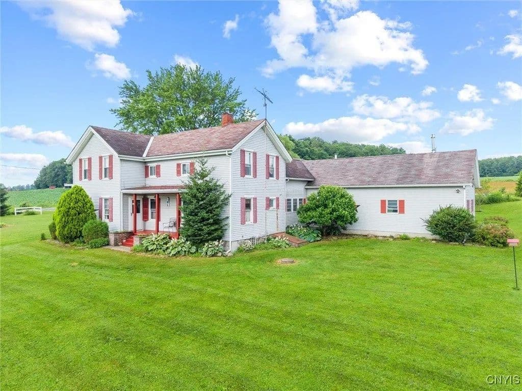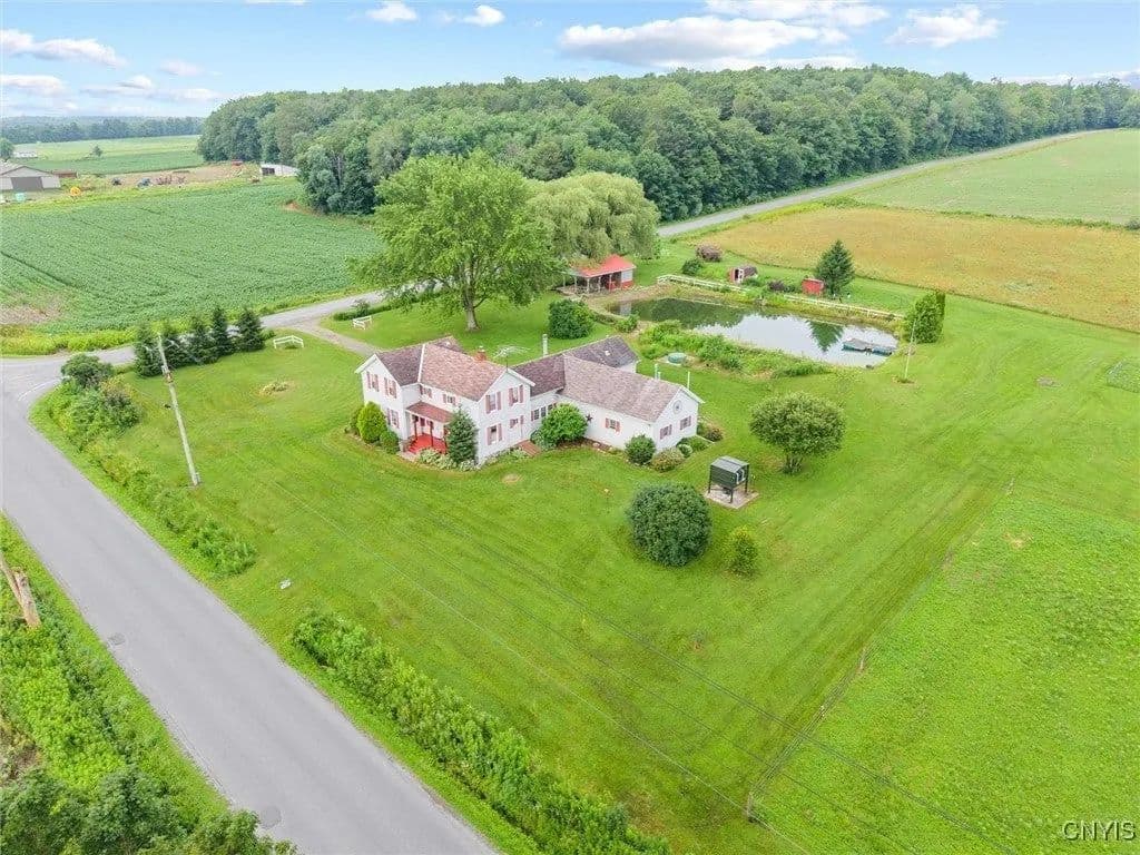 This beautifully expanded farmhouse offers 3,142 square feet of living space on 12 level acres. Originally constructed in the mid-1800s, the home blends historic character with thoughtful modern updates. The country kitchen features stainless steel appliances & original hardwood floors. The beautiful hardwoods continue to the front room; on one side, tucked behind French doors, is the primary suite. This spacious retreat includes a walk-in closet & a cozy propane fireplace. On the other side are a full bath and separate laundry room, creating a comfortable and functional private wing. A formal dining room boasts a wood-burning fireplace and newly installed hardwood floors (2021), perfect for cozy gatherings. The heart of the home is a 19’ by 25’ great room with vaulted ceilings and a stunning floor-to-ceiling stone propane fireplace. An additional full bath and private office flank the great room. Upstairs, you’ll find two additional spacious bedrooms, another walk-in closet, a full bathroom, and access to a walk-in attic Farmette ready features abound. A 40’ by 30’ Morton barn includes electric, water, & stalls with antique doors salvaged from the NYS Fairgrounds. Over two acres of fenced pasture include two livestock run-ins. There’s also a chicken coop, garden shed, and metal carport. A picturesque pond includes a floating dock, pavilion, fountain, and aerator. Systems and utilities have been updated for efficiency and reliability. 200 amp electrical service w. whole-house surge protection, and separate panel wired and ready for a whole-house generator (generator not included). A high-efficiency pellet boiler installed in 2019 w a 3.5-ton bulk hopper, thermal storage, stainless chimney liner, and remote monitoring with heating zoned into four areas supported by pellet, wood, & propane options. A tankless propane hot water system was added in 2019, and both the house well pressure tank and pond well pump were replaced in 2023. Fiber optic internet is available. This move-in ready farmette offers history, comfort, and room to grow—all within a peaceful and practical setting. Also listed as single family S1621453