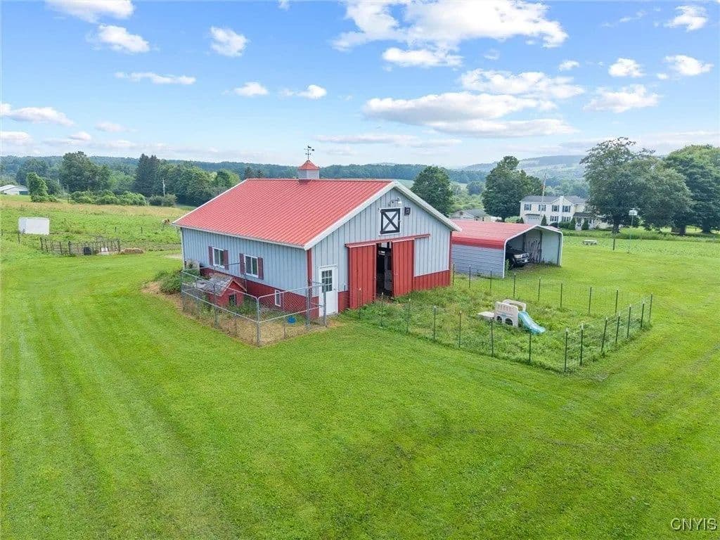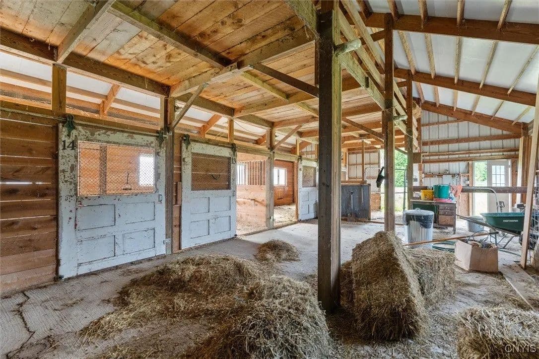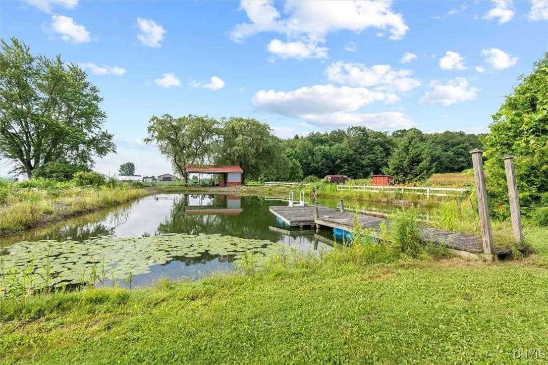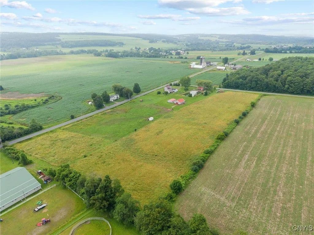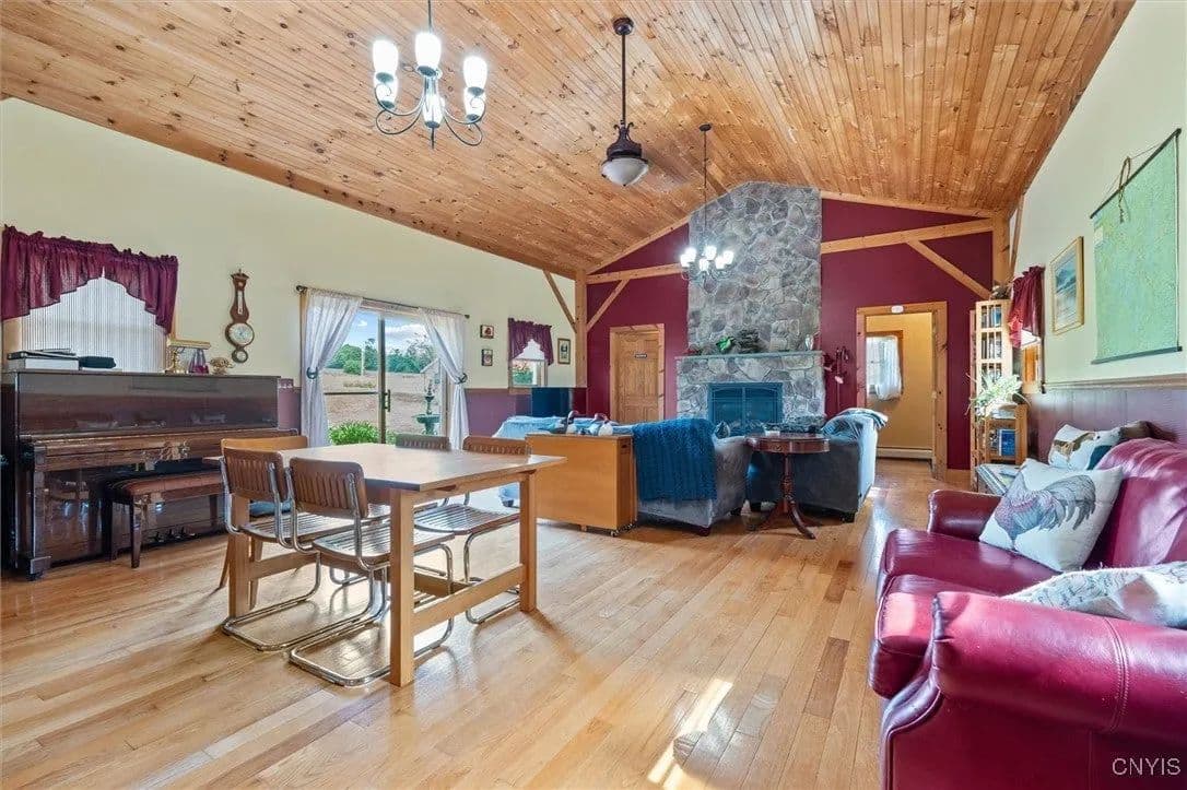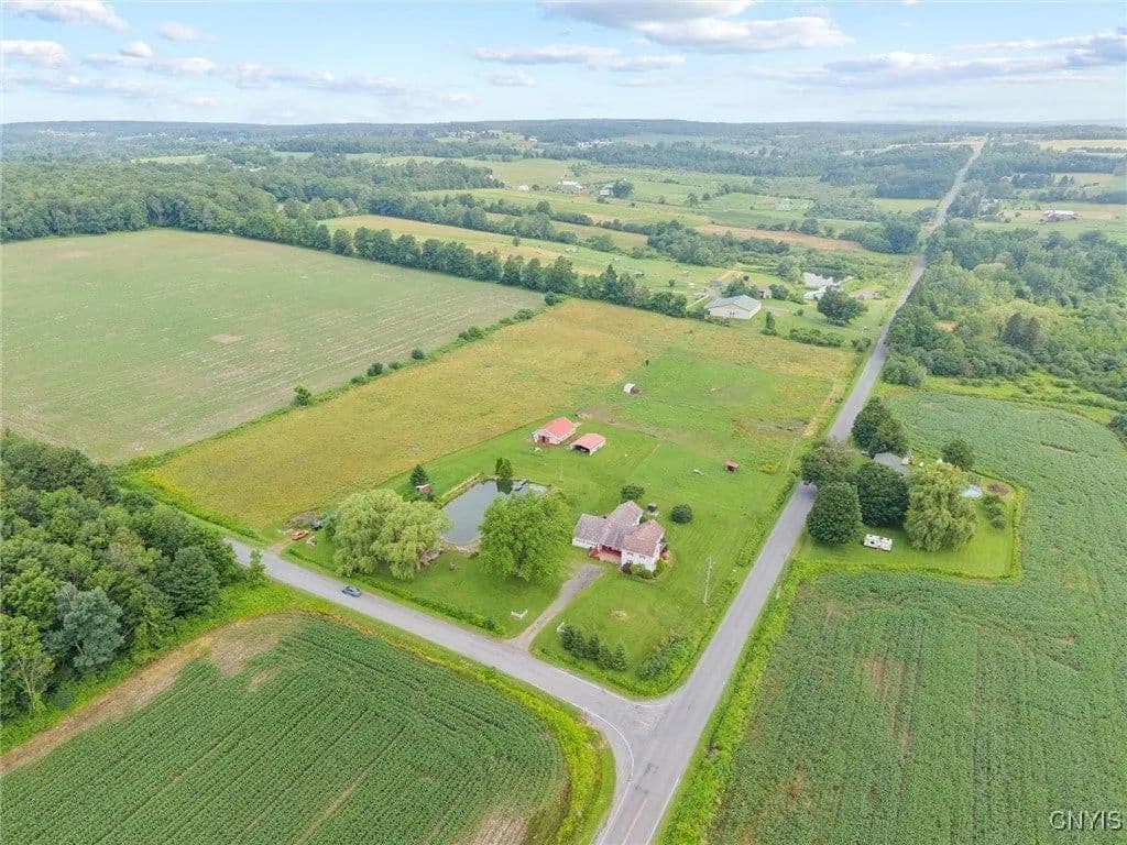 This beautifully expanded farmhouse offers 3,142 square feet of living space on 12 level acres. Originally constructed in the mid-1800s, the home blends historic character with thoughtful modern updates. The country kitchen features stainless steel appliances & original hardwood floors. The beautiful hardwoods continue to the front room; on one side, tucked behind French doors, is the primary suite. This spacious retreat includes a walk-in closet & a cozy propane fireplace. On the other side are a full bath and separate laundry room, creating a comfortable and functional private wing. A formal dining room boasts a wood-burning fireplace and newly installed hardwood floors (2021), perfect for cozy gatherings. The heart of the home is a 19’ by 25’ great room with vaulted ceilings and a stunning floor-to-ceiling stone propane fireplace. An additional full bath and private office flank the great room. Upstairs, you’ll find two additional spacious bedrooms, another walk-in closet, a full bathroom, and access to a walk-in attic Farmette ready features abound. A 40’ by 30’ Morton barn includes electric, water, & stalls with antique doors salvaged from the NYS Fairgrounds. Over two acres of fenced pasture include two livestock run-ins. There’s also a chicken coop, garden shed, and metal carport. A picturesque pond includes a floating dock, pavilion, fountain, and aerator. Systems and utilities have been updated for efficiency and reliability. 200 amp electrical service w. whole-house surge protection, and separate panel wired and ready for a whole-house generator (generator not included). A high-efficiency pellet boiler installed in 2019 w a 3.5-ton bulk hopper, thermal storage, stainless chimney liner, and remote monitoring with heating zoned into four areas supported by pellet, wood, & propane options. A tankless propane hot water system was added in 2019, and both the house well pressure tank and pond well pump were replaced in 2023. Fiber optic internet is available. This move-in ready farmette offers history, comfort, and room to grow—all within a peaceful and practical setting. Also listed as single family S1621453