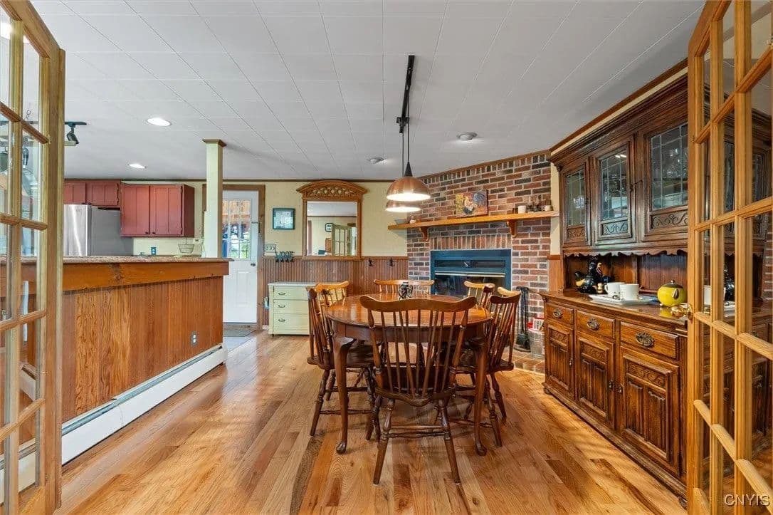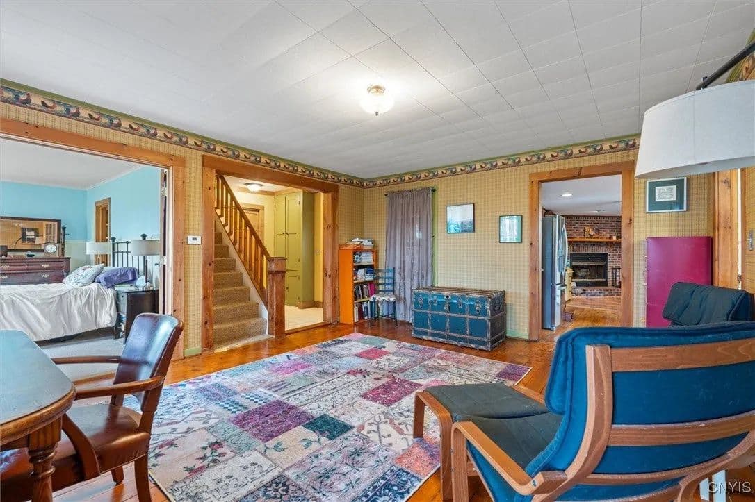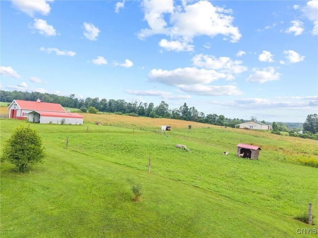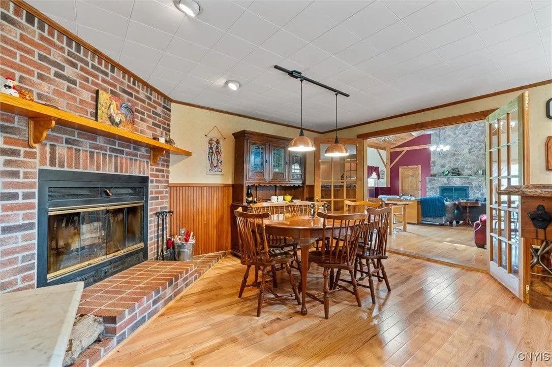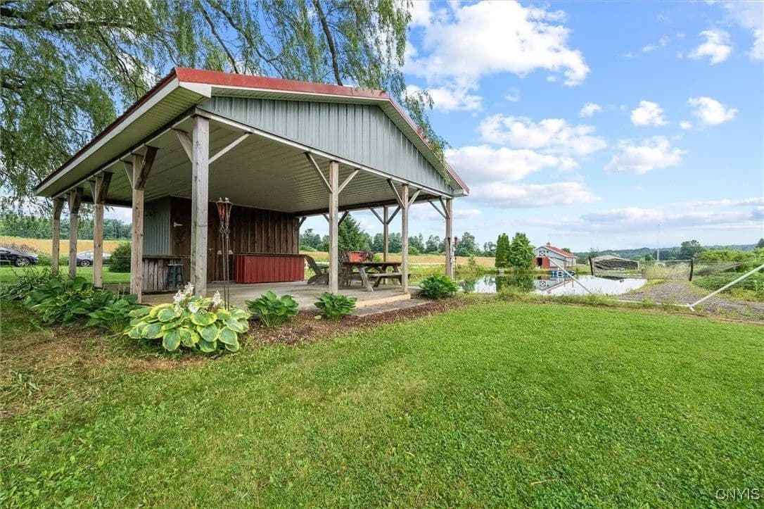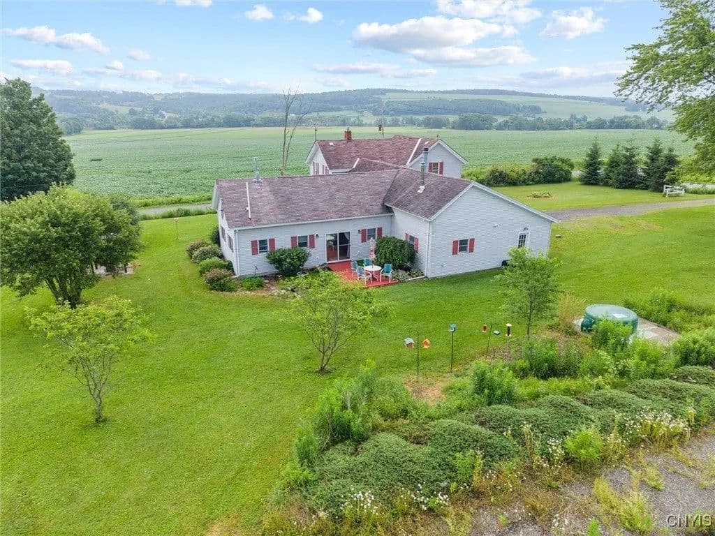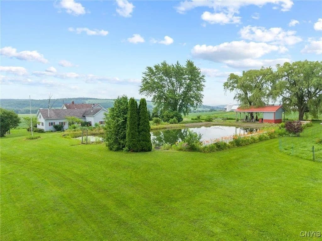 This beautifully expanded farmhouse offers 3,142 square feet of living space on 12 level acres. Originally constructed in the mid-1800s, the home blends historic character with thoughtful modern updates. The country kitchen features stainless steel appliances & original hardwood floors. The beautiful hardwoods continue to the front room; on one side, tucked behind French doors, is the primary suite. This spacious retreat includes a walk-in closet & a cozy propane fireplace. On the other side are a full bath and separate laundry room, creating a comfortable and functional private wing. A formal dining room boasts a wood-burning fireplace and newly installed hardwood floors (2021), perfect for cozy gatherings. The heart of the home is a 19’ by 25’ great room with vaulted ceilings and a stunning floor-to-ceiling stone propane fireplace. An additional full bath and private office flank the great room. Upstairs, you’ll find two additional spacious bedrooms, another walk-in closet, a full bathroom, and access to a walk-in attic Farmette ready features abound. A 40’ by 30’ Morton barn includes electric, water, & stalls with antique doors salvaged from the NYS Fairgrounds. Over two acres of fenced pasture include two livestock run-ins. There’s also a chicken coop, garden shed, and metal carport. A picturesque pond includes a floating dock, pavilion, fountain, and aerator. Systems and utilities have been updated for efficiency and reliability. 200 amp electrical service w. whole-house surge protection, and separate panel wired and ready for a whole-house generator (generator not included). A high-efficiency pellet boiler installed in 2019 w a 3.5-ton bulk hopper, thermal storage, stainless chimney liner, and remote monitoring with heating zoned into four areas supported by pellet, wood, & propane options. A tankless propane hot water system was added in 2019, and both the house well pressure tank and pond well pump were replaced in 2023. Fiber optic internet is available. This move-in ready farmette offers history, comfort, and room to grow—all within a peaceful and practical setting. Also listed as single family S1621453