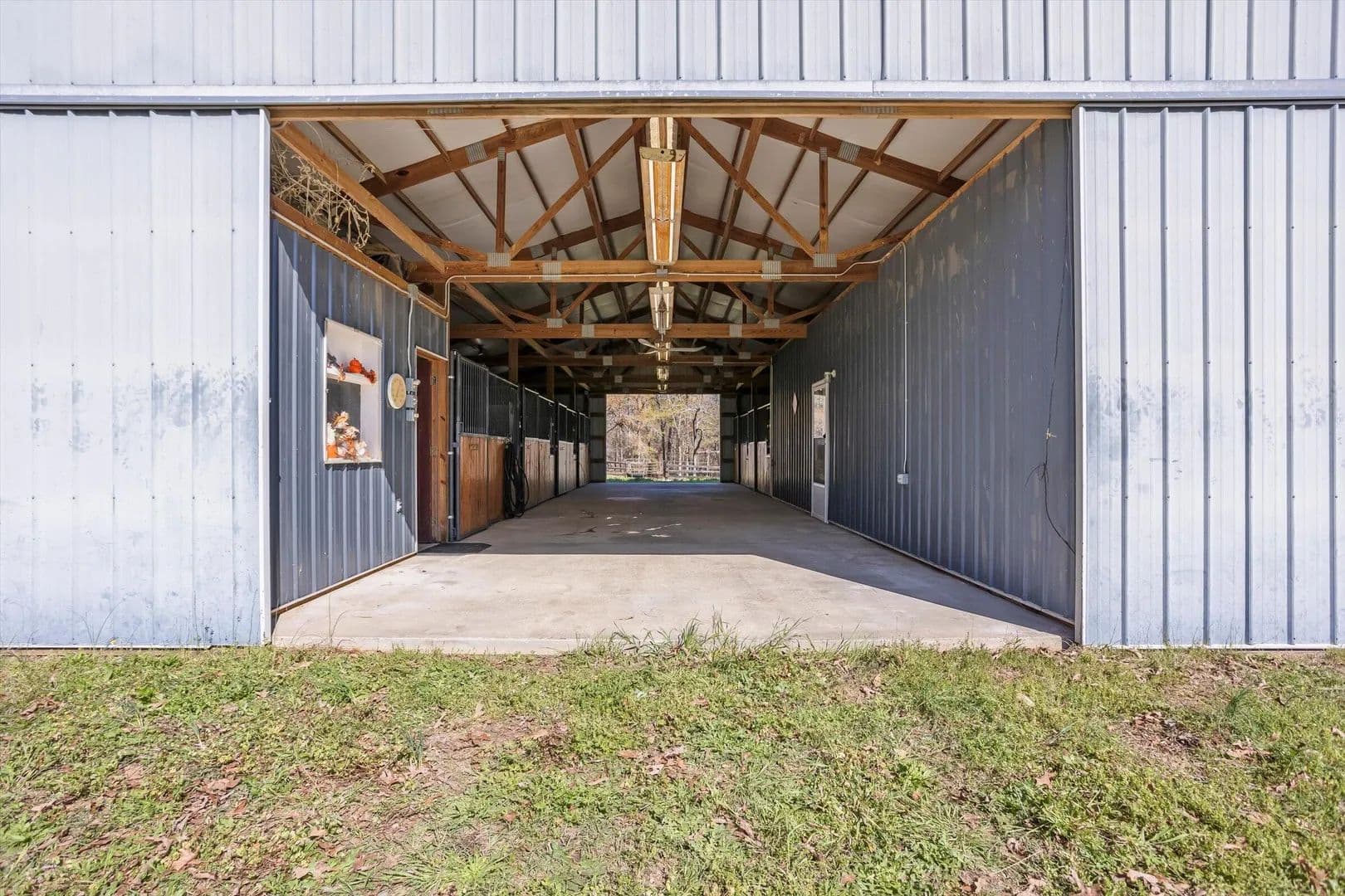 The Barn - The 6-stall center aisle horse barn has 12x12 Horseman's Choice stalls with sliding doors & pull-out feeders, 15'7'' wide concrete aisle, large tack room lounge with sink and a hay/equipment overhang to the side. Grassy pastures have shade trees and can be viewed from the home. This is a perfect set-up for a hobby farm and horseback riding.