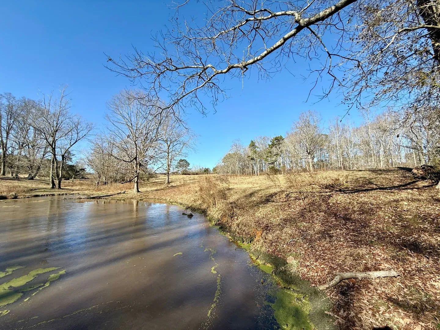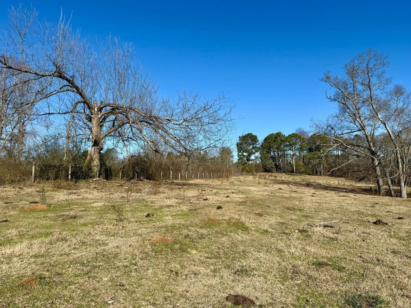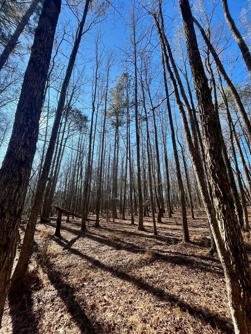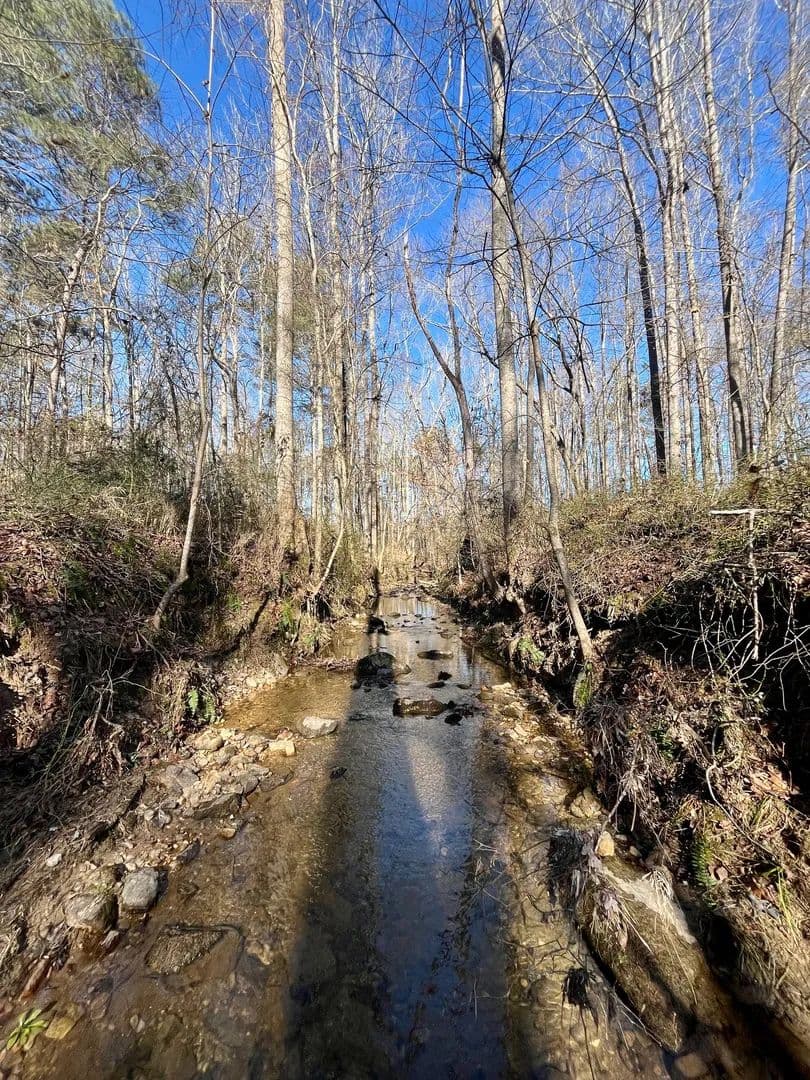 A large portion of the tract is open pasture, making it ideal for livestock, horses, or open space surrounding a future home. The remaining acreage is primarily wooded, featuring a strong stand of mature hardwoods with scattered heart pine, providing privacy, shade, and natural character. A larger spring-fed pond adds scenic appeal and a reliable water source, while Maple Branch, a well-defined creek, flows along the backside of the property.