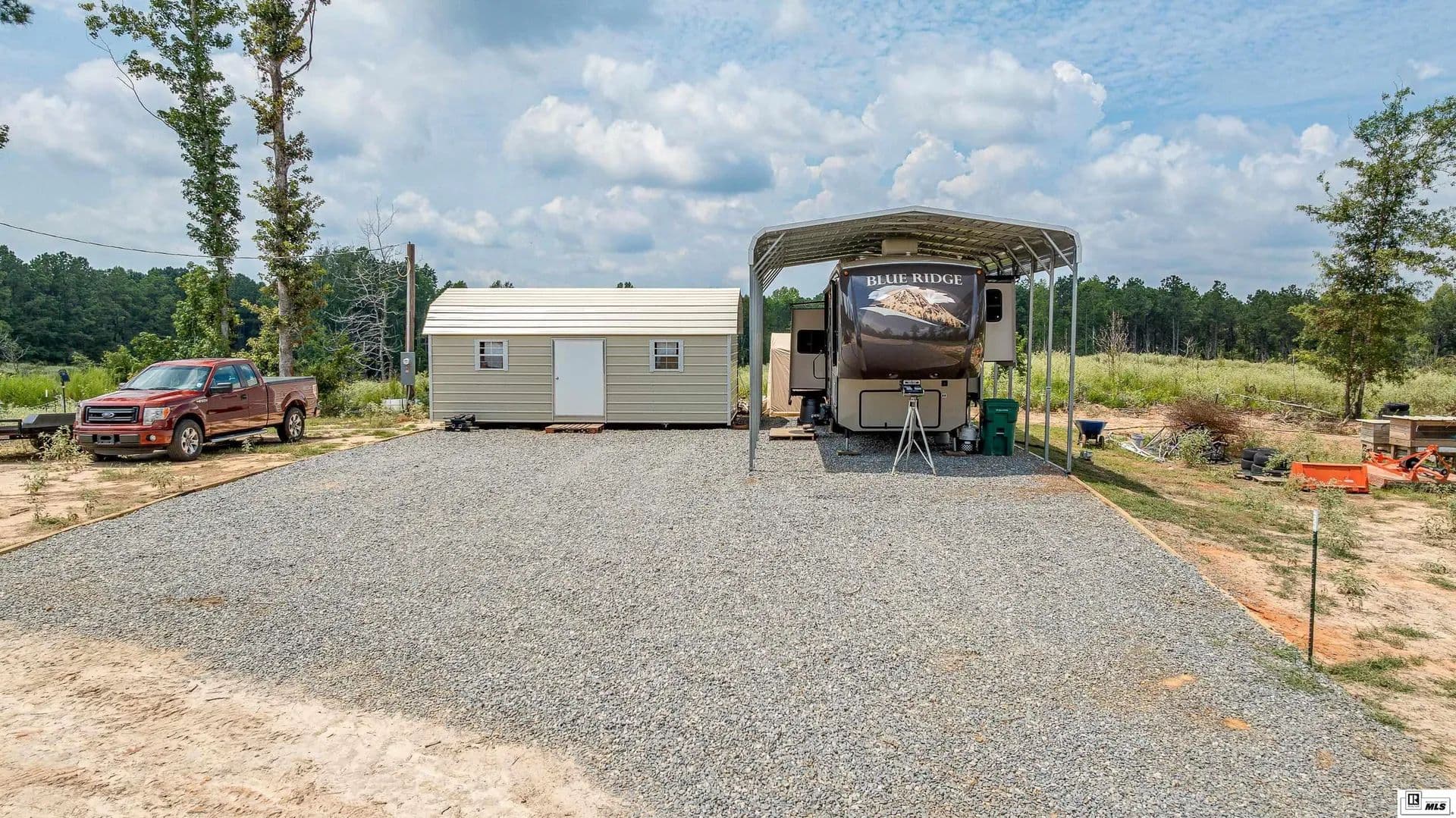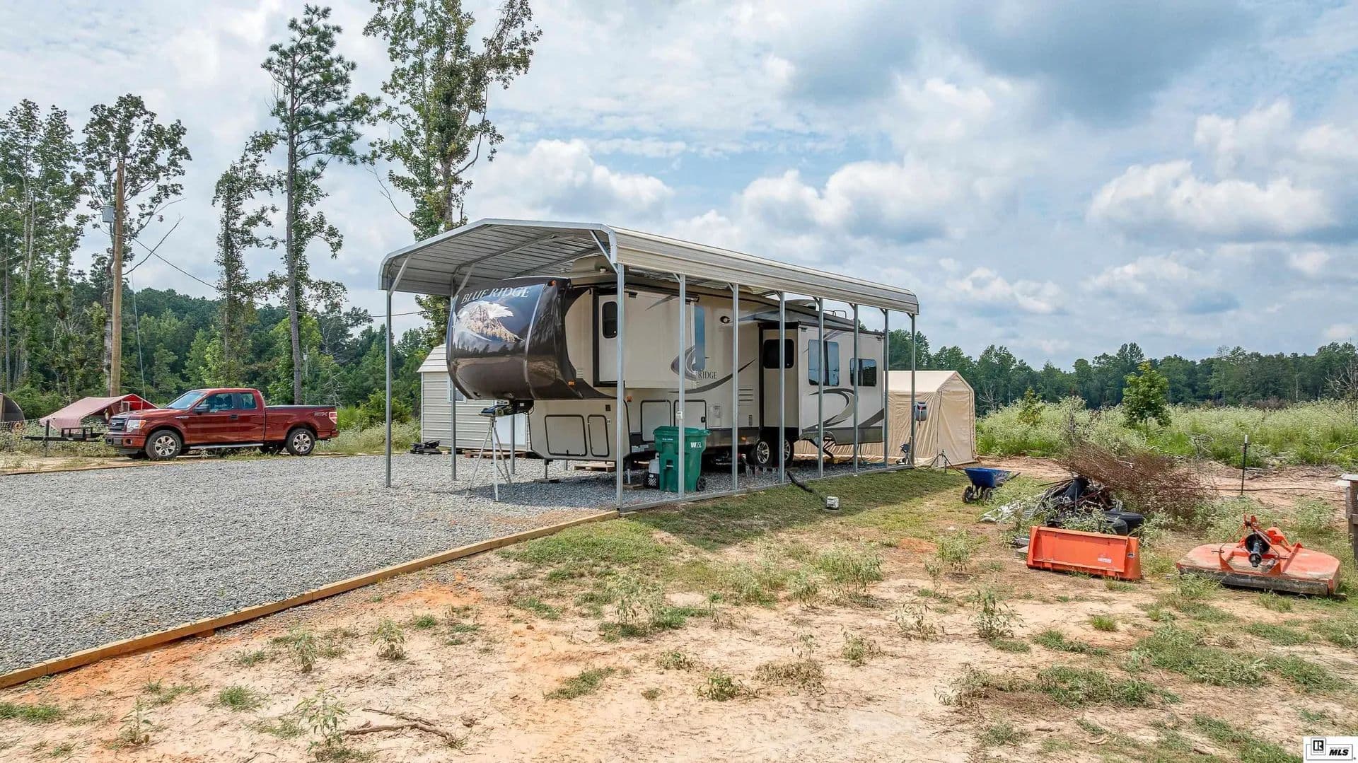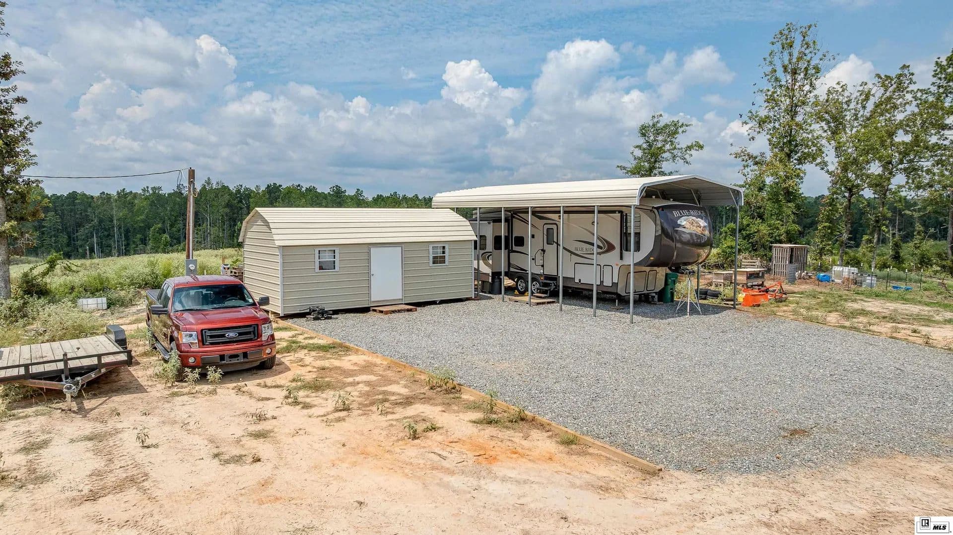 Spacious 10-acre unrestricted tract offering the perfect blend of privacy and convenience. Semi-cleared with a gravel drive leading to a prepared House Pad (80 x80) complete with a Certified Compaction Certificate. Utilities are already in place at the homesite, including water, electricity, and septic system. Additional improvements include a storage shed (12 X 24) with Heat and A/C, and RV cover (18 X 36), making this property ready for your dream home! Additional - 2013 Forest River Blue Ridge 5 wheel available, 3125 Cabin Edition (2 New A/C's, New Refrigerator, New Tires, New Battery) $25,000 Pictures available upon request