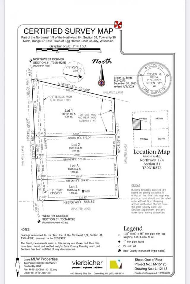 Just under 2 acres of beautiful prime Door County real estate that is walking distance (within a mile) to downtown Egg Harbor. Property is meadow-like in the front and nicely wooded in the back. Lot 3 slopes down slightly and could possible accommodate a walk out lower level. Per seller underground power will be installed mid way on side lot line. Tax ID number is for original 10 acre parcel that will be subdivided into 4 lots, please see survey. Covenants & Restrictions apply.