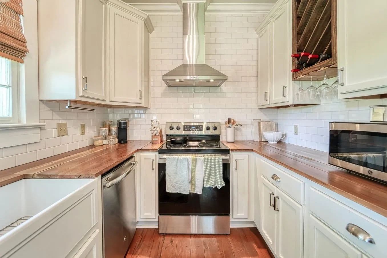 You can hear the sounds of Cypress Creek rushing by as you step onto the outdoor kitchen. Completed in 2022, this space was designed for entertaining—with two TVs, ceiling fans, a sink, fridge, and ice maker. Whether you're grilling, hosting a party, or just spending time with family, it's a crowd favorite. The current owners host an annual dove hunt and gather here for BBQ, football, and fellowship. Additional structures include an elevated wooden hay barn and a cinderblock potato barn used for storing ATVs and equipment.