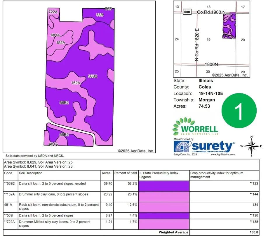 Tract 1 is 77.00 taxable acres in Morgan Township, 97% tillable, made up of predominantly Dana and Drummer soils to give an average Productivity Index Rating of 130.8. Tract 2 (PENDING) is 27.28 taxable acres that are 98% tillable in Seven Hickory Township with an average Productivity Index Rating of 131.5. Directly across the road from Tract 2, is 120.00 taxable acres that will be offered as Tract 3. This tract has an average Productivity Index Rating of 136.4.