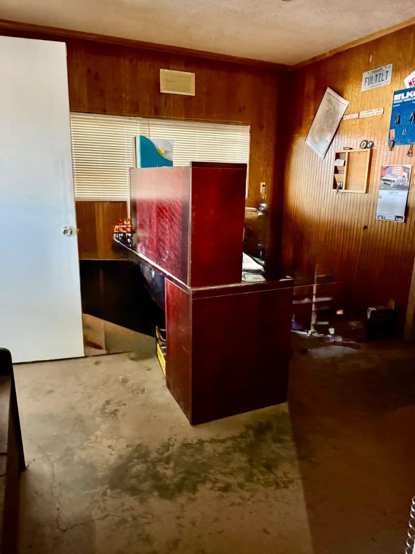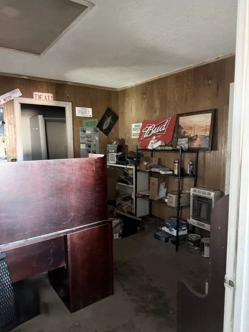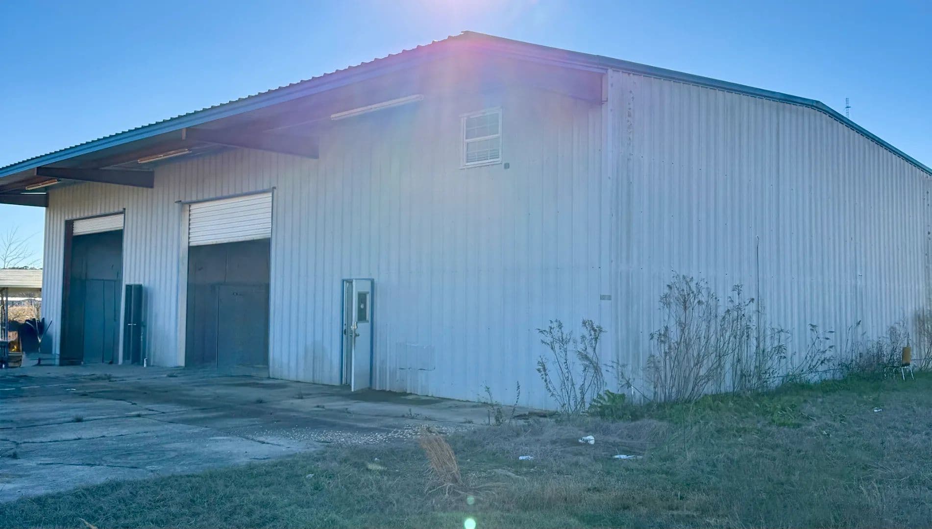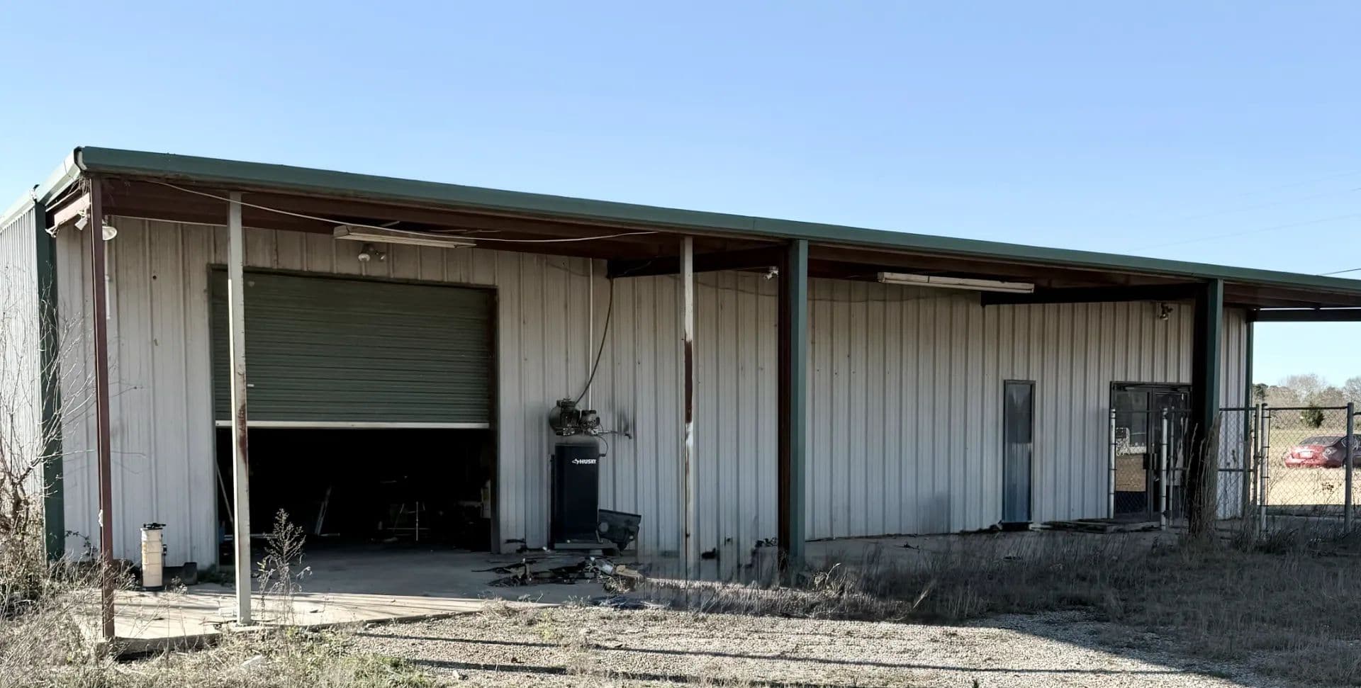 The second building contains 1,827 square feet and includes a single-bay work area with roll-up door, a reception area with front desk and lobby, a large half bathroom, a private office or storage room, and a spacious interior work area connected to the front desk with a 12 ft canopy on the front of the building. This building is equipped with 100-amp single-phase electrical service, a 5-ton A/C package unit with gas heat, and is serviced by an on-site water well.