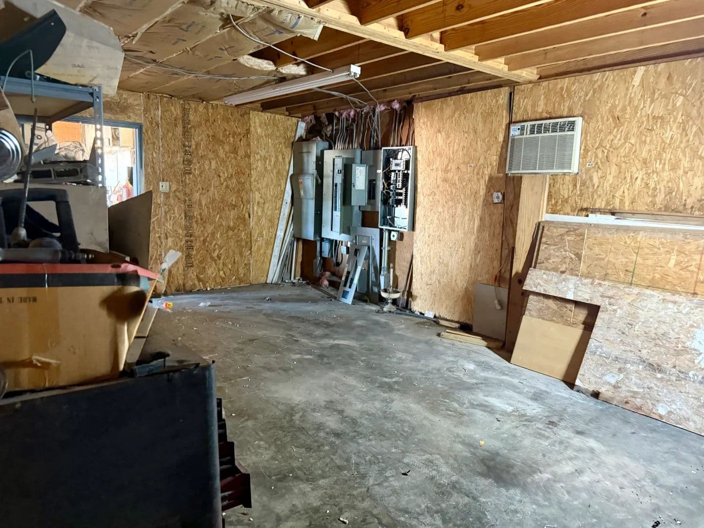 Electrical service includes 400-amp 3-phase power plus single-phase panels, an 8-ton 3-phase A/C package unit, and a gas forced-air hanging heater servicing the shop area.