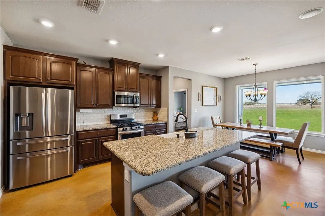 23 acres of usable ground, wide horizons, and the freedom to live without compromise. Built in 2021, the home brings modern comfort to a setting that’s ideal for hunting, livestock, or simply enjoying space and privacy. Seller owned mineral rights convey, perimeter fencing is in place, and the land offers a balanced mix of open pasture and wooded cover. Life here naturally spills outdoors. The covered back patio—equipped with fans, lighting, and speakers—overlooks your acreage and becomes the go-to spot for evenings after long days outside. A 30’ x 20’ metal workshop with tall ceilings, concrete slab, and roll-up door gives you the flexibility to store equipment, work on projects, or expand your setup over time. Infrastructure is already handled with 3-phase power available, an oversized paved drive, insulated well house, owned water treatment system, and buried propane tank. Inside, the home feels solid, open, and easy to live in. Vaulted beamed ceilings, large windows, and stained concrete floors create a durable, low-maintenance interior. The split layout includes a dedicated office and generous bedrooms, while the kitchen is built for real use with a large granite island, 6-burner gas range, walk-in pantry, coffee bar, and direct access to the patio. The owner’s suite offers a comfortable retreat with abundant light and lavish en suite. This isn’t just land with a house on it—it’s a well-thought-out country setup, ready to work, relax, and grow with you.