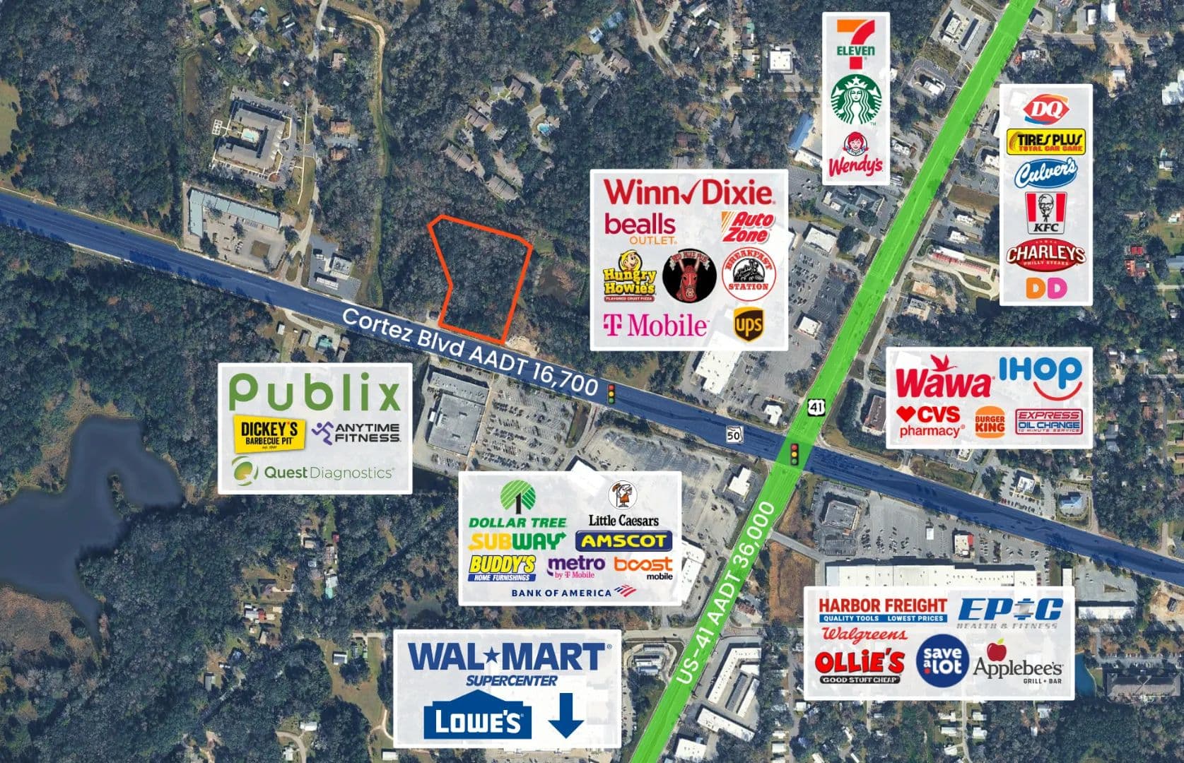 Exceptional opportunity to acquire 3.82± acres of commercial land with approximately 300 feet of frontage along Cortez Blvd, one of Brooksville’s busiest commercial corridors. The property is positioned directly across from a Publix-anchored shopping plaza and is just west of the signalized intersection at Cortez Blvd and US-41 (Broad Street), offering excellent visibility, access, and exposure.