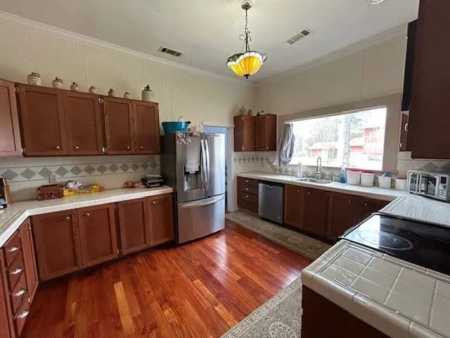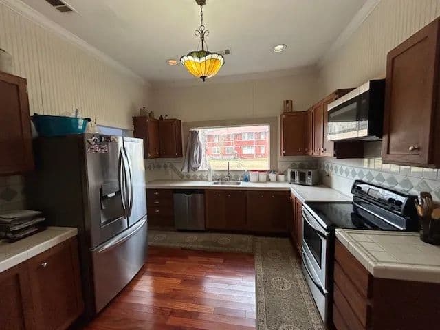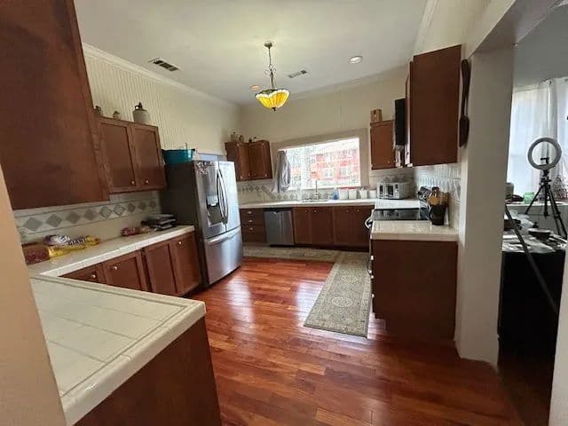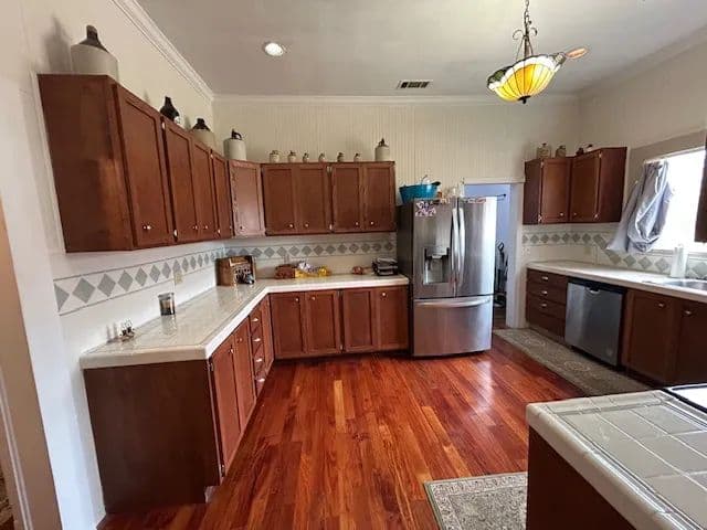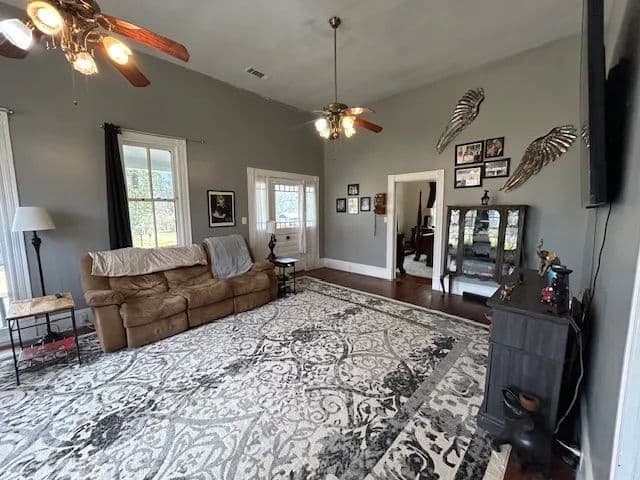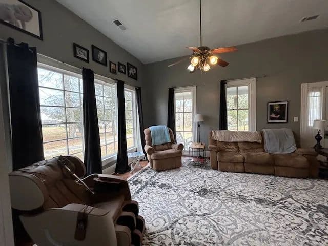 Inside, you’ll find 3 spacious bedrooms and 2 full baths, complemented by soaring 10-foot ceilings, classic wood floors, and smooth sheetrock walls. The large den provides the perfect gathering space, while the spacious kitchen features abundant cabinetry and generous counter space—ideal for everyday living and entertaining. A formal dining room adds to the home’s traditional appeal.
