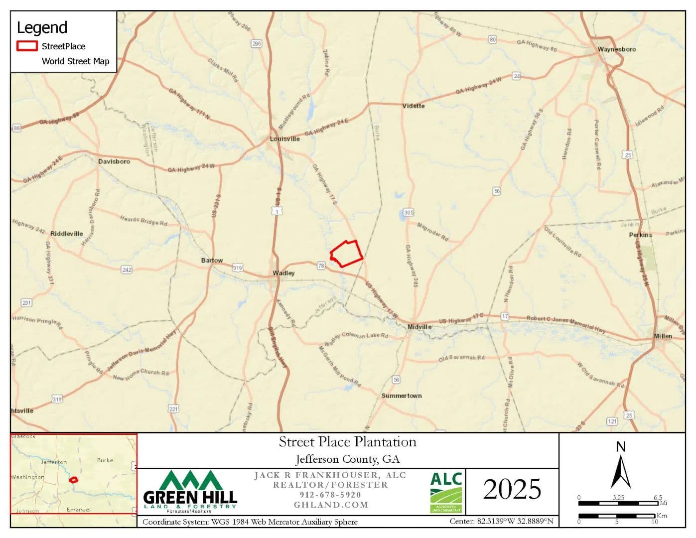 The property is roughly rectangular in shape and has over 4,000 feet of frontage on Highway 17, with overhead power along the entire length. It’s just a short drive to the amenities of Wadley or Louisville and is surrounded by large landowners on all sides.