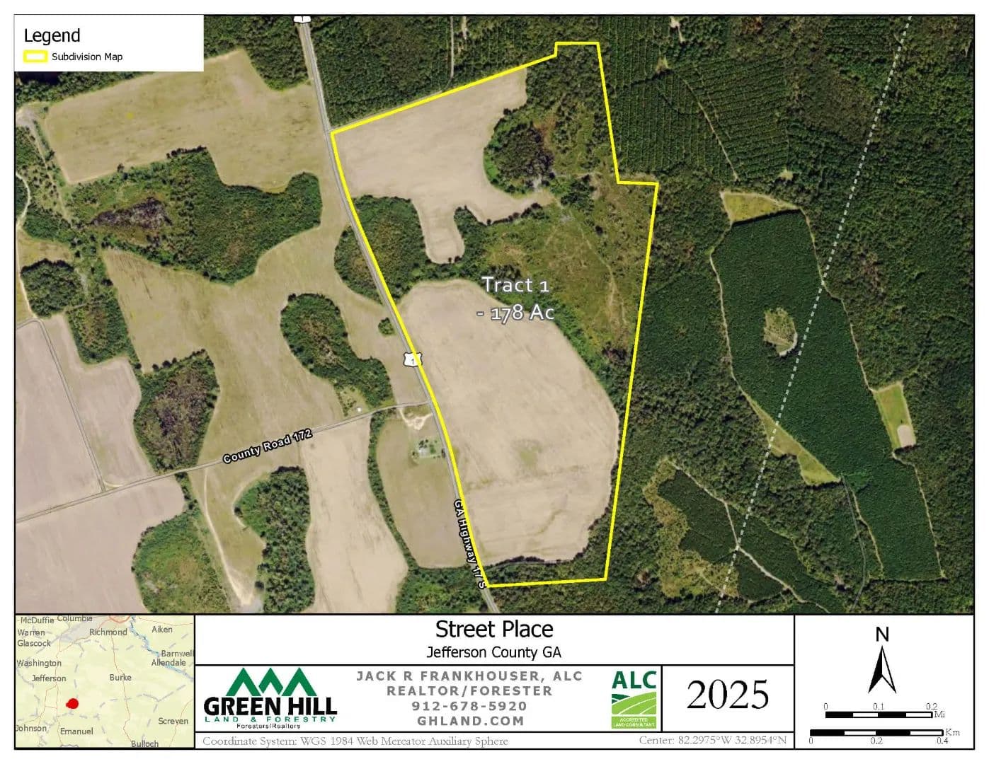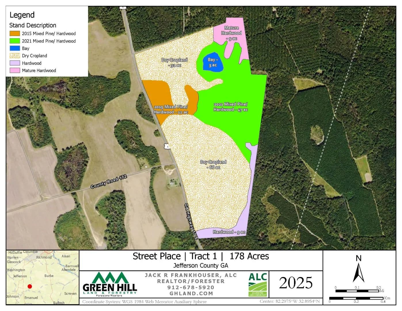 Tract 1 of Street Place Plantation is a 178-acre tract made up of agricultural fields, mixed pine and hardwood timber, and a small 3-acre bay. There are 98 acres of dry cropland currently in row crop production, with the remaining 80 acres in young mixed pine and hardwood. Mature oaks surround the fields, while the interior consists of younger pine and hardwood, providing excellent bedding and browse for deer.