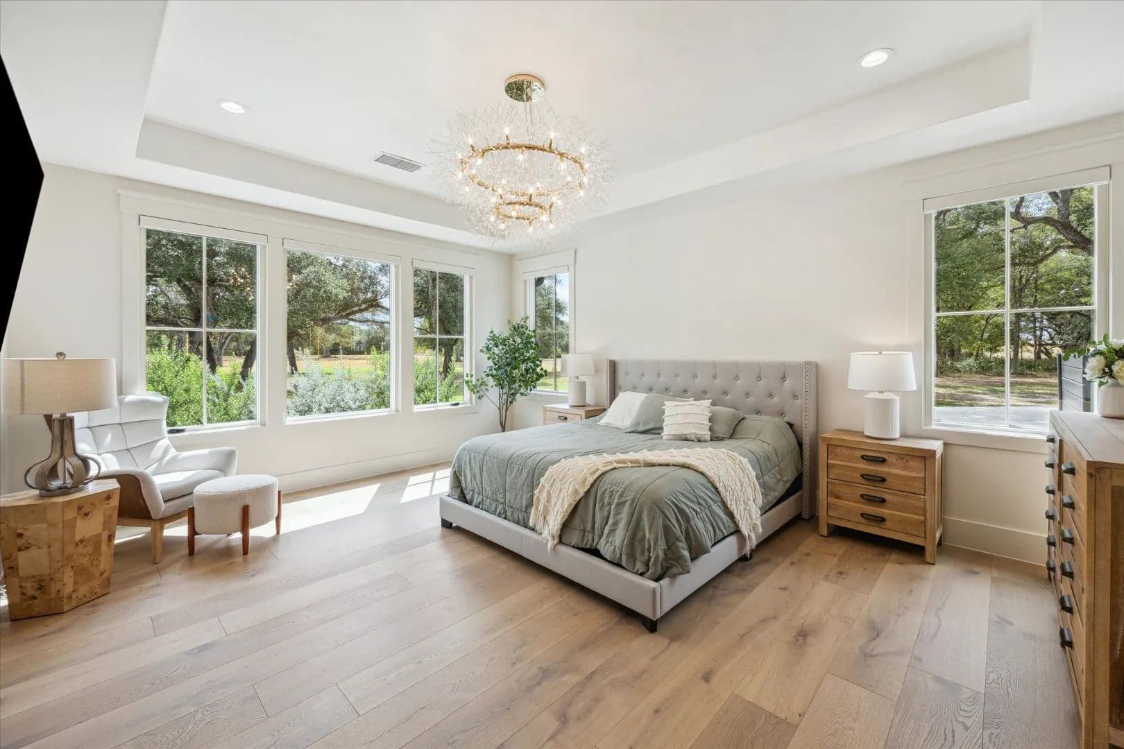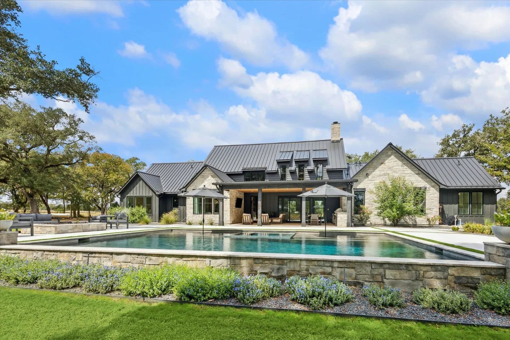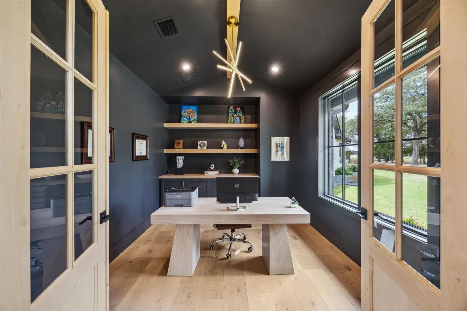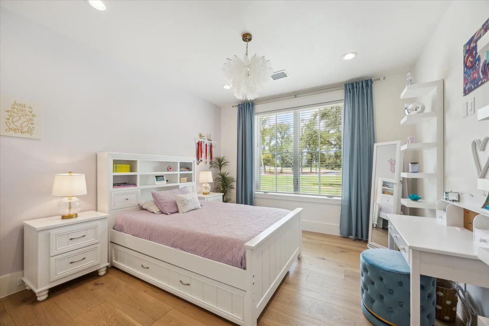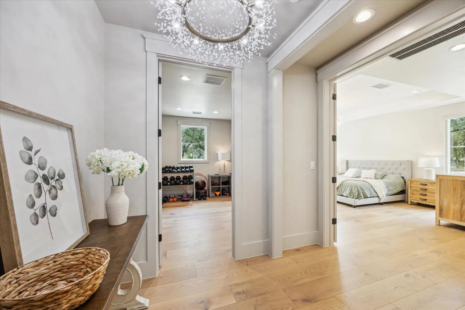 The custom 5-bedroom home was meticulously designed and built with family and entertaining in mind. As you step through the front door, you’re greeted by a massive living room, dining room, and kitchen, molding into a bright, open-concept area. To your right, a private office provides a quiet retreat for work or study. Vaulted ceilings above the connected kitchen, dining, and living areas, and large windows flood the home with natural light and long shadows, bringing the beauty of the surrounding landscapes inside. A breakfast room off the kitchen offers beautiful views of the pool, backyard, and pond. The gourmet kitchen features a full range, a walk-in pantry discreetly hidden behind faux cabinet doors, a massive island, and endless cabinet space. Just past the kitchen, a convenient half bath, laundry room, and an expansive mud room lead directly to the sheetrocked and well-lit garage. A versatile converted workout room offers flexibility as an additional office or customizable space to suit your needs. The master suite, tucked away at the rear of the home, creates privacy with its own foyer and views of the pool and backyard. The master bath has his-and-hers sinks positioned opposite each other and is complemented by an extra-large shower and soaking tub. The family room, accessible from the living area, is designed for comfort and entertainment, featuring an oversized sectional, TV, and well thought out shelves and cabinets for books and board games. Hookups for a secondary laundry with a stackable set are thoughtfully included on this side of the house. Two large bedrooms with front yard views share a full bath off the family room, while two additional bedrooms are connected by a full Jack-and-Jill bath, perfect for family or guests. Wide-panel wood flooring flows seamlessly throughout the home, creating a warm, cohesive feel that ties the whole home together.
