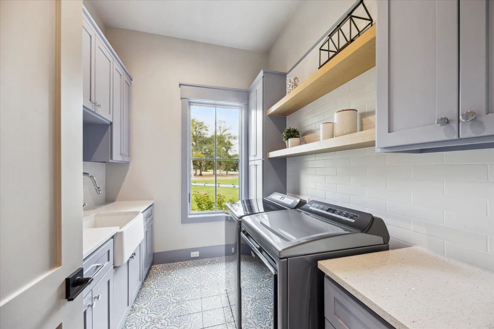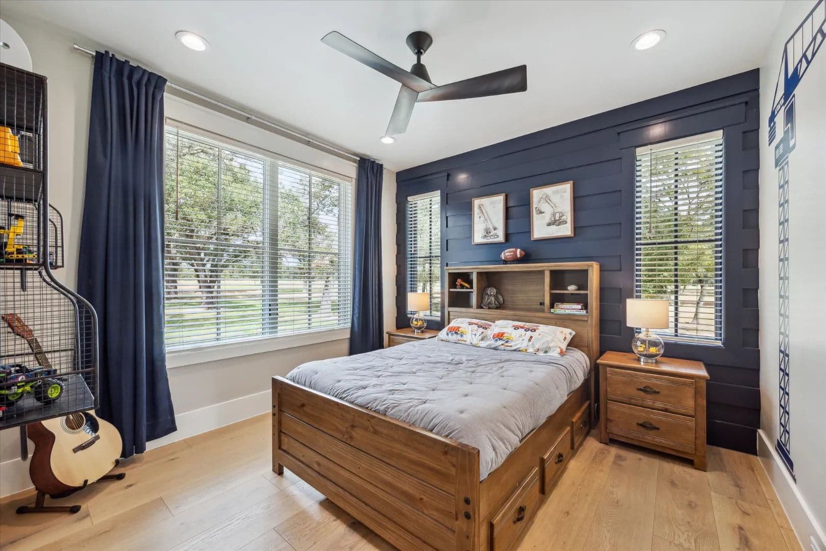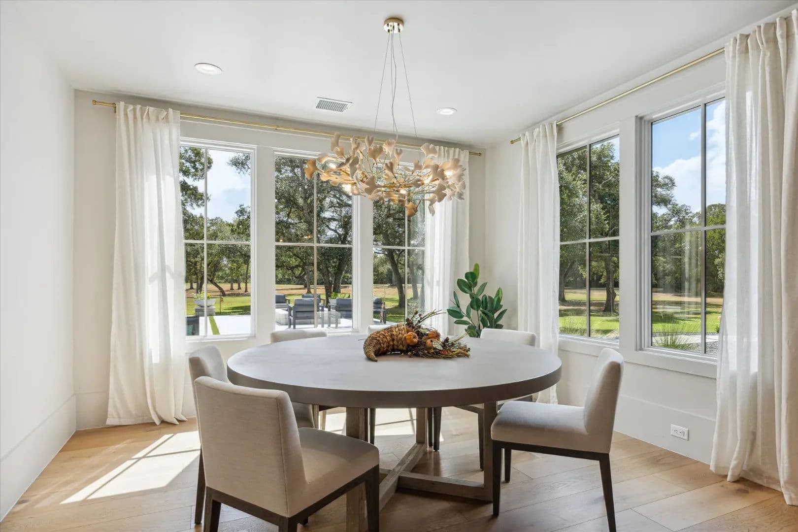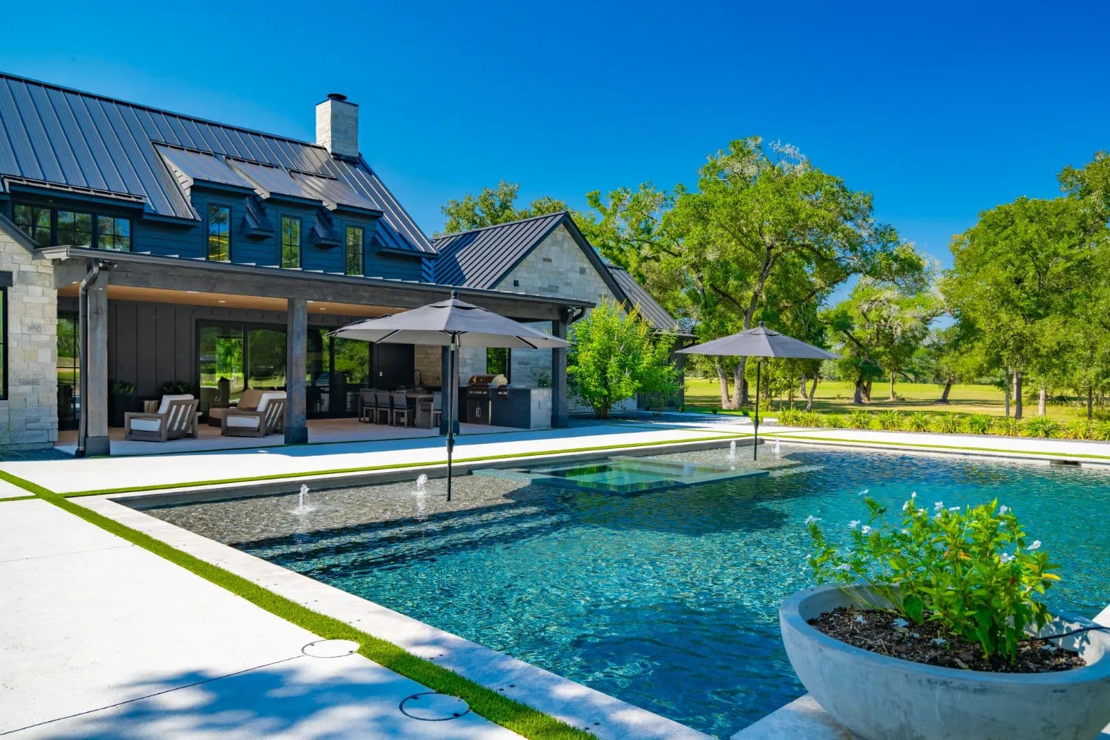 The custom 5-bedroom home was meticulously designed and built with family and entertaining in mind. As you step through the front door, you’re greeted by a massive living room, dining room, and kitchen, molding into a bright, open-concept area. To your right, a private office provides a quiet retreat for work or study. Vaulted ceilings above the connected kitchen, dining, and living areas, and large windows flood the home with natural light and long shadows, bringing the beauty of the surrounding landscapes inside. A breakfast room off the kitchen offers beautiful views of the pool, backyard, and pond. The gourmet kitchen features a full range, a walk-in pantry discreetly hidden behind faux cabinet doors, a massive island, and endless cabinet space. Just past the kitchen, a convenient half bath, laundry room, and an expansive mud room lead directly to the sheetrocked and well-lit garage. A versatile converted workout room offers flexibility as an additional office or customizable space to suit your needs. The master suite, tucked away at the rear of the home, creates privacy with its own foyer and views of the pool and backyard. The master bath has his-and-hers sinks positioned opposite each other and is complemented by an extra-large shower and soaking tub. The family room, accessible from the living area, is designed for comfort and entertainment, featuring an oversized sectional, TV, and well thought out shelves and cabinets for books and board games. Hookups for a secondary laundry with a stackable set are thoughtfully included on this side of the house. Two large bedrooms with front yard views share a full bath off the family room, while two additional bedrooms are connected by a full Jack-and-Jill bath, perfect for family or guests. Wide-panel wood flooring flows seamlessly throughout the home, creating a warm, cohesive feel that ties the whole home together.