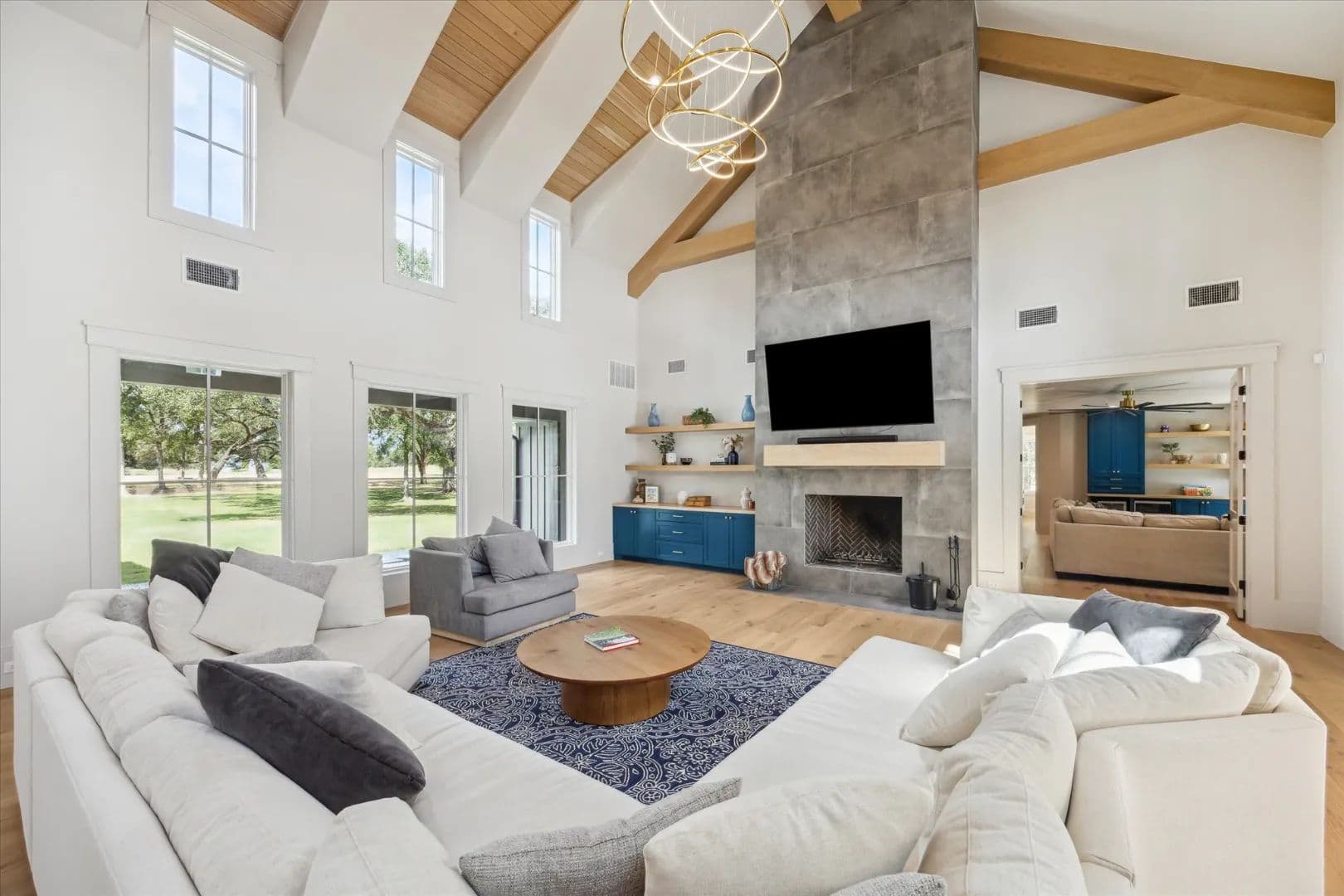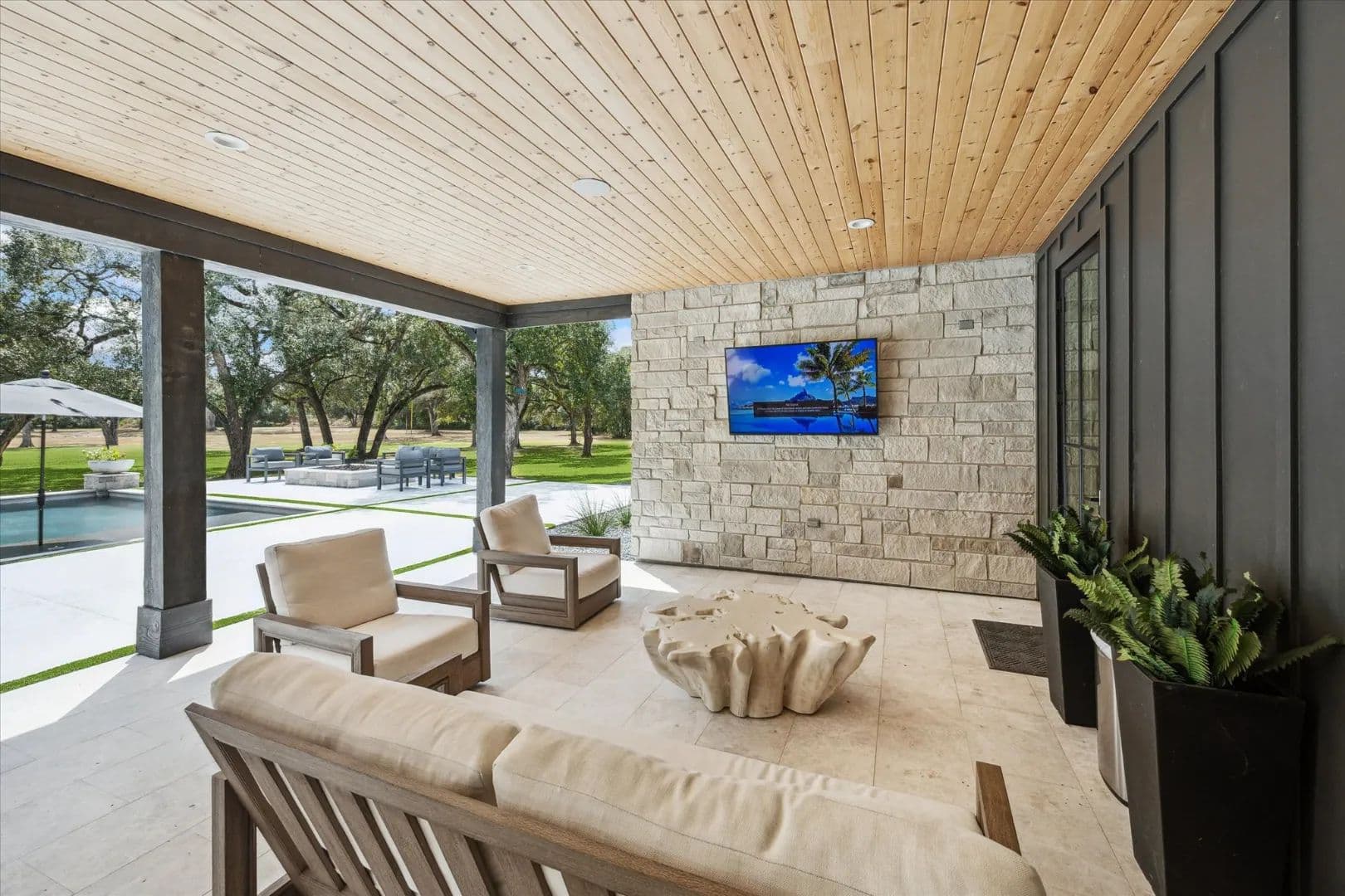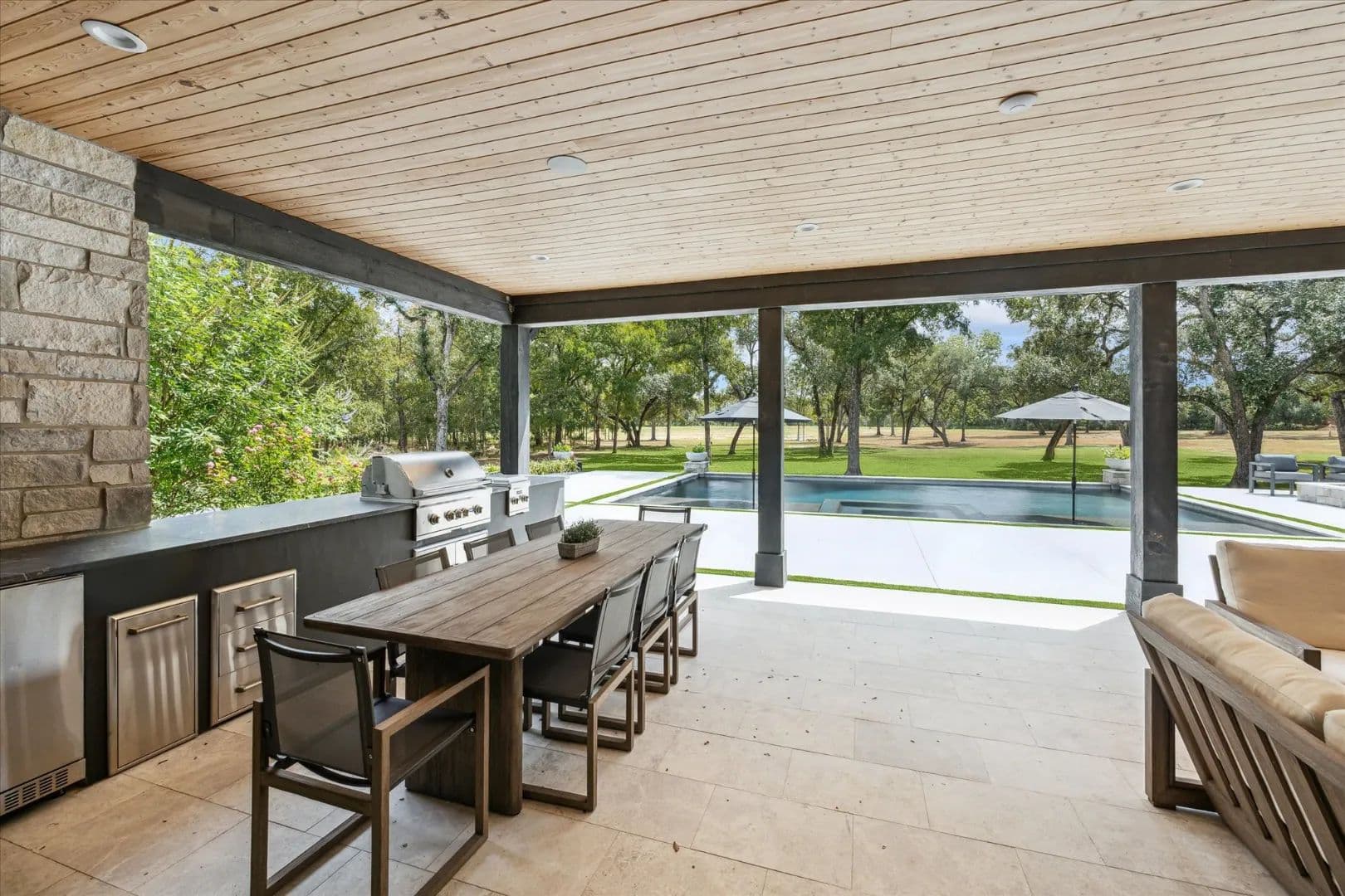 Sliding glass doors from the living area open onto a vacation-like patio. The covered outdoor dining area features a large island with a built-in cooktop, large wooden dining table, and comfortable outdoor furniture perfect for kicking back to watch Gutfeld, the Masters, or your favorite college football team. Large stone tiles surround a beautiful, deep blue pool with a hot tub and beach entrance. Beyond the pool, a manicured grove, shaded by trimmed live oaks, extends to an expansive lake, offering a picturesque backdrop that complements the beautiful home and patio.