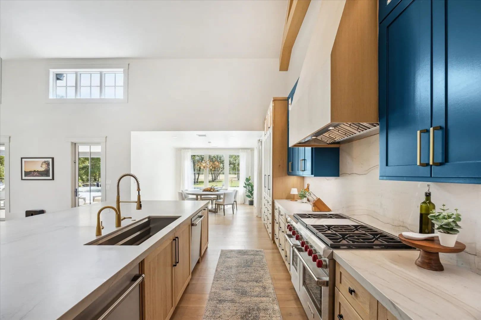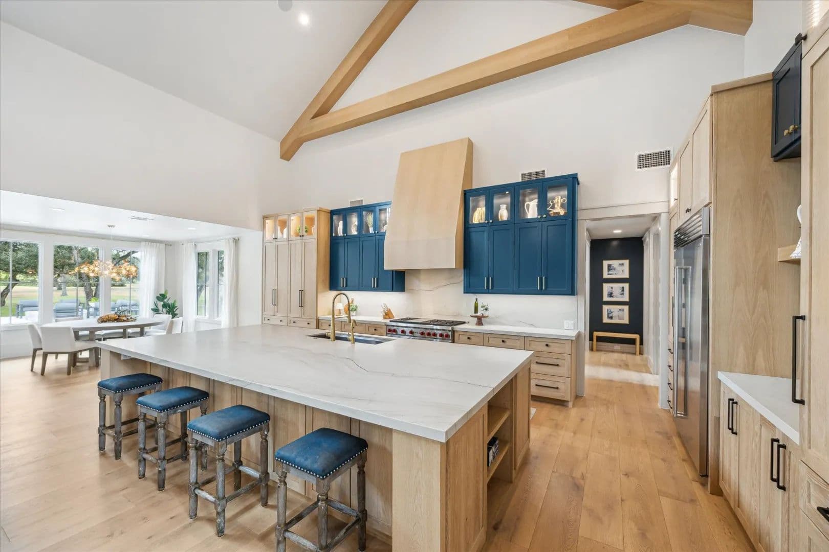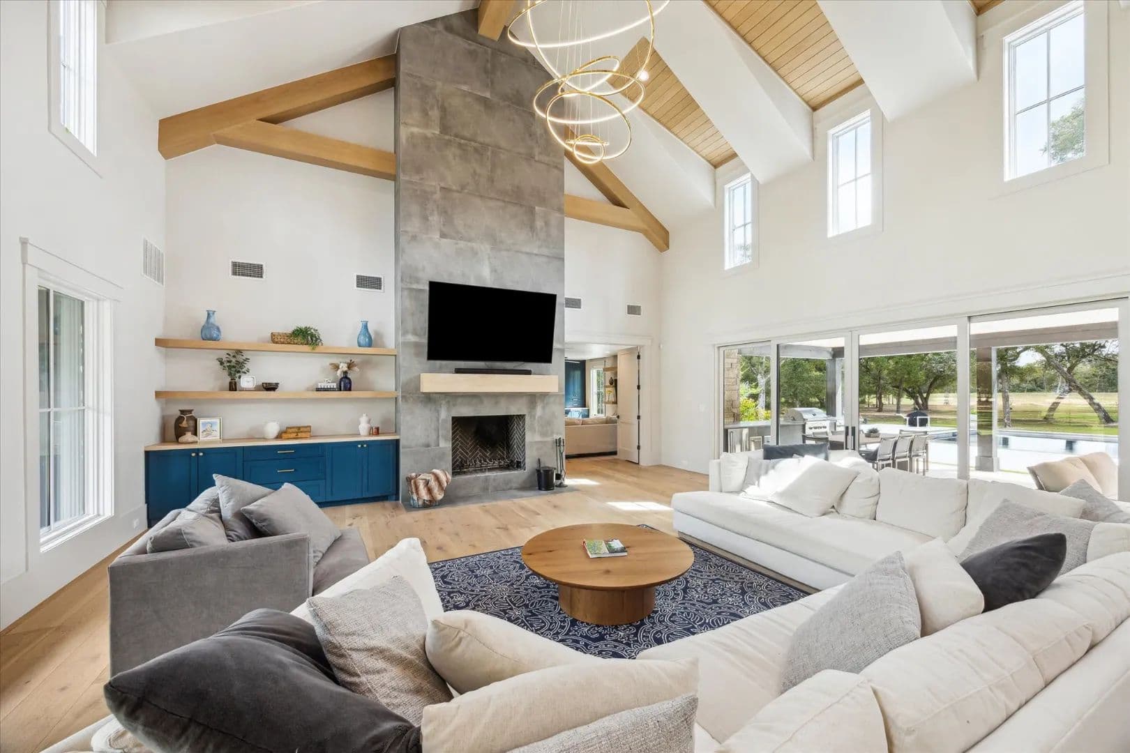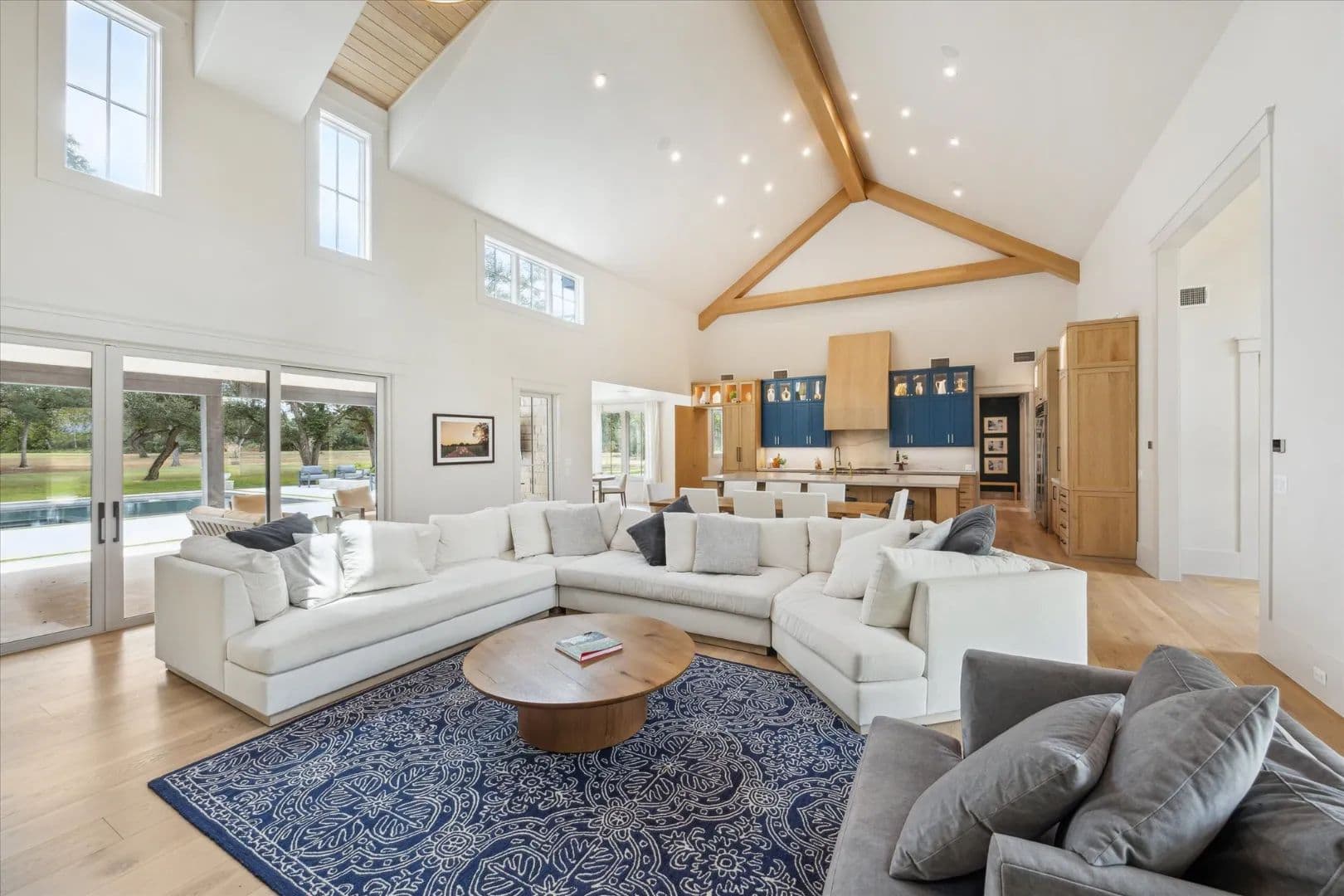 Sliding glass doors from the living area open onto a vacation-like patio. The covered outdoor dining area features a large island with a built-in cooktop, large wooden dining table, and comfortable outdoor furniture perfect for kicking back to watch Gutfeld, the Masters, or your favorite college football team. Large stone tiles surround a beautiful, deep blue pool with a hot tub and beach entrance. Beyond the pool, a manicured grove, shaded by trimmed live oaks, extends to an expansive lake, offering a picturesque backdrop that complements the beautiful home and patio.